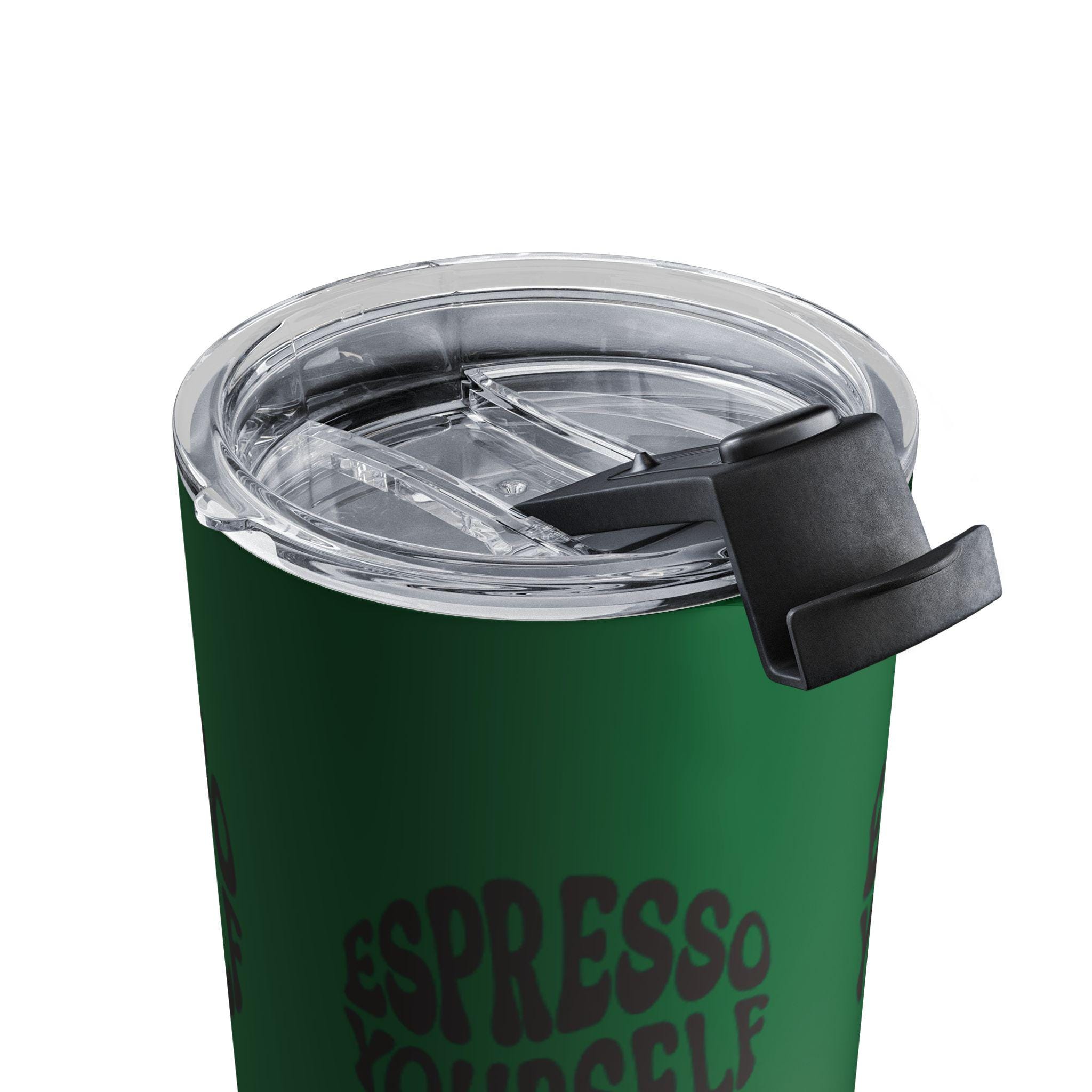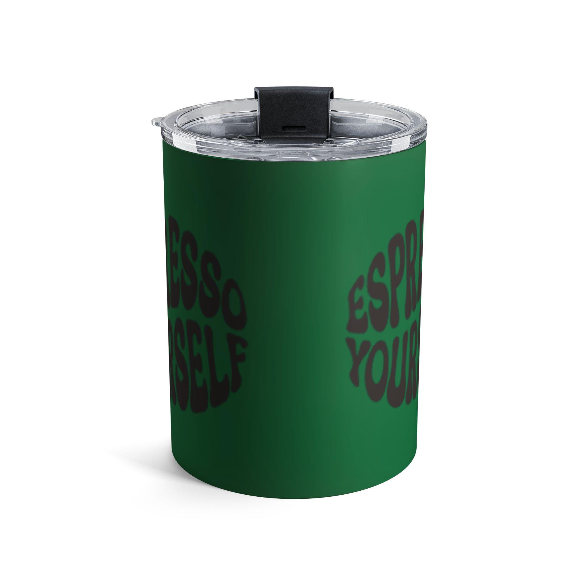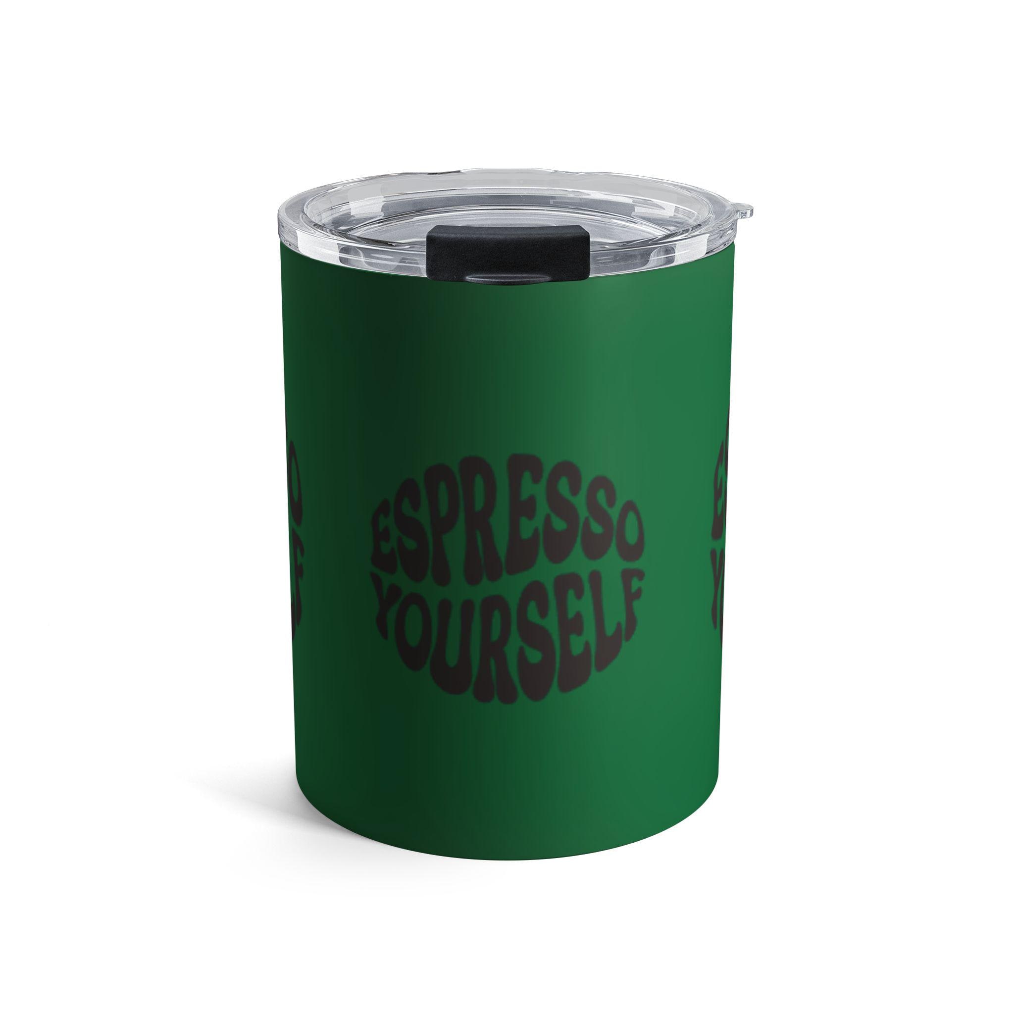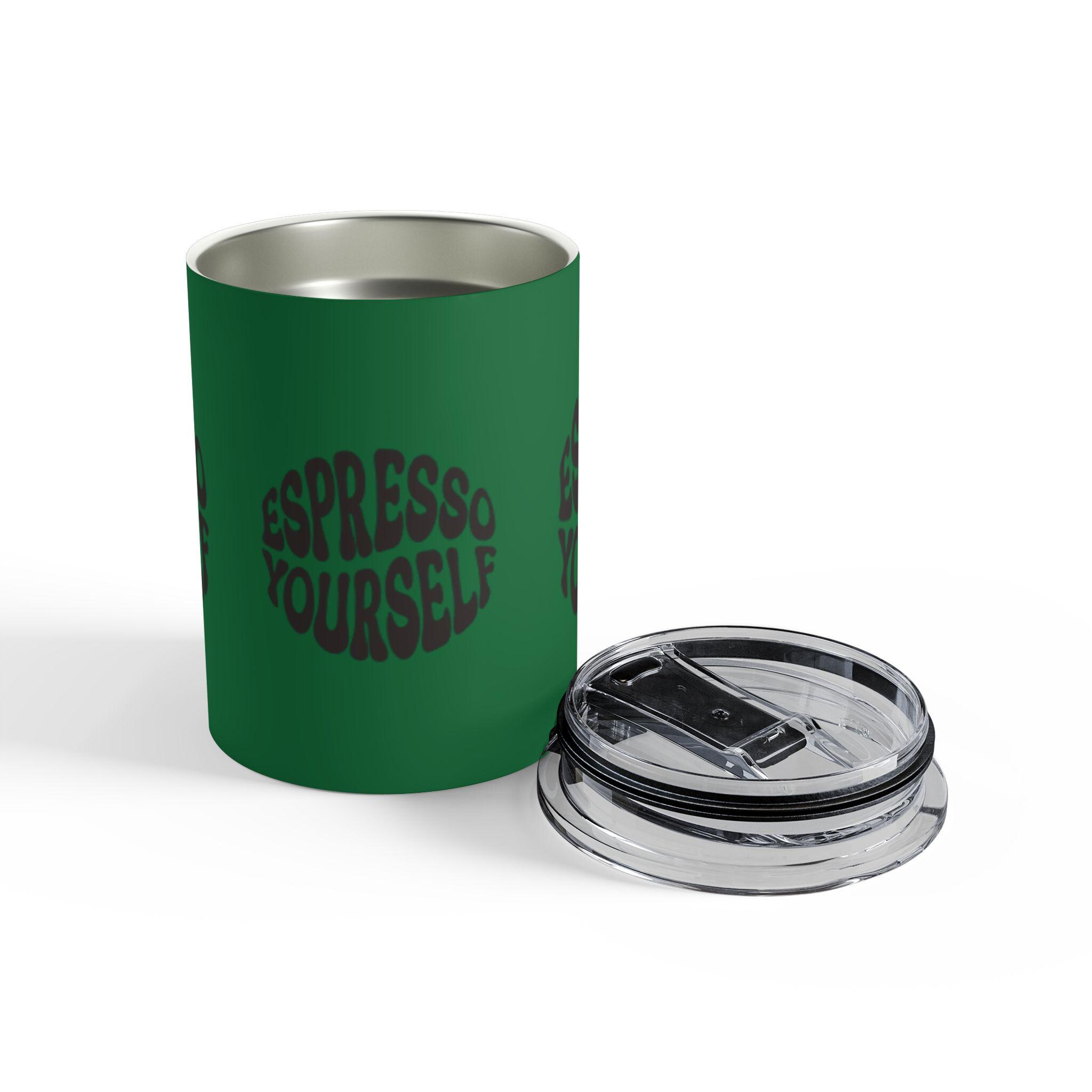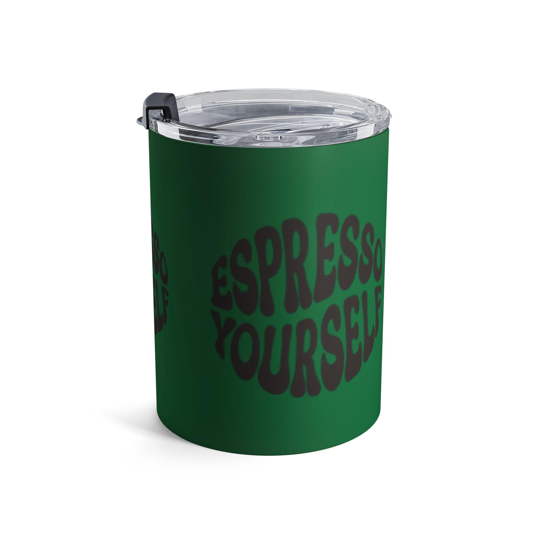 This stylish 10oz tumbler brings a fun vibe to your daily coffee or tea ritual. Perfect for espresso lovers, its design encourages you to "Espresso Yourself" while enjoying your favorite beverages at home or on the go. The tumbler is ideal for busy mornings, cozy evenings, or as a thoughtful gift for coffee enthusiasts. It's a great choice for holidays like Christmas, birthdays, or even just a special treat for yourself. Whether you're at work, on a picnic, or relaxing at home, this tumbler will keep your drinks hot or cold, fitting seamlessly into your lifestyle.