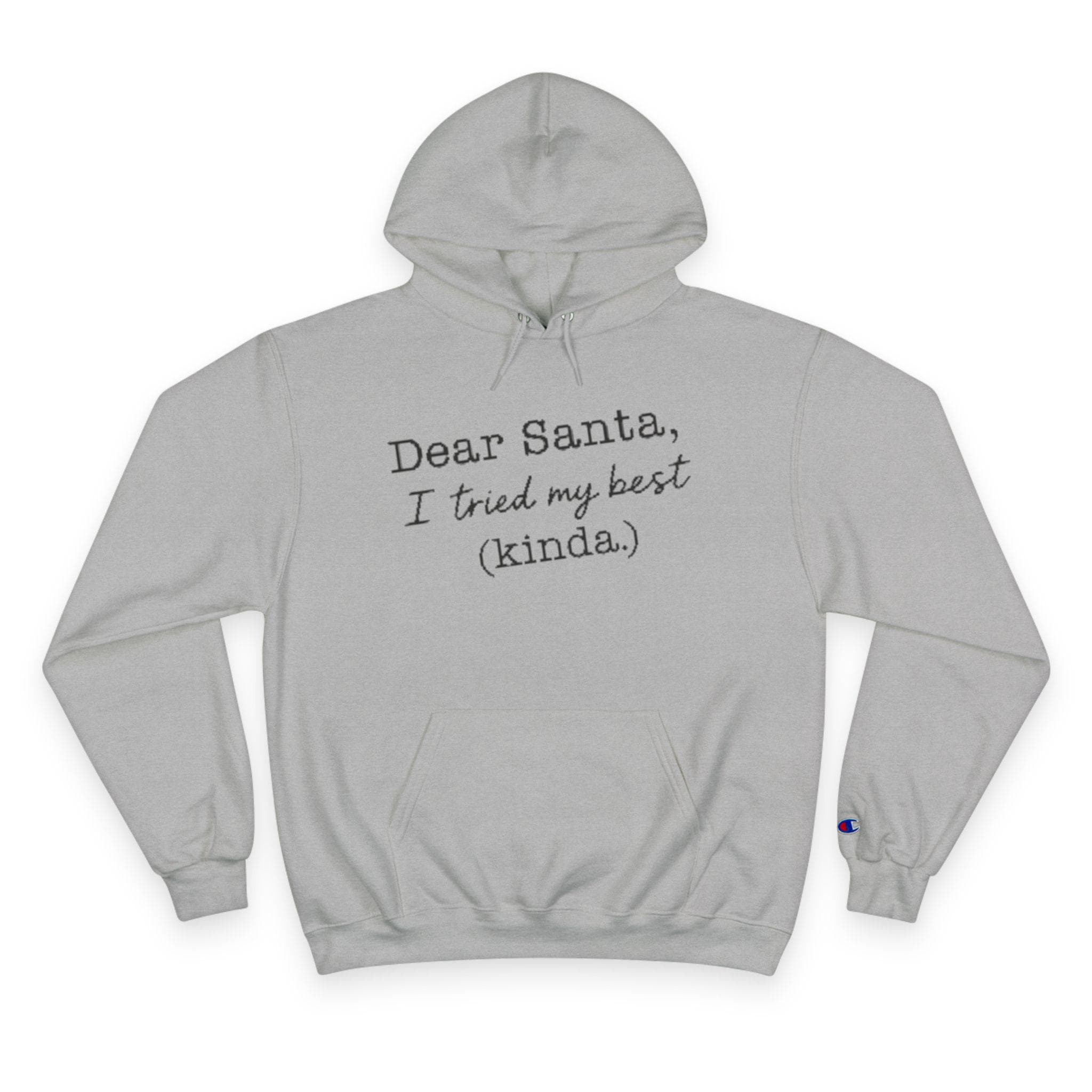 A soft, midweight Champion hoodie in heather grey that carries a quiet, playful holiday message — “Dear Santa, I tried my best (kinda).” It feels lived-in from the first wear: warm enough for brisk walks, roomy enough for layering, and built to last with the brand’s sturdy knit. The laid-back fit and kangaroo pocket make it a go-to for lazy mornings, cozy nights by twinkling lights, or low-key gatherings where comfort wins. Subtle Champion details — the left-sleeve “C” and a sewn-in care label — give it that authentic athletic touch while sustainable fibers (partly from recycled bottles) keep it thoughtful. This hoodie slips easily into a relaxed winter wardrobe and brings a wink of holiday humor without shouting for attention.