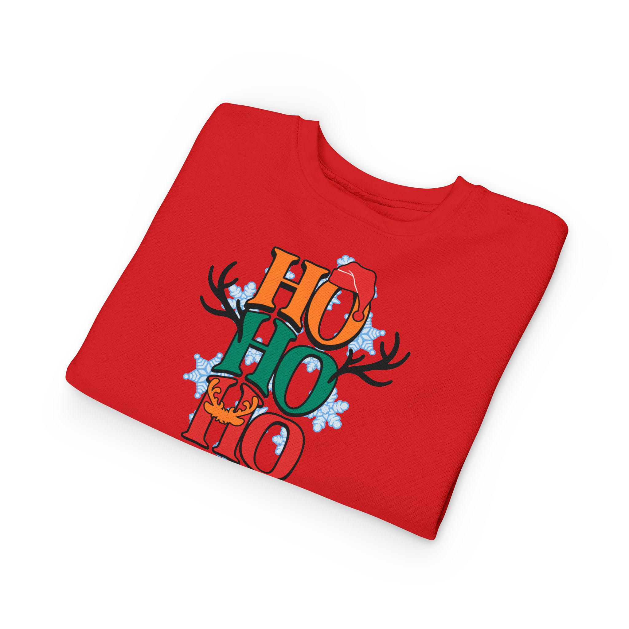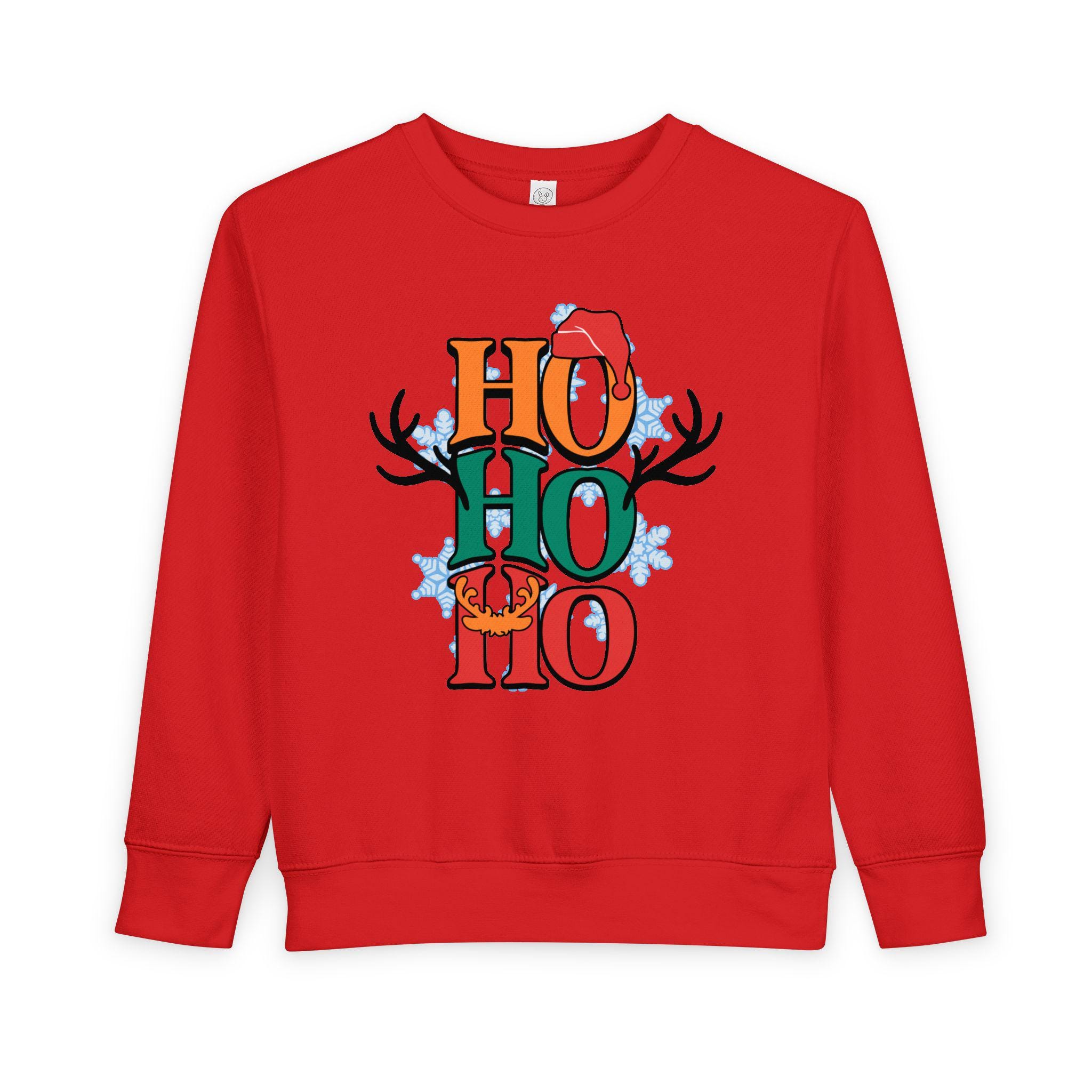 A cozy toddler sweatshirt that brings playful holiday cheer to little ones. Soft, mid-weight fabric and a tear-away label keep comfort front and center while a bright, festive graphic — stacked “HO HO HO” with snow, a Santa hat and antlers — adds whimsical charm. The relaxed fit and ribbed cuffs and waistband make it easy to layer over shirts or pajamas for morning present-opening or family photos. Durable coverstitching at the collar, shoulders and armholes stands up to active days and repeated washes, while the smooth interior keeps tiny necks happy. Offered in warm red and several heathered neutrals, it blends classic seasonal color with everyday wearability for playful holiday moments.