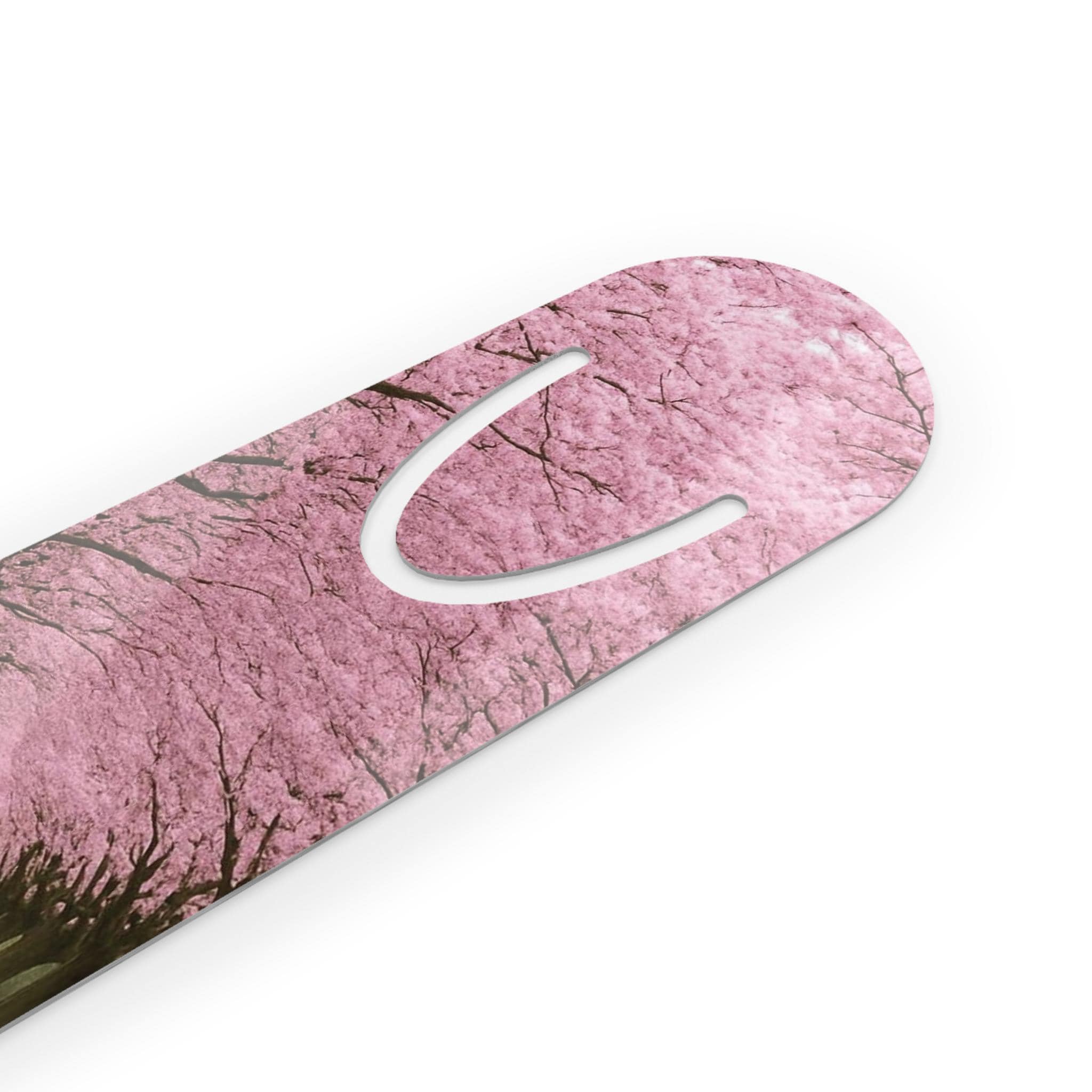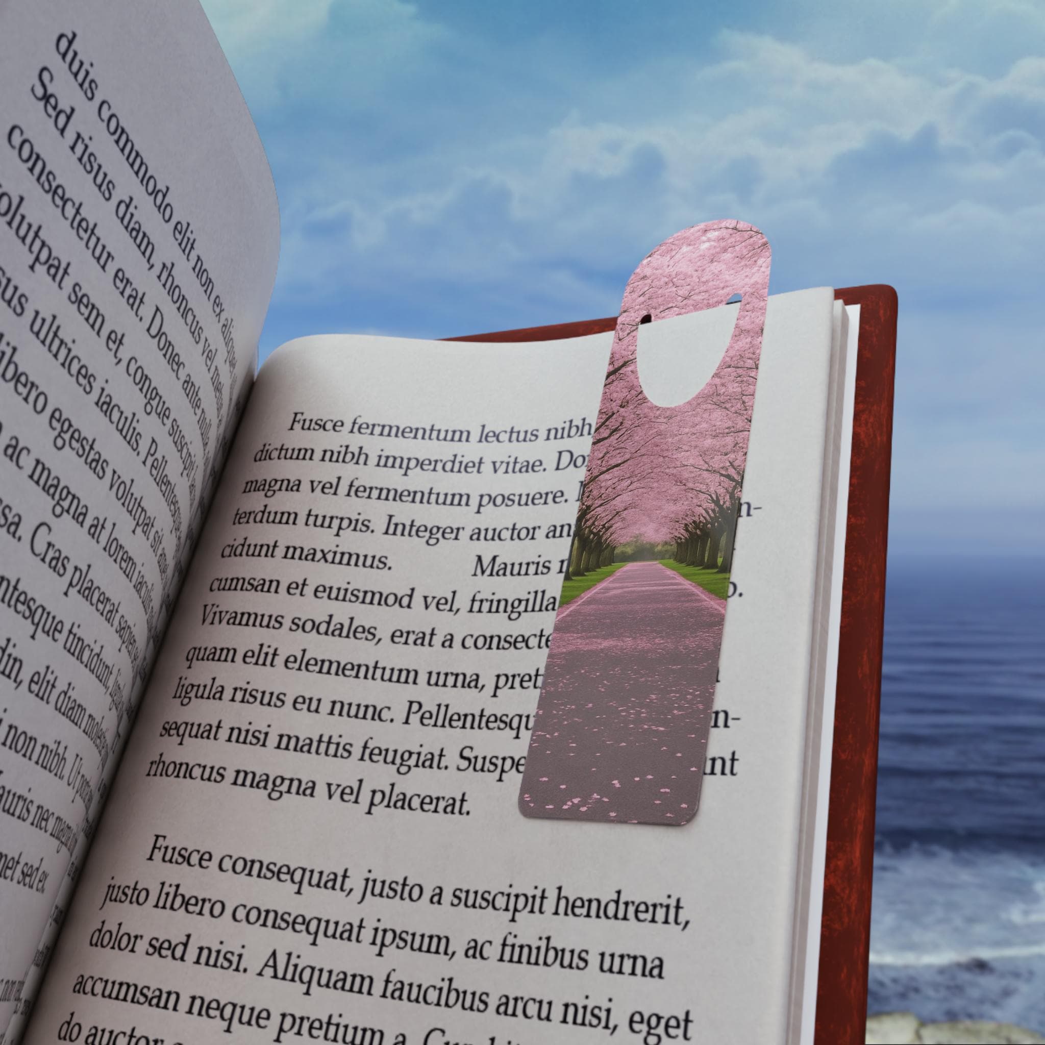 A slim, lightweight aluminum bookmark finished with a white printable front and a brushed-metal back. The front showcases vibrant, high-resolution printing — here, a serene cherry-blossom avenue in soft pinks — while a rounded top and a U-shaped slot securely hold your page without damaging paper. Thin and durable at just 9 g, it slides easily between pages and adds a touch of calm to reading moments. Assembled in the USA from globally sourced parts, this bookmark blends everyday practicality with photographic-quality color to keep your place in style.