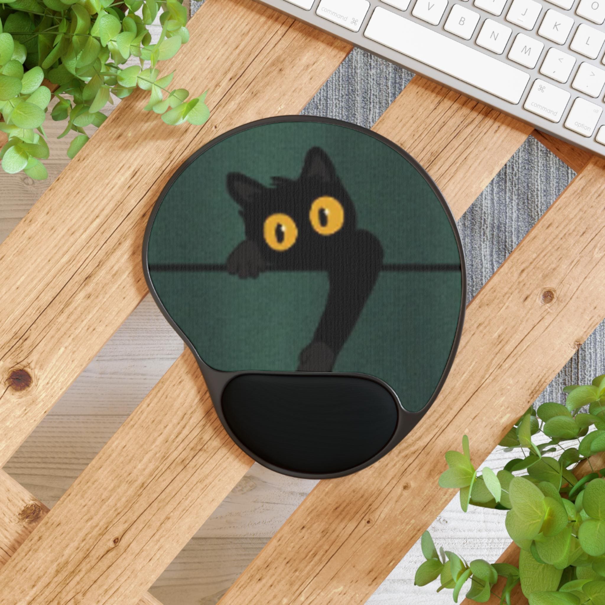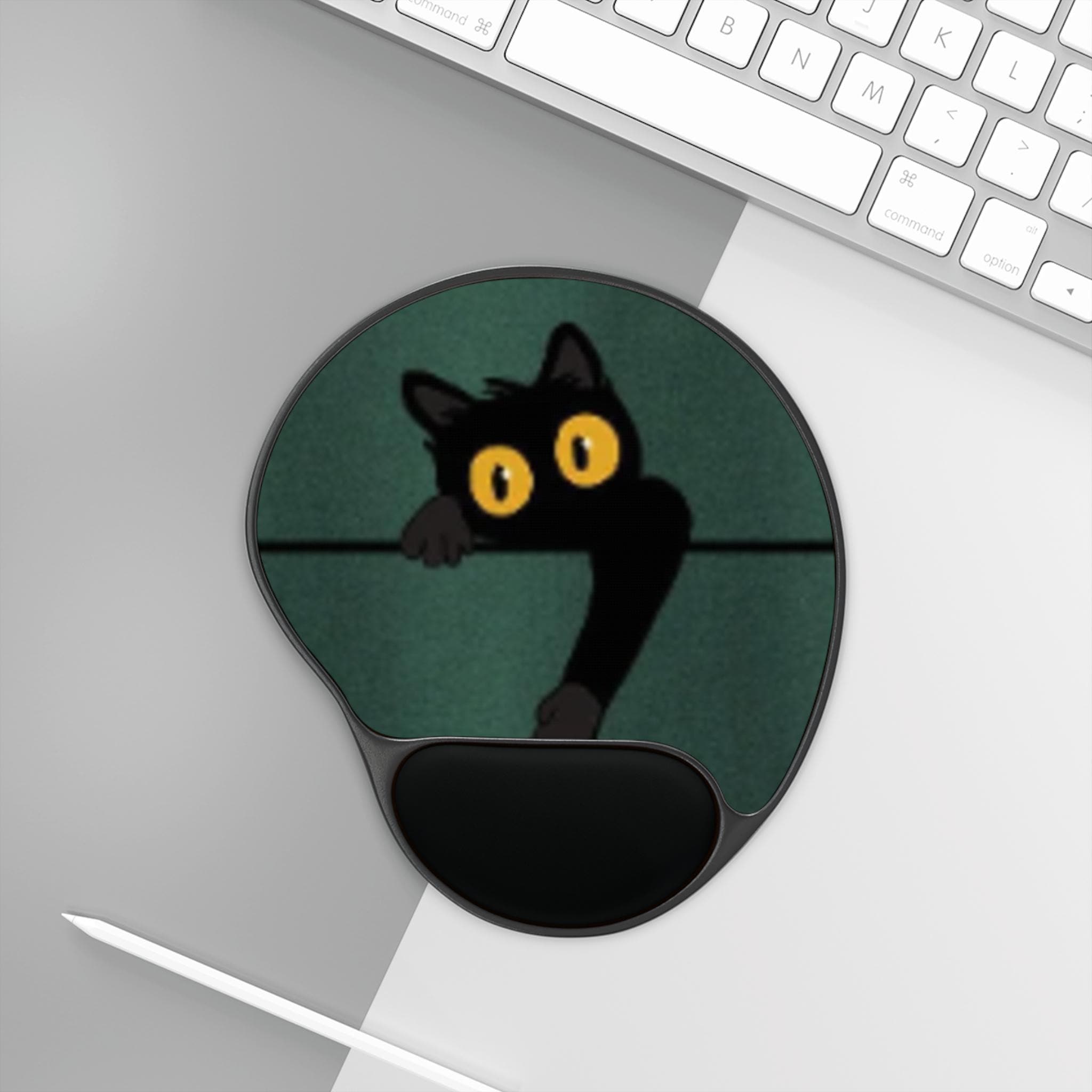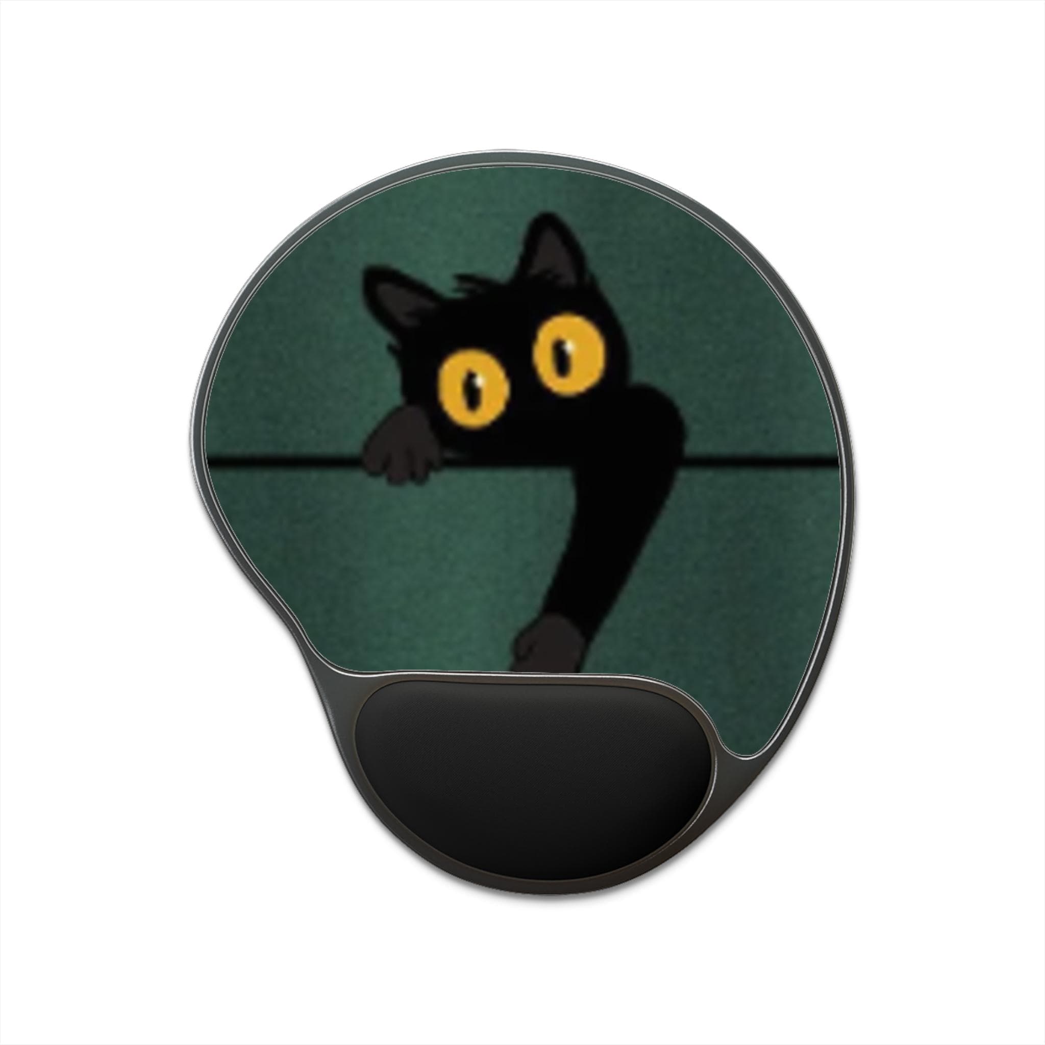 A cozy, playful mouse pad that turns a simple desk into a tiny scene of whimsy. The round pad features a wide-eyed black cat peeking over a ledge, printed in vivid, fade-resistant colors on a soft neoprene surface. The memory foam wrist rest cradles your wrist for long stretches of work or play, while the removable neoprene insert makes cleaning quick and worry-free. The low-profile, foot-shaped base keeps the pad stable without taking up extra space, and the compact size fits neatly beside laptops and keyboards. This mouse pad brings a quiet, mischievous charm to focused mornings, late-night creative sessions, and relaxed home office setups.