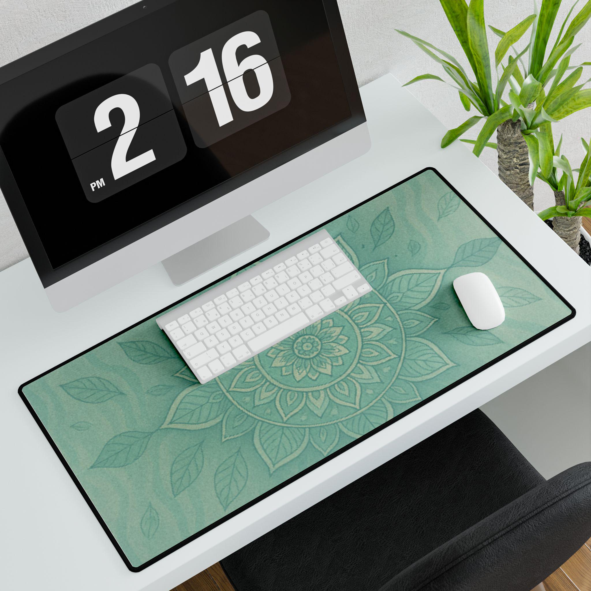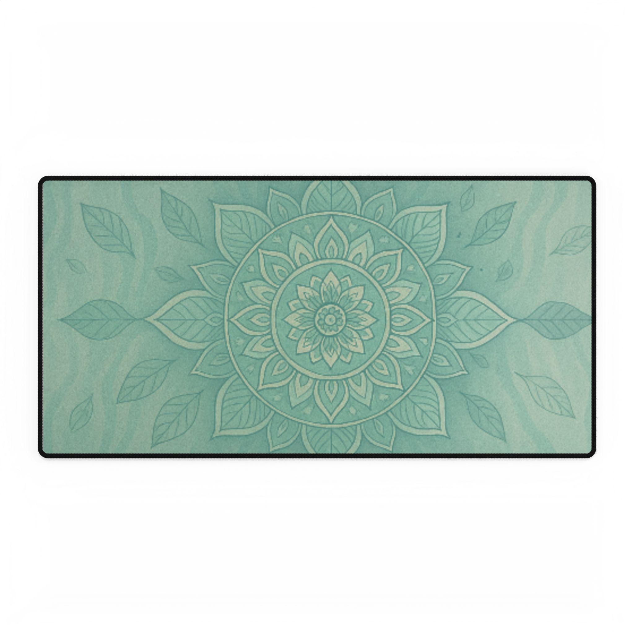 Spread a calm, focused energy across your workspace with this oversized desk mat. Its soft teal mandala and leaf pattern settles the eye while the expansive surface gives your keyboard and mouse room to move. The smooth polyester face lets optical and laser mice glide with ease, and the grippy natural rubber base keeps everything steady during long work sessions or late-night creative sprints. Subtle anti-fray stitching around the edge keeps the design crisp, and the muted, nature-inspired tones blend easily into minimalist, boho, or wellness-minded setups. Lay it down for journaling, drawing, gaming, or simply to create a cleaner, more intentional desk space that invites calm and concentration.