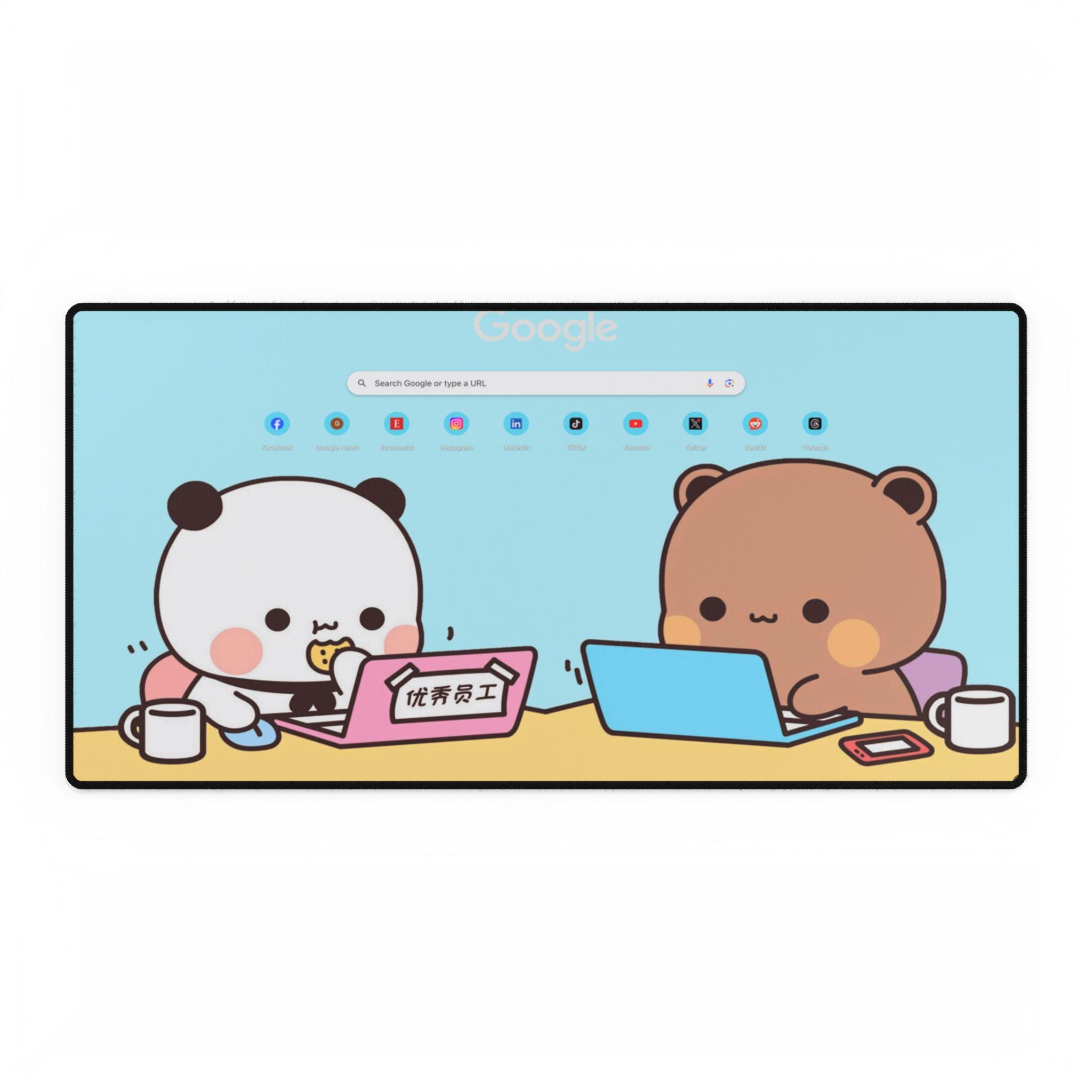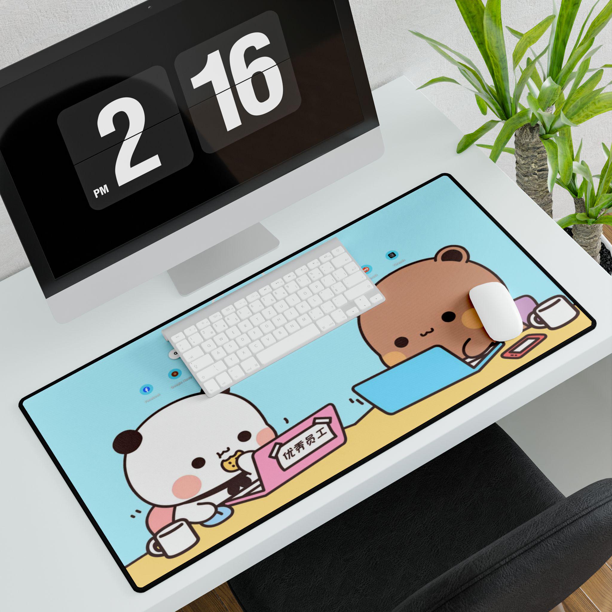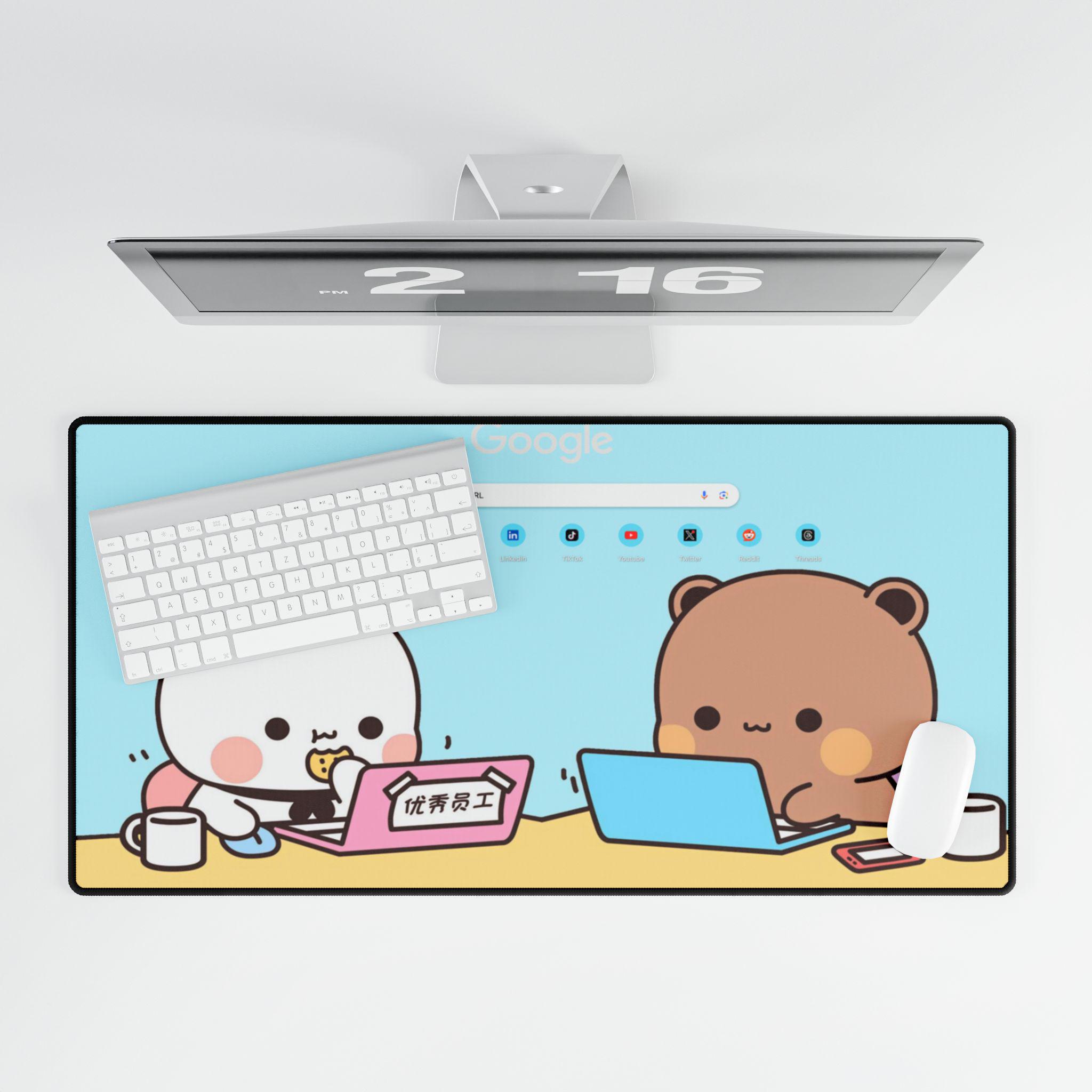 Bright, oversized desk mat illustrated with two adorable characters sharing a cozy work session. Soft pastel blues and warm browns set a calm, friendly scene that turns any workspace into a cheerful nook. The large surface gives plenty of room for keyboard, mouse, and a cup of tea, while the smooth polyester top and natural rubber base keep movement quiet and precise. It’s built to handle long days of focus, study, or casual browsing — a little visual hug that helps your desk feel more personal and less cluttered.