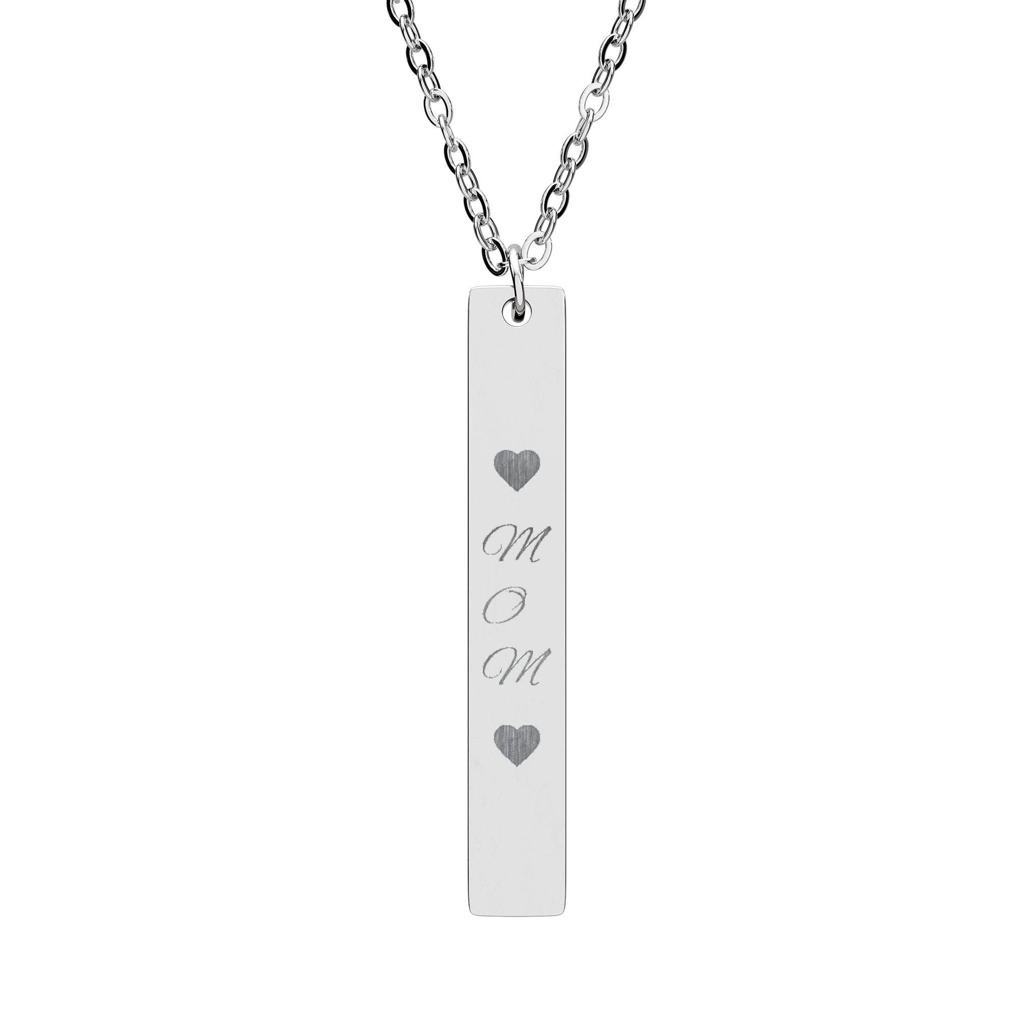 A slim vertical bar necklace that keeps a quiet, personal message close to the heart. The narrow 32 x 5 mm pendant carries clean, laser-engraved markings between two tiny heart icons, creating an intimate, modern silhouette. Finished in surgical-grade 316L stainless steel (with optional PVD colorways), the pendant is resistant to rust and wear and is safe for sensitive skin. It sits flat against the chest on a delicate chain, blending minimalist style with everyday durability — a subtle reminder you can wear every day or bring out for meaningful moments.