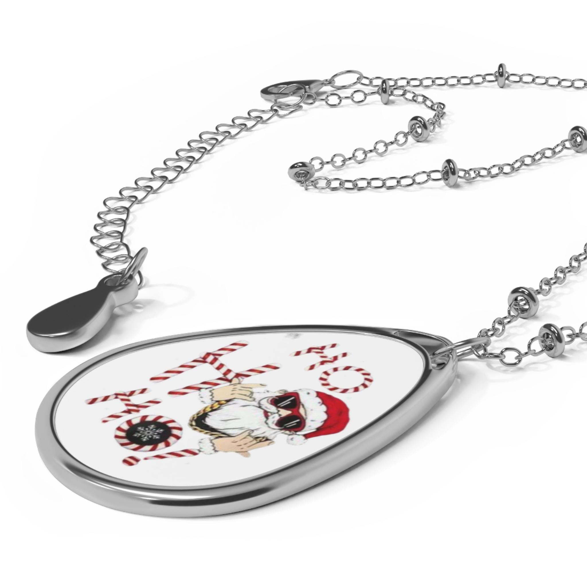 This polished ellipse pendant brings a touch of playful holiday charm to everyday wear. The glossy, full-color print sits on a durable white aluminum surface, so illustrations and bright patterns stay vivid. The zinc alloy pendant and chain have a sleek, silver tone that frames the artwork and moves easily from casual days to festive gatherings. A secure lobster clasp keeps the necklace in place while delicate chain detailing adds subtle shine. Wear it alone to let the design speak, or layer with other necklaces for a personal stacked look.