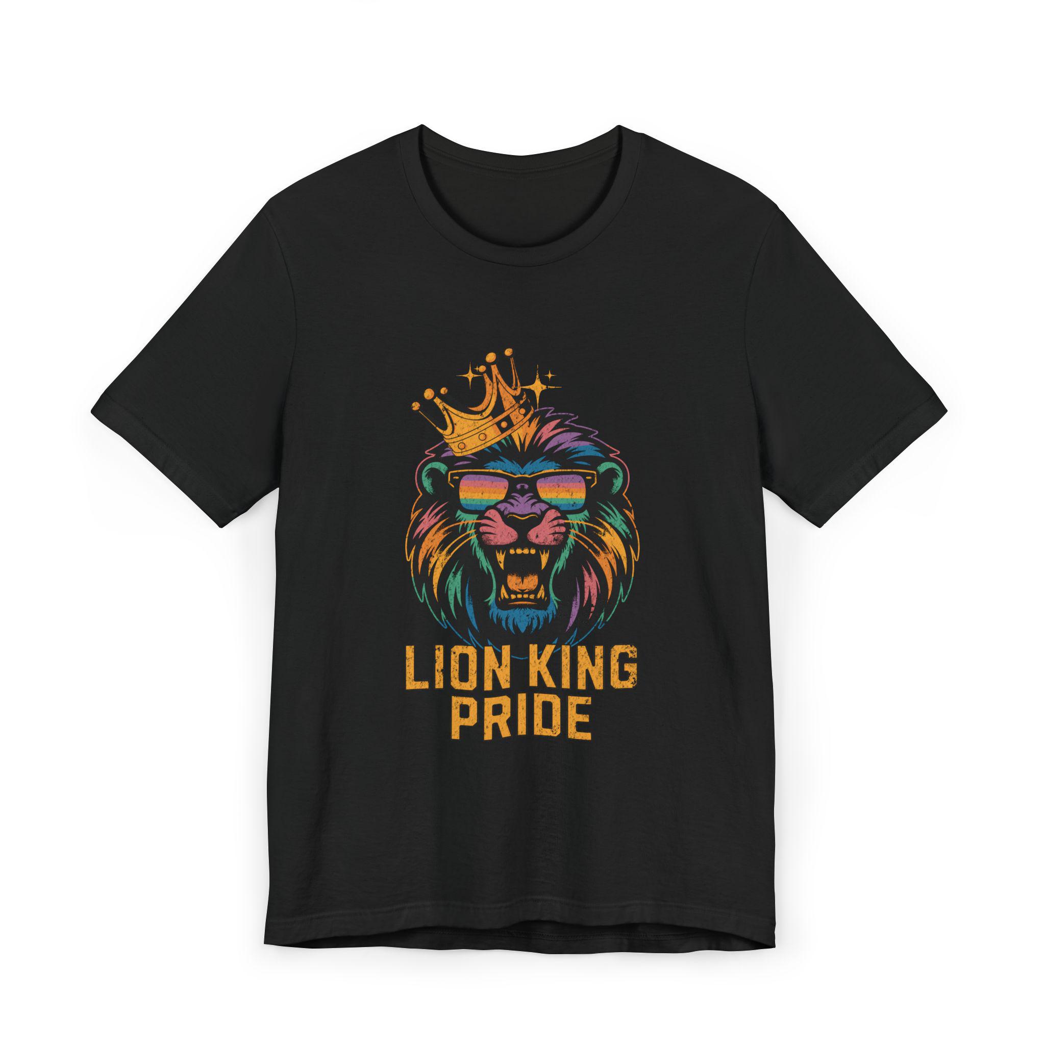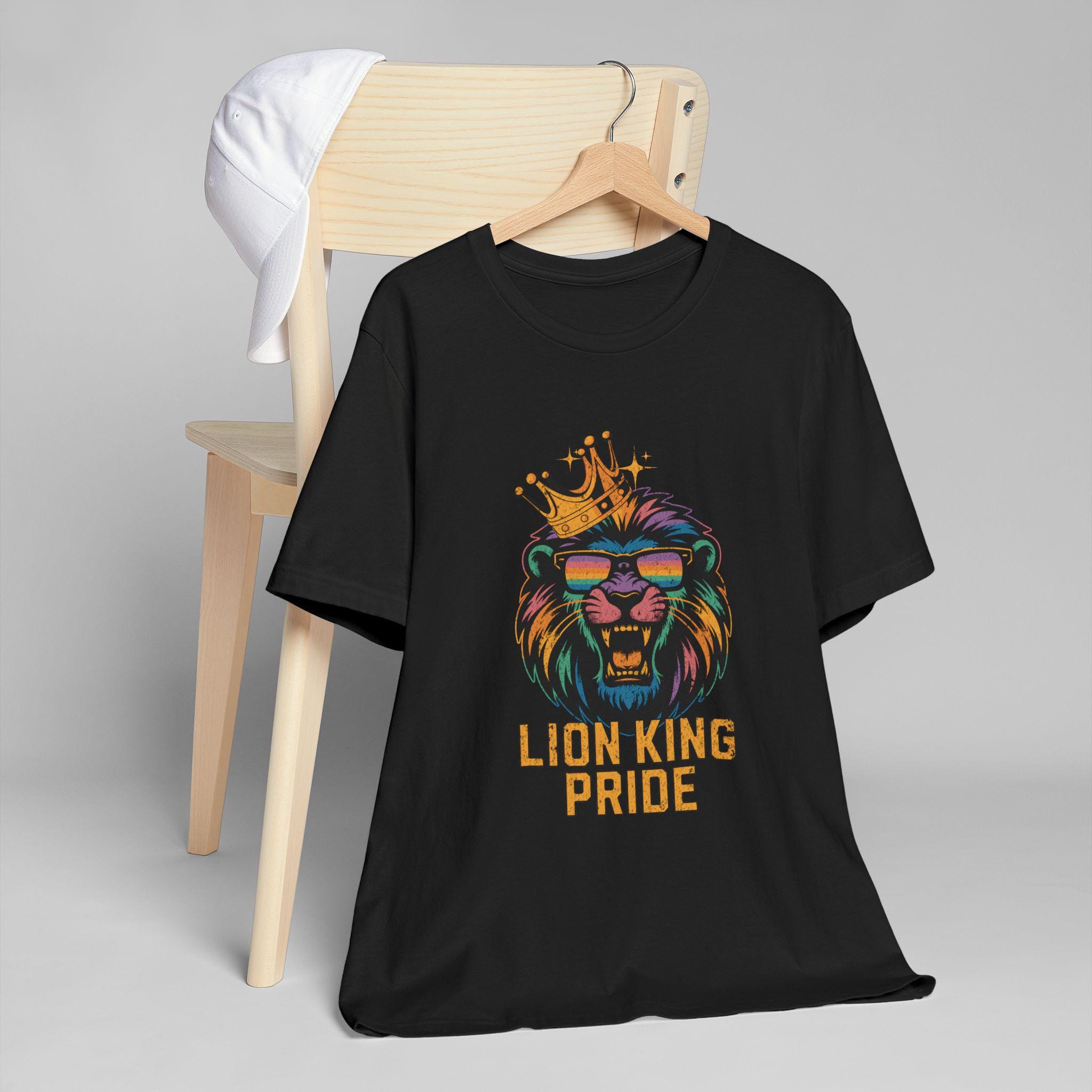This lightweight jersey tee brings bold, playful energy to everyday wear. A vibrant lion head—painted in sunset hues, wearing sunglasses and a tilted crown—sits over block text that reads "LION KING PRIDE." The colors pop against the black fabric, giving the design a streetwise, festival-ready vibe that still reads casual and comfortable. Wear it to soundtrack a sunny afternoon with friends, to show pride in a team or community, or as a statement layer under a jacket. The retail fit and breathable cotton keep movement easy and the neckline neat, while the soft fabric settles in quickly for a lived-in feel.
