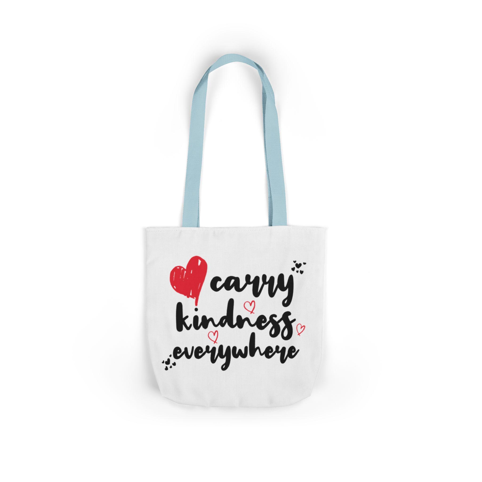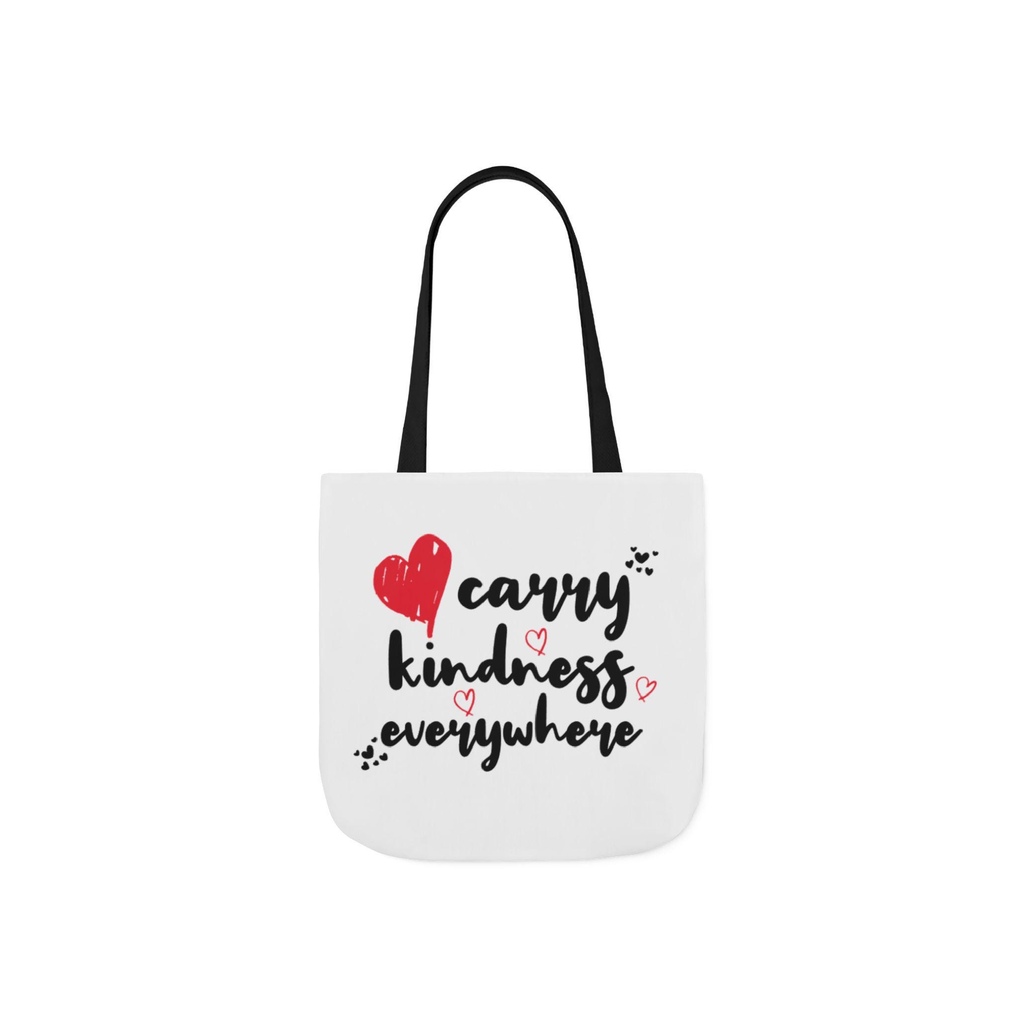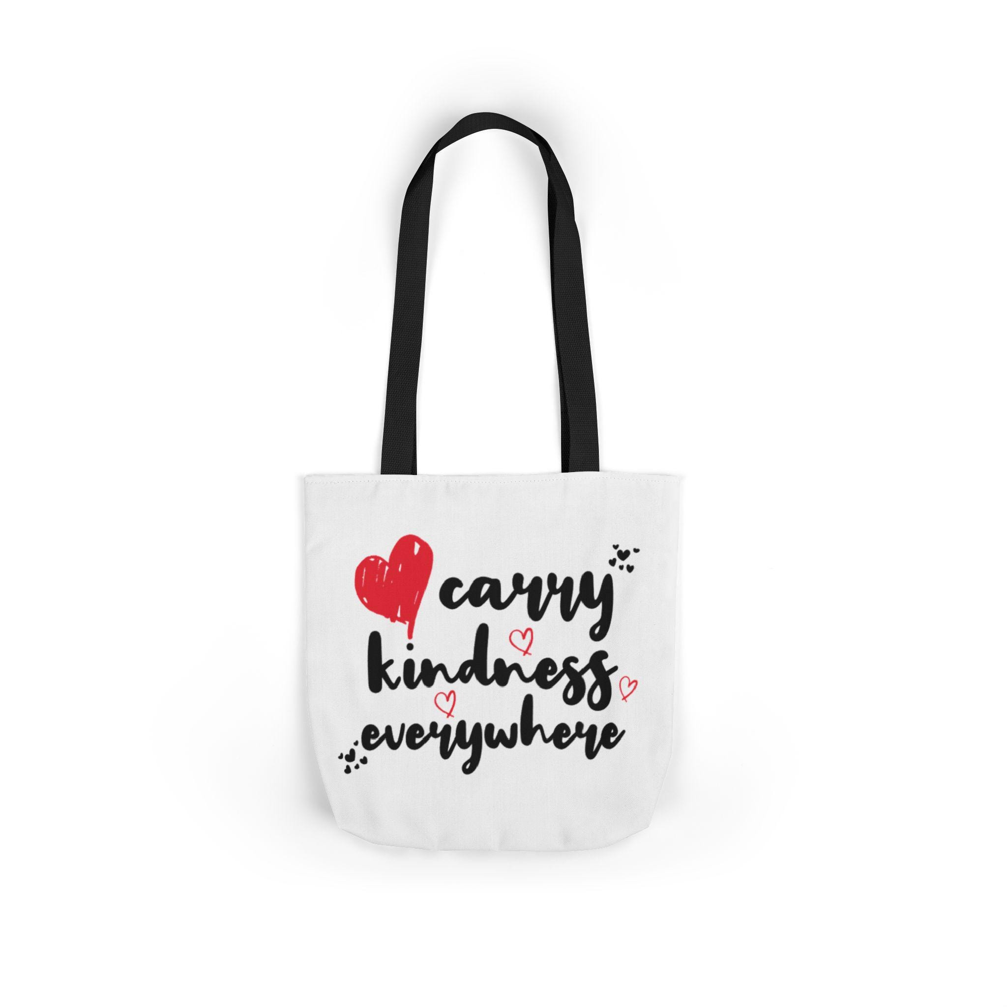 This canvas tote brings a small, warm rebellion into everyday errands. Soft-feeling polyester canvas and vivid, edge-to-edge printing let the hand-drawn lettering and heart doodles speak loudly: carry kindness everywhere. Boxed corners give the bag real shape and extra room for groceries, books, or a throw blanket. Choose from three sizes and five strap colors to match your mood or outfit. Black interior hides scuffs and makes the bright print pop — a simple, heartfelt companion for market runs, library visits, or coffee-shop catch-ups.