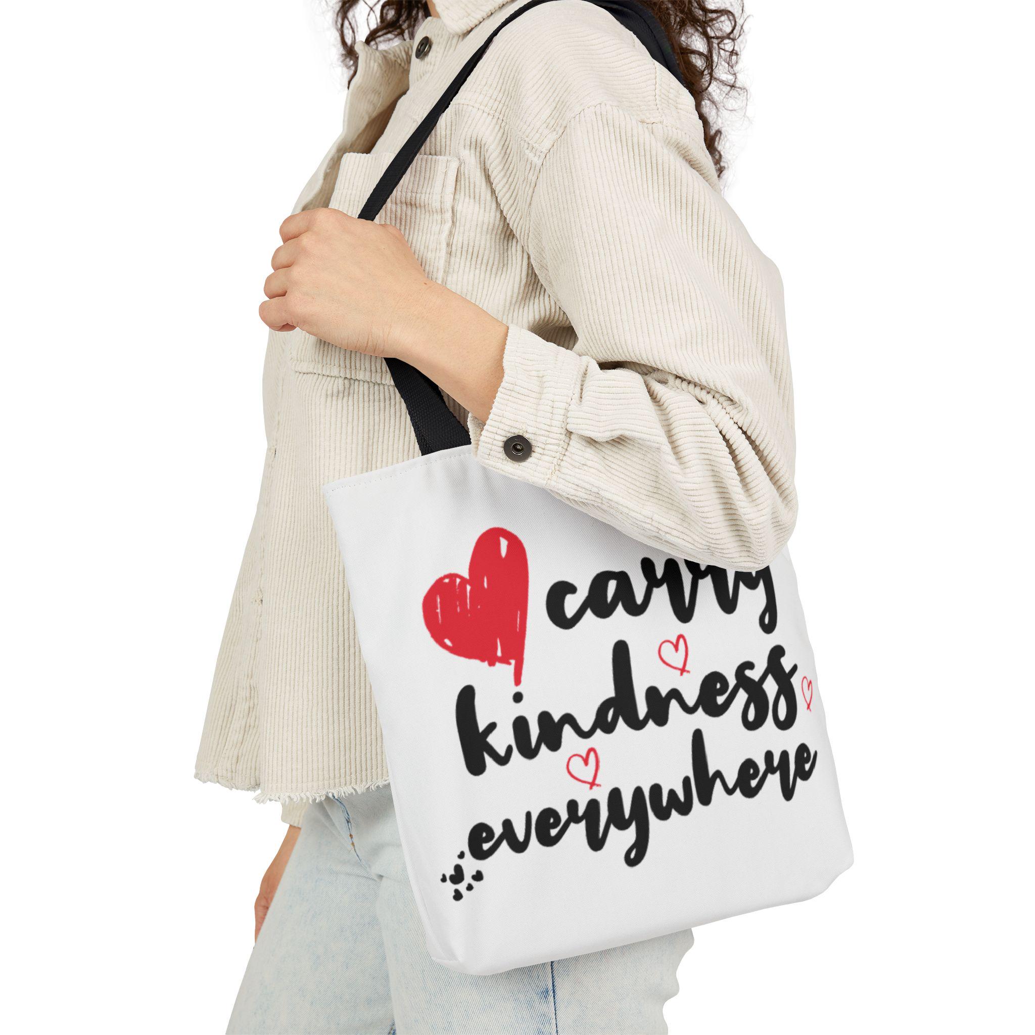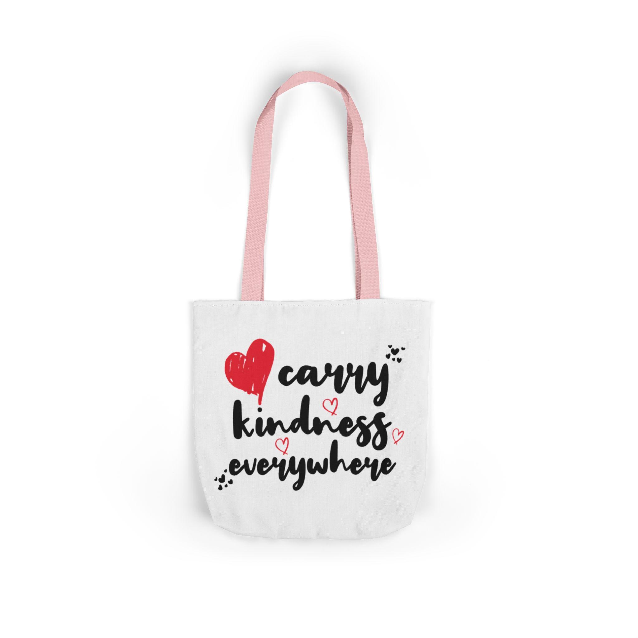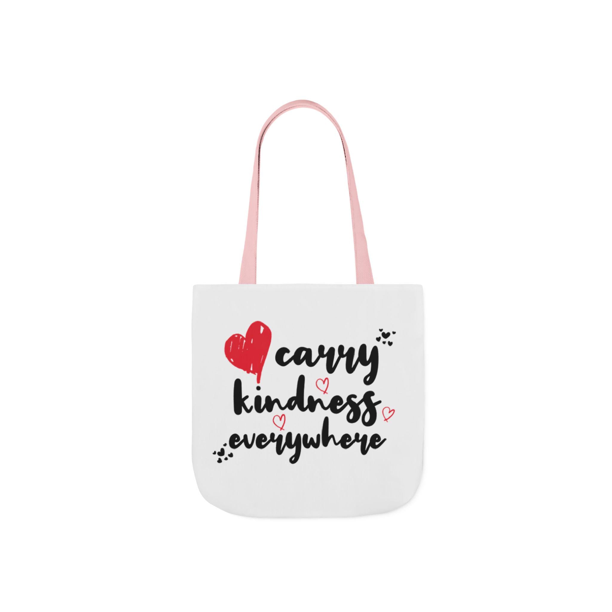 This canvas tote brings a small, warm rebellion into everyday errands. Soft-feeling polyester canvas and vivid, edge-to-edge printing let the hand-drawn lettering and heart doodles speak loudly: carry kindness everywhere. Boxed corners give the bag real shape and extra room for groceries, books, or a throw blanket. Choose from three sizes and five strap colors to match your mood or outfit. Black interior hides scuffs and makes the bright print pop — a simple, heartfelt companion for market runs, library visits, or coffee-shop catch-ups.