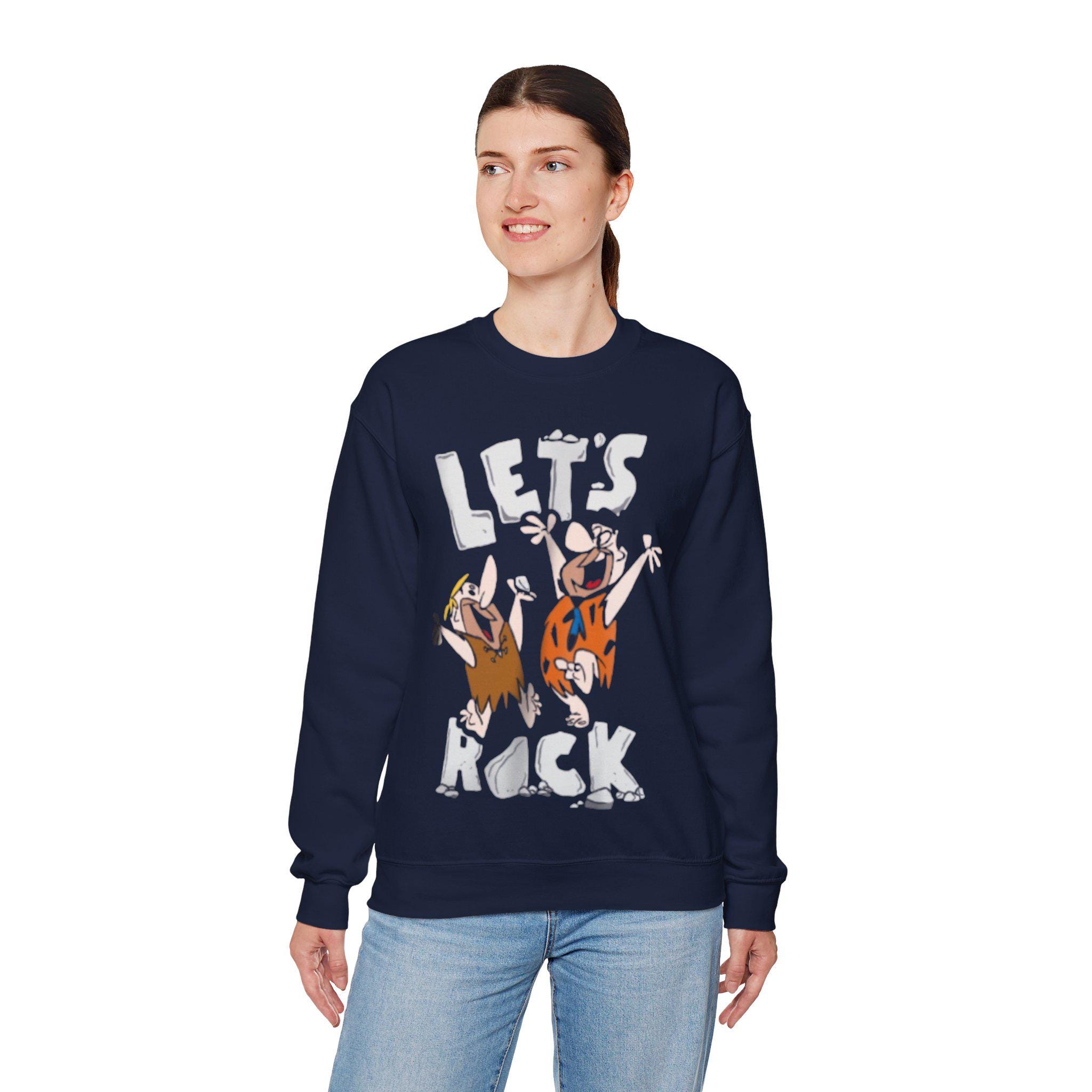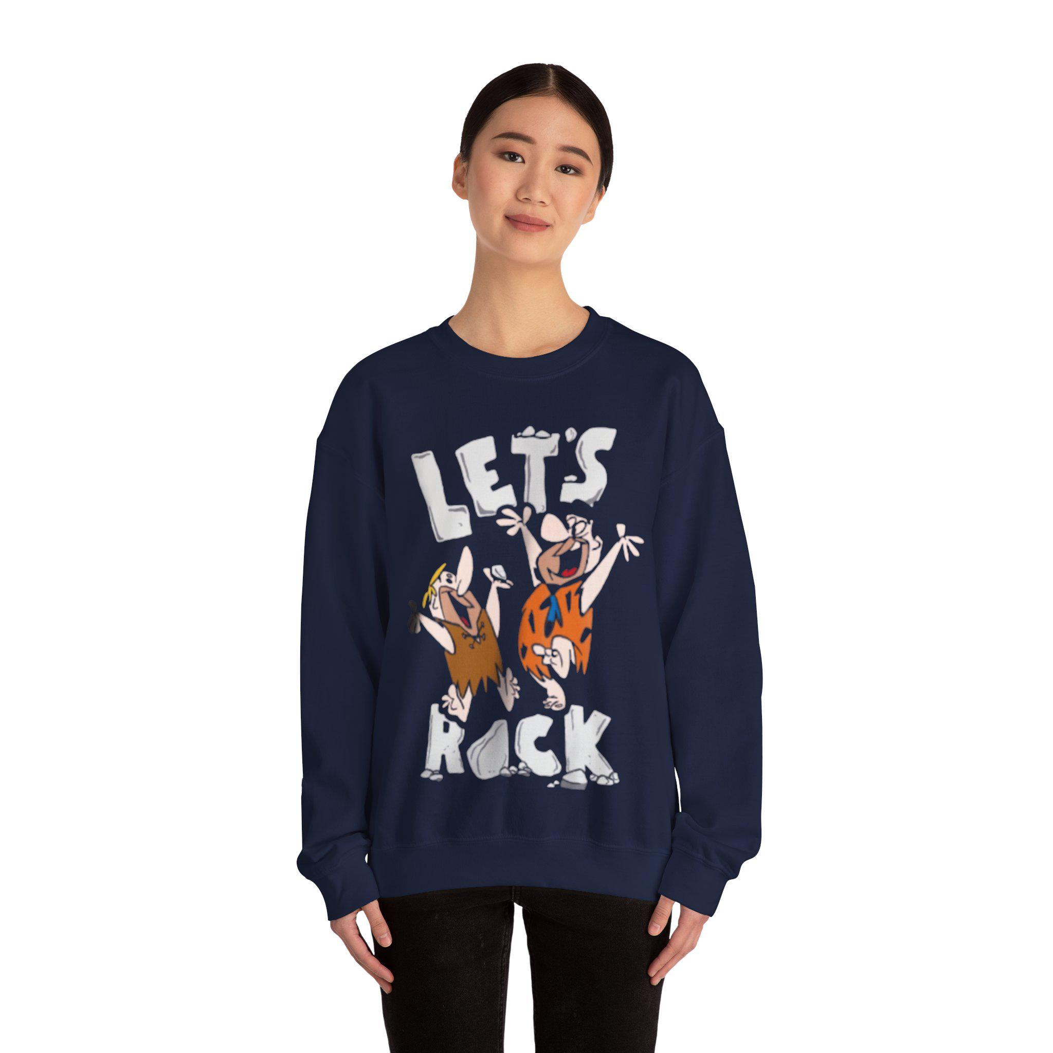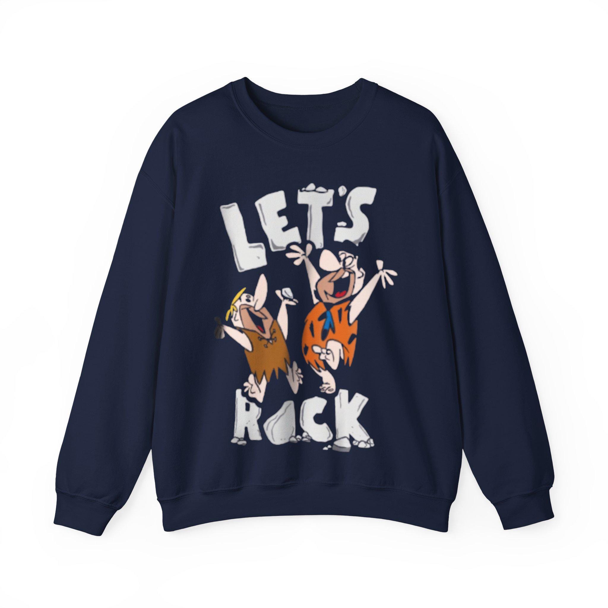This navy crewneck sweatshirt brings playful, nostalgic energy to everyday wear. Two animated caveman characters leap across the chest beneath bold, hand-drawn lettering that reads “LET’S ROCK,” giving the piece a cartoon-rock vibe that’s equal parts fun and loud. The medium-heavy 50/50 cotton-poly blend feels substantial without being stiff, and the classic crew fit, ribbed collar, cuffs and waistband keep the silhouette clean and comfortable. Durable double-needle stitching and OEKO-TEX certified dyes mean this sweatshirt stands up to regular wear while meeting strict safety and environmental standards. Wear it to lounge, to a casual meet-up, or anytime you want to channel a carefree, retro-rock mood.