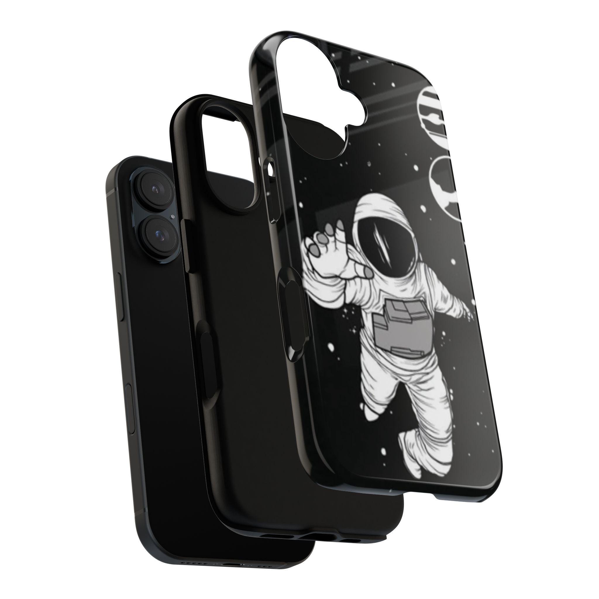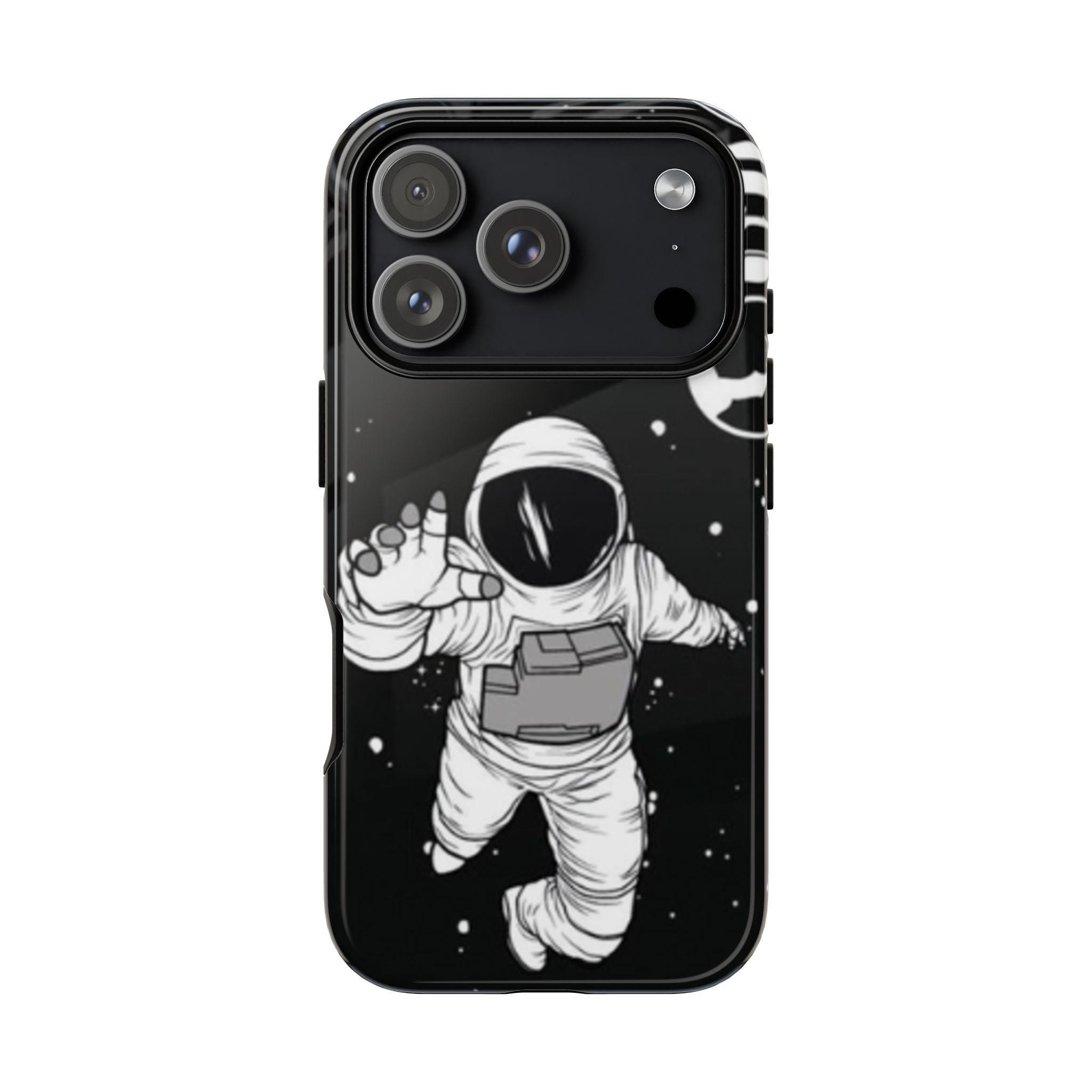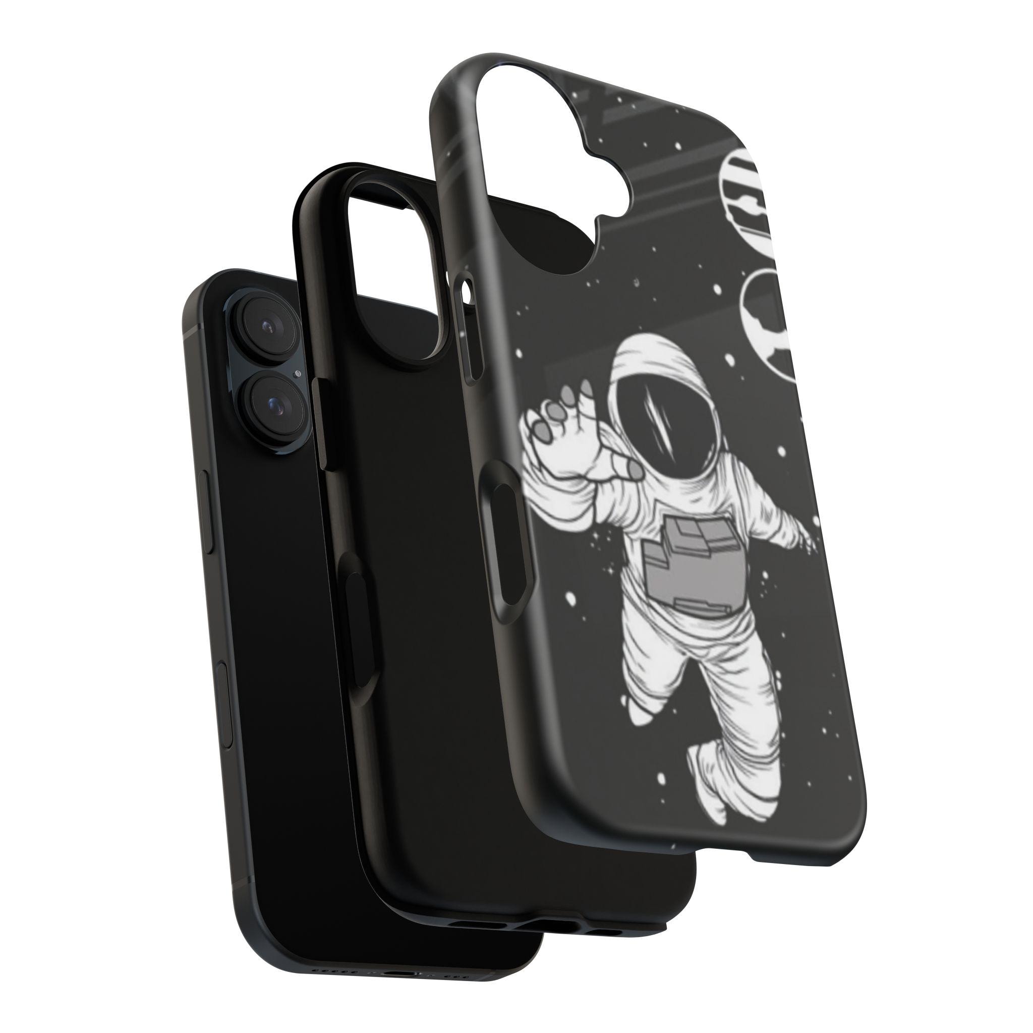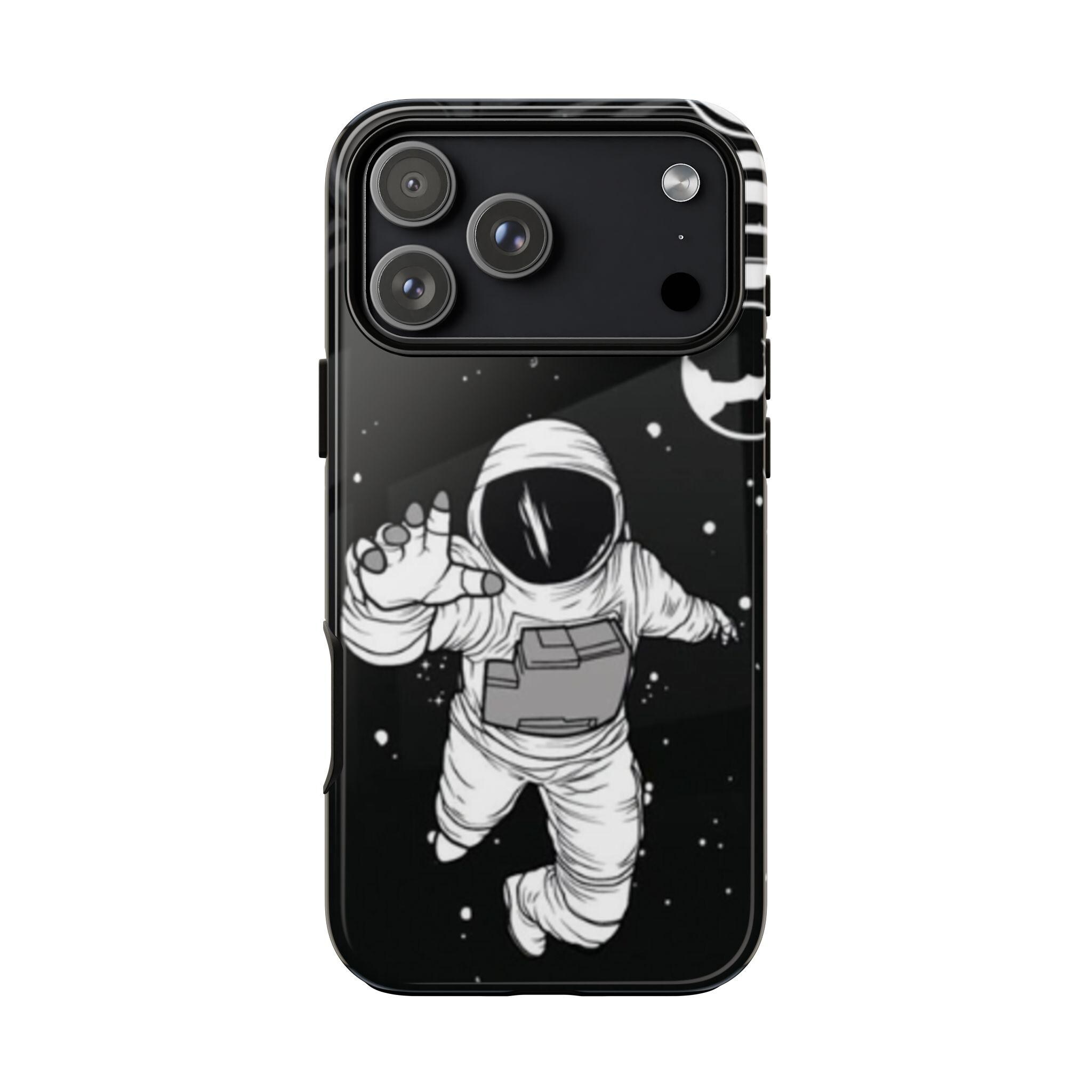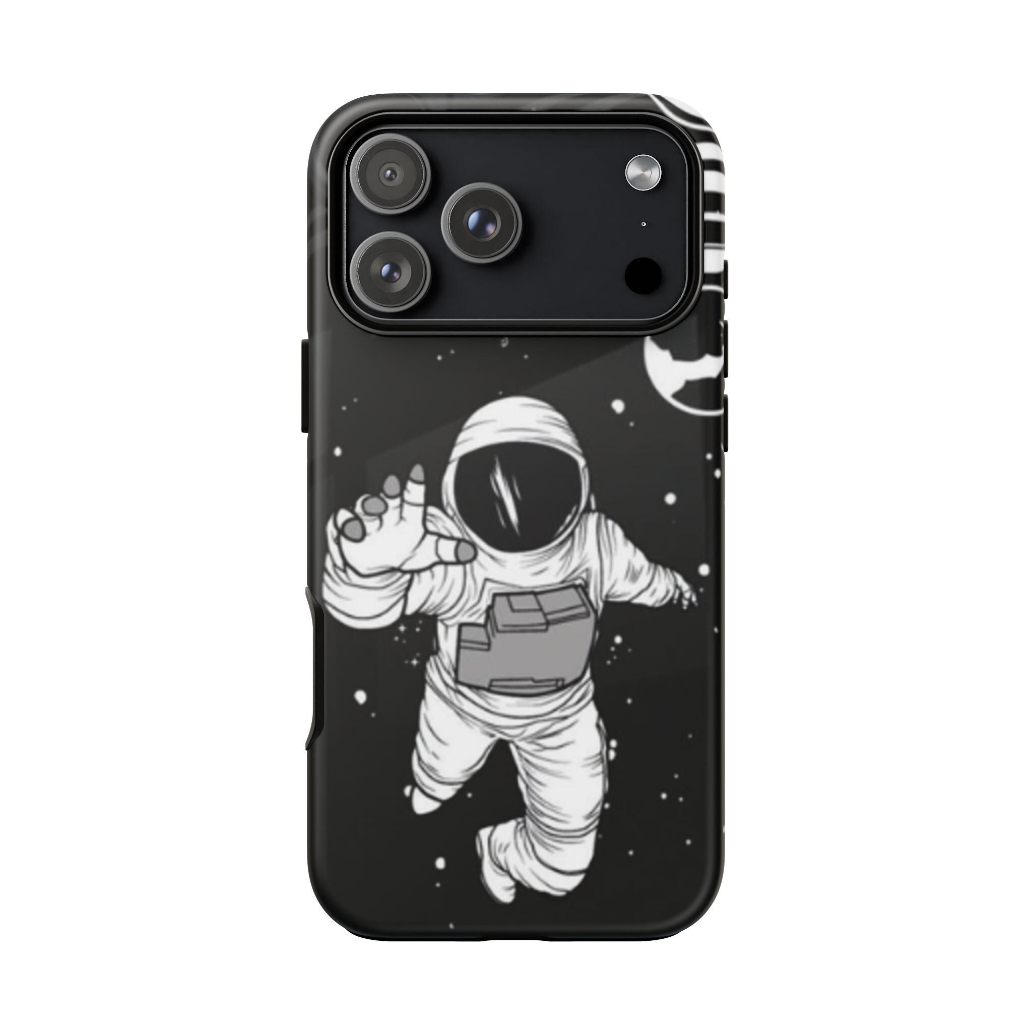 A sleek, protective phone case that frames your device like a little window into night—an astronaut drifting through a starfield reaches toward the edge of the frame. The high-gloss (or matte) finish makes the inky black backdrop pop while the white line-art astronaut and subtle planetary rings keep the design minimalist and modern. Dual-layer construction with a polycarbonate shell and TPU silicone liner absorbs shocks without adding bulk. UV-resistant inks lock the print in place so the contrast stays rich outdoors. Clear port openings and wireless charging support keep daily use effortless. This case reads like a quiet, thoughtful statement piece for someone who loves space, illustration, and gear that actually protects.