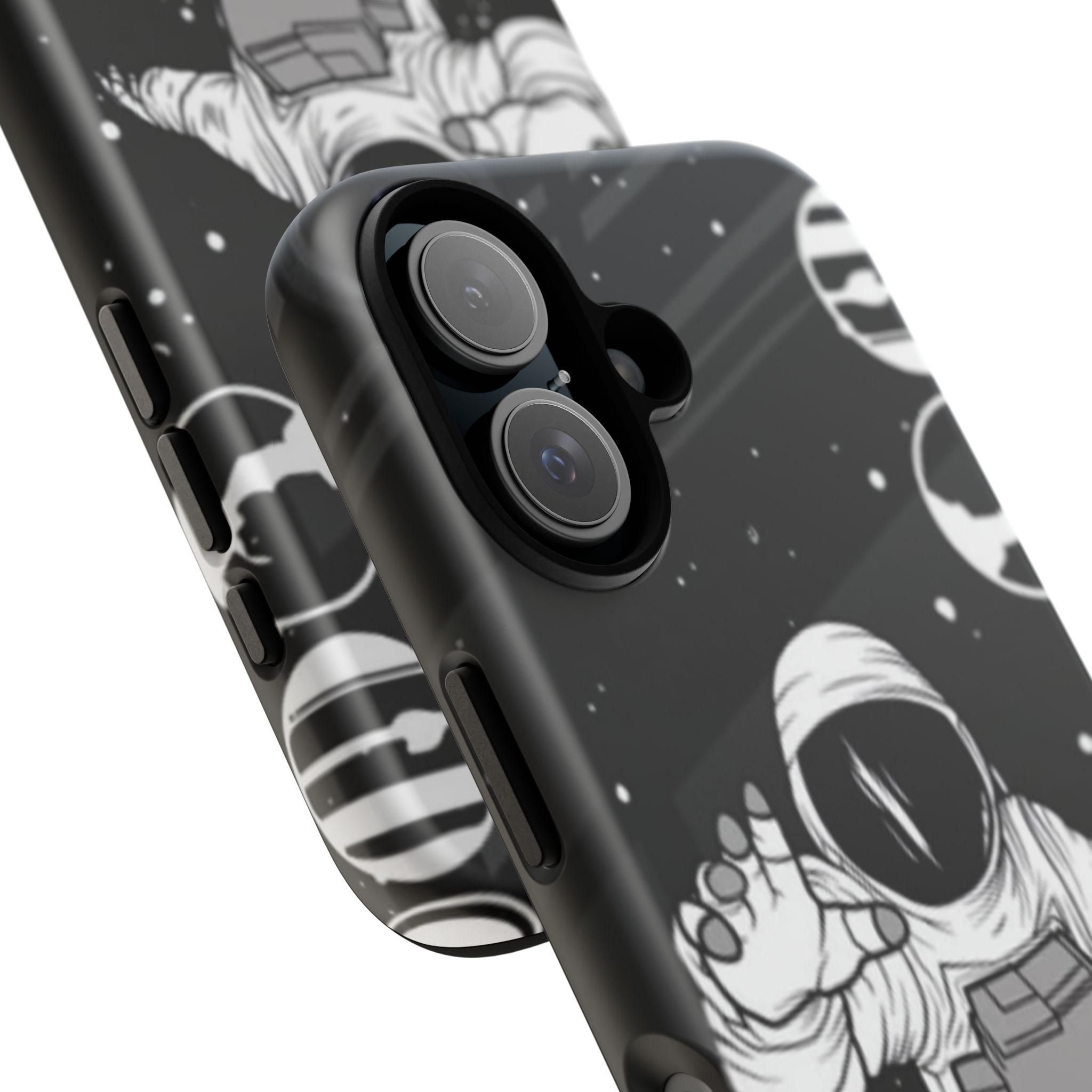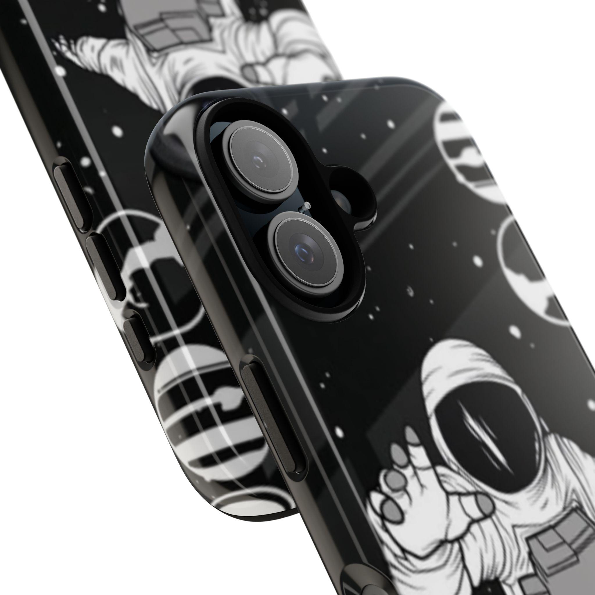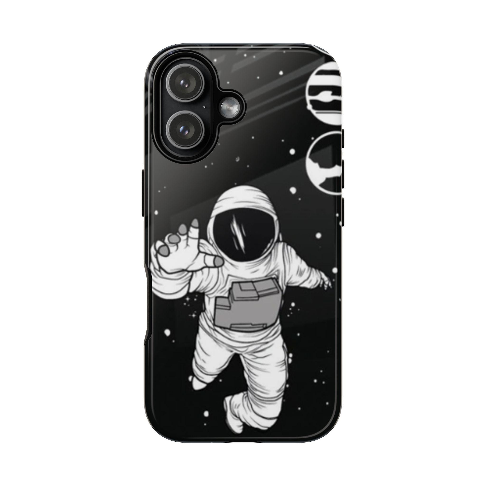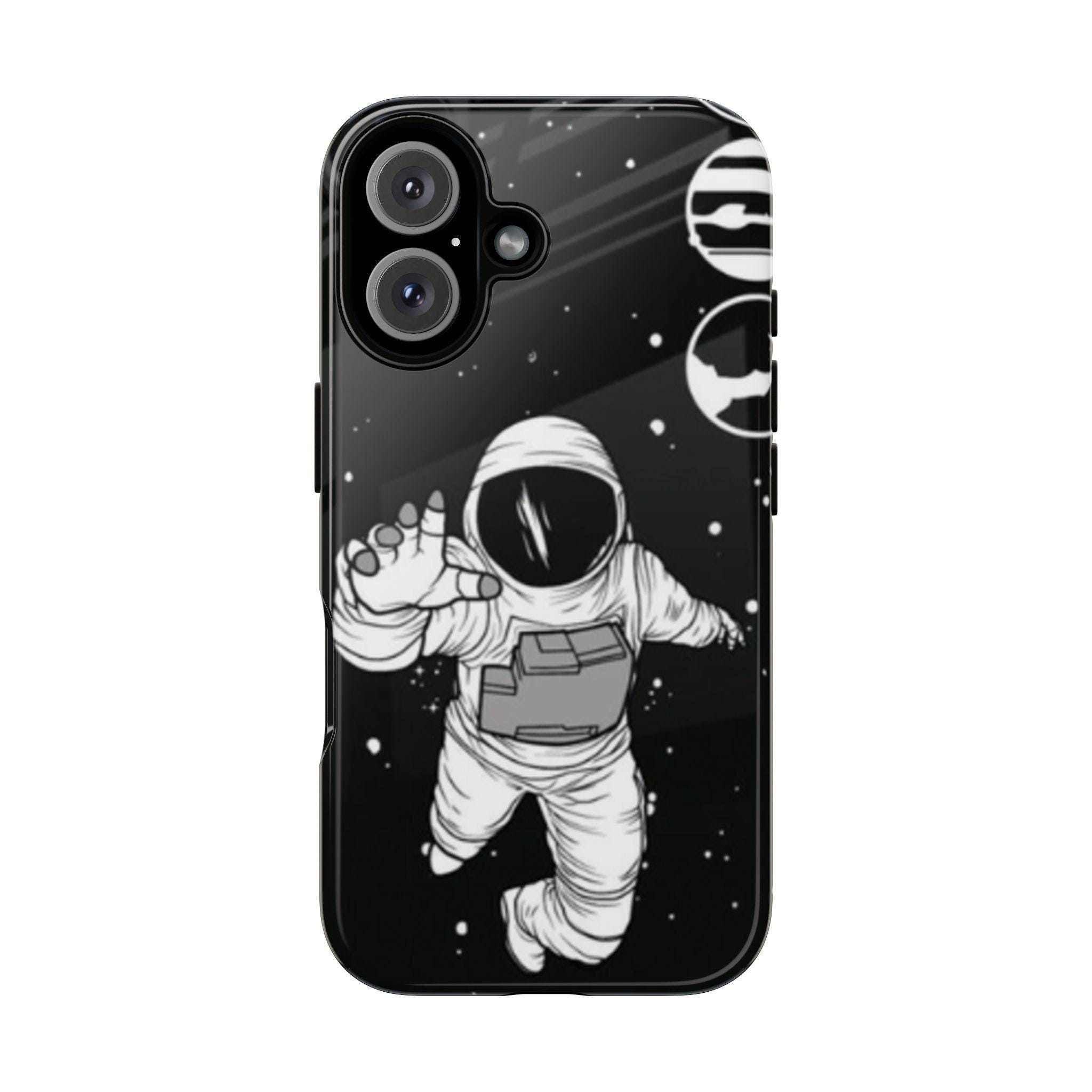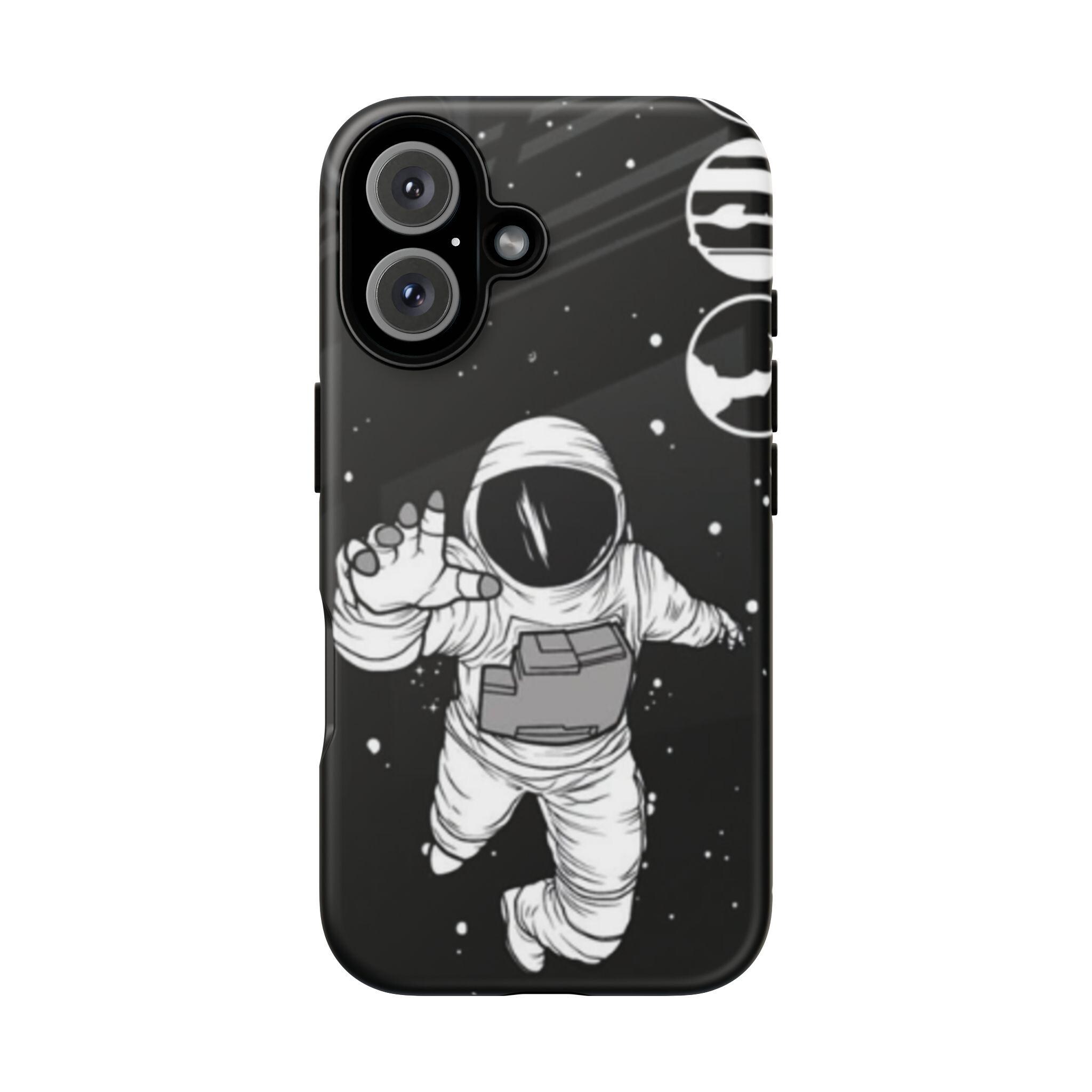 A sleek, protective phone case that frames your device like a little window into night—an astronaut drifting through a starfield reaches toward the edge of the frame. The high-gloss (or matte) finish makes the inky black backdrop pop while the white line-art astronaut and subtle planetary rings keep the design minimalist and modern. Dual-layer construction with a polycarbonate shell and TPU silicone liner absorbs shocks without adding bulk. UV-resistant inks lock the print in place so the contrast stays rich outdoors. Clear port openings and wireless charging support keep daily use effortless. This case reads like a quiet, thoughtful statement piece for someone who loves space, illustration, and gear that actually protects.