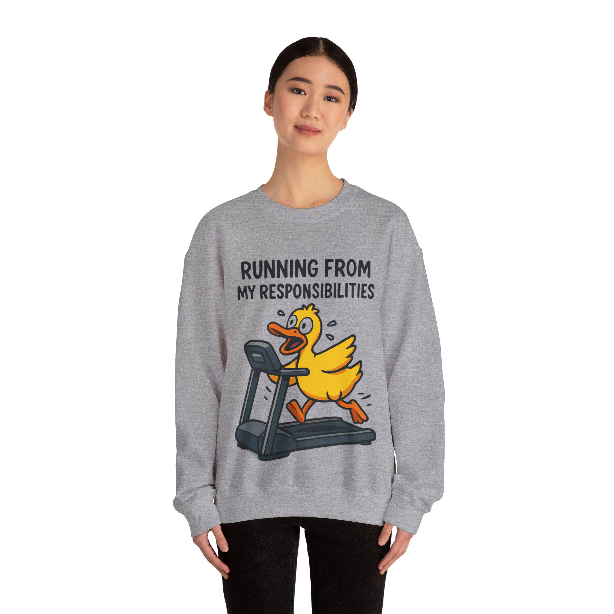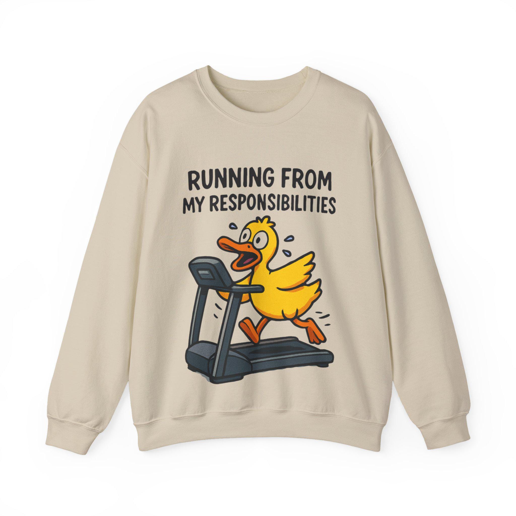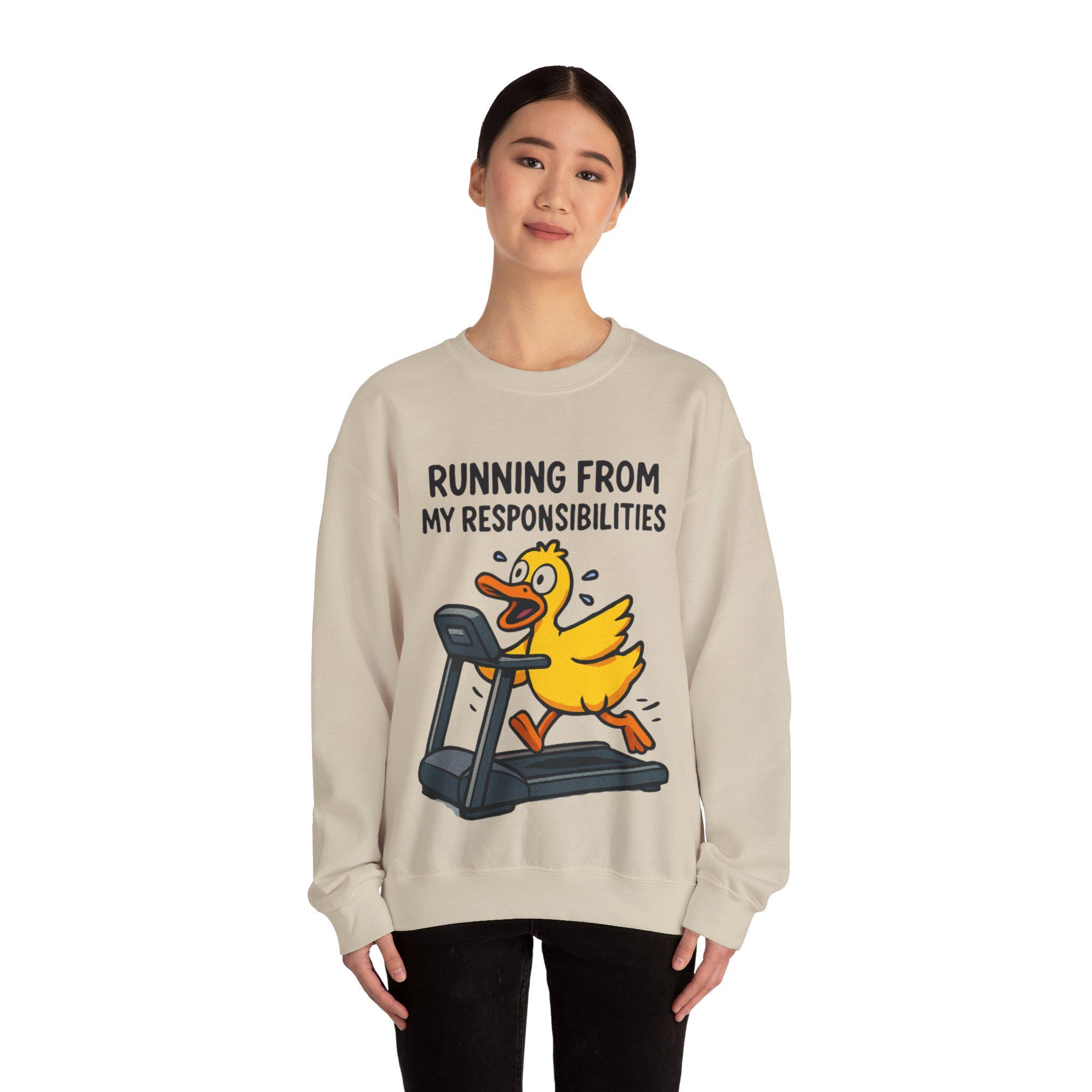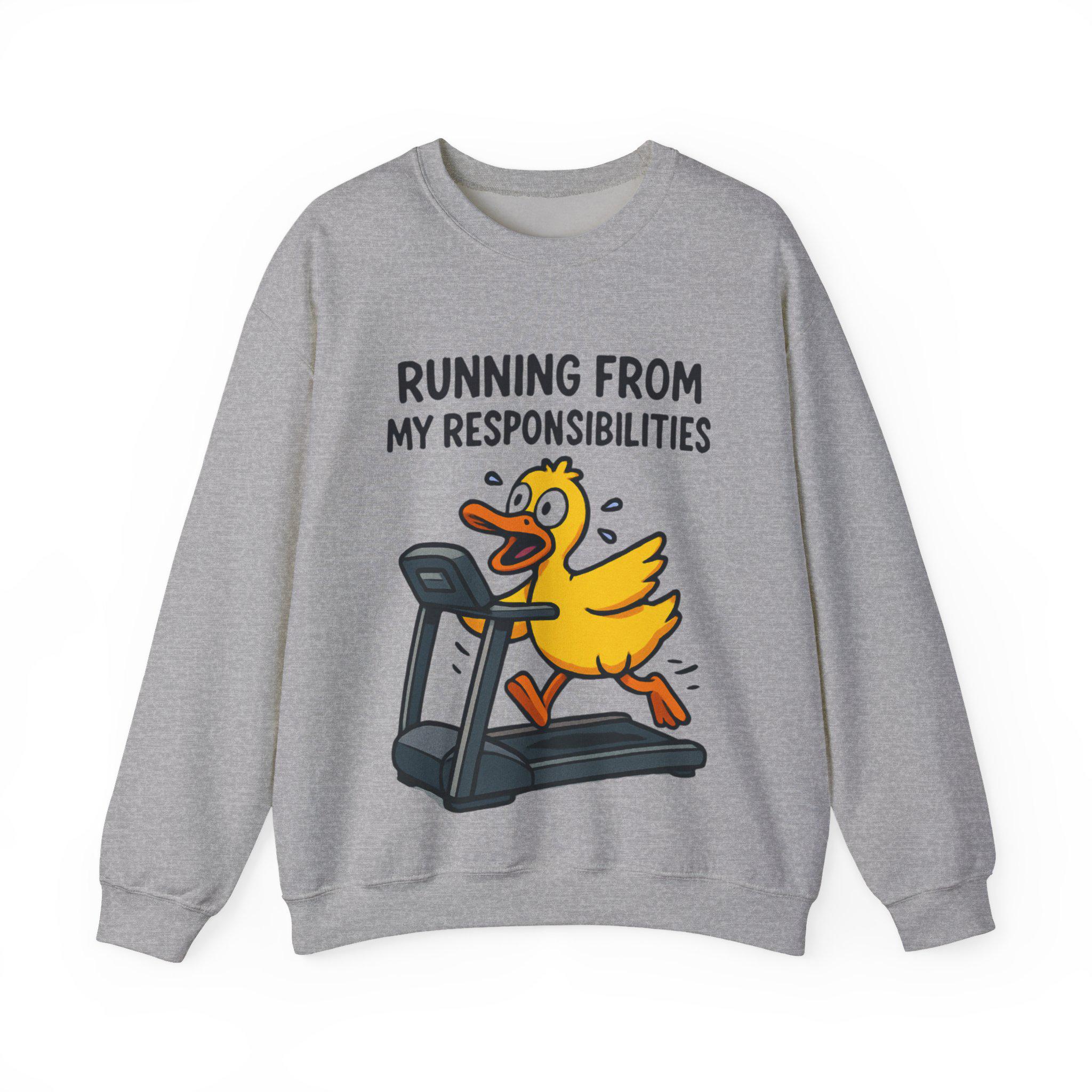 This cozy crewneck brings a wink of humor to quiet mornings and long evenings. Soft, medium-heavy fabric drapes comfortably while the cheerful duck graphic—mid-sprint on a treadmill—lets you laugh at life’s little pressure points. Wear it around the house with leggings, layer it over a tee for errands, or pull it on after a workout to warm down. The relaxed cut and resilient ribbed collar keep the shape wash after wash, and the playful design opens conversations without trying too hard. It’s for the person who balances responsibilities with ridiculousness and wants comfort that matches their sense of humor.