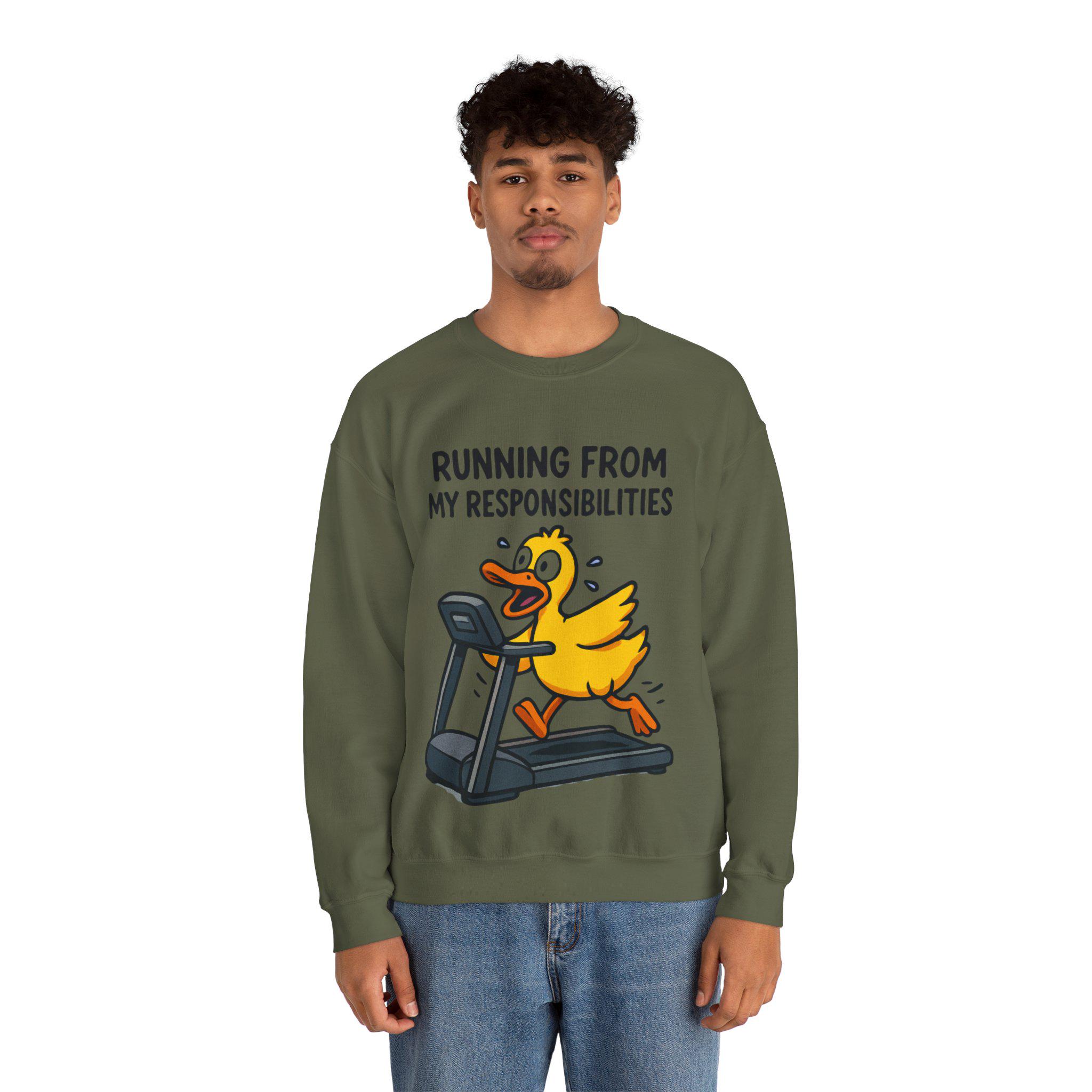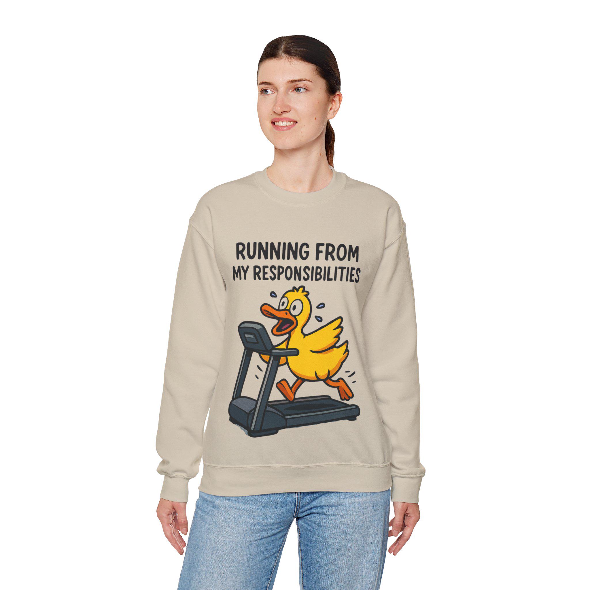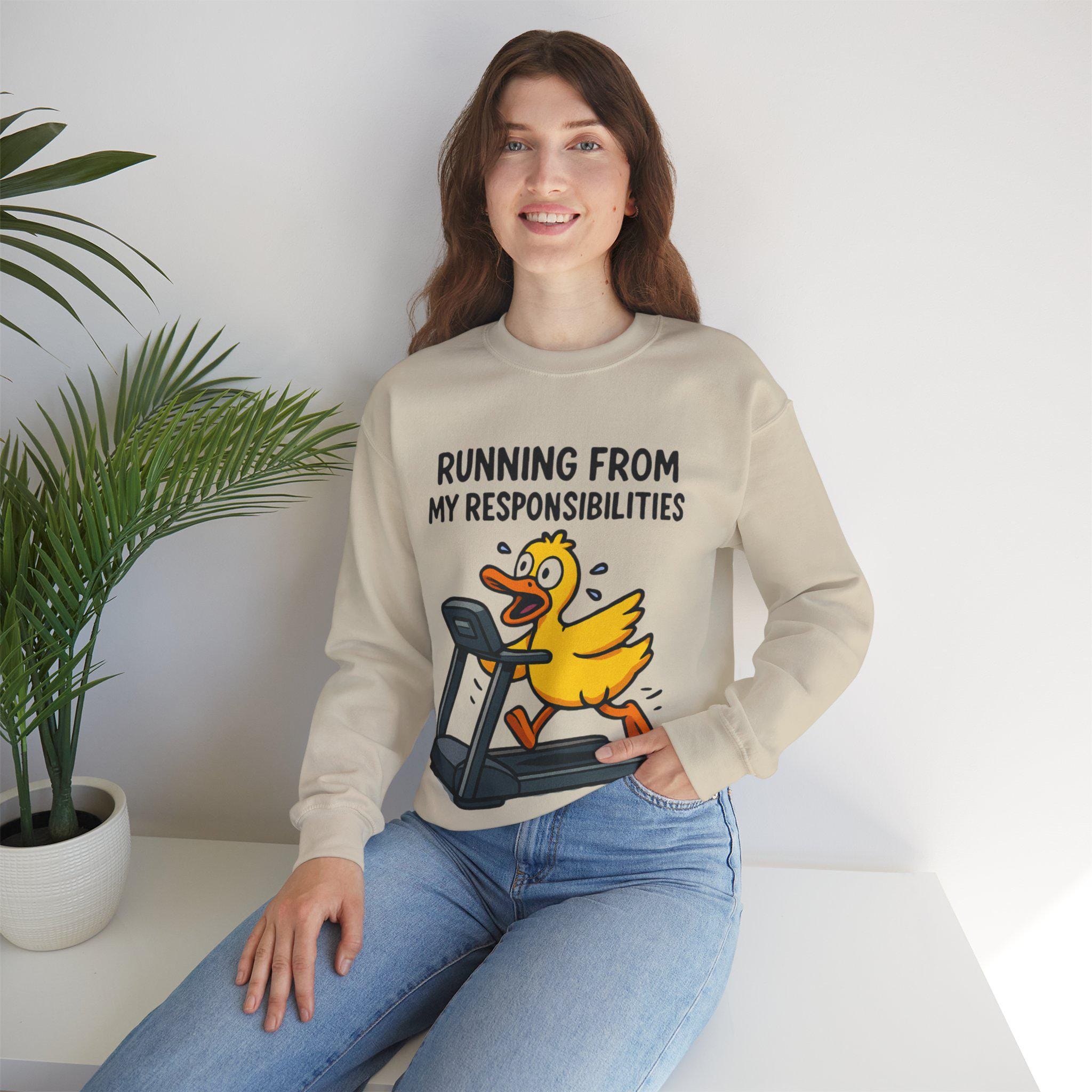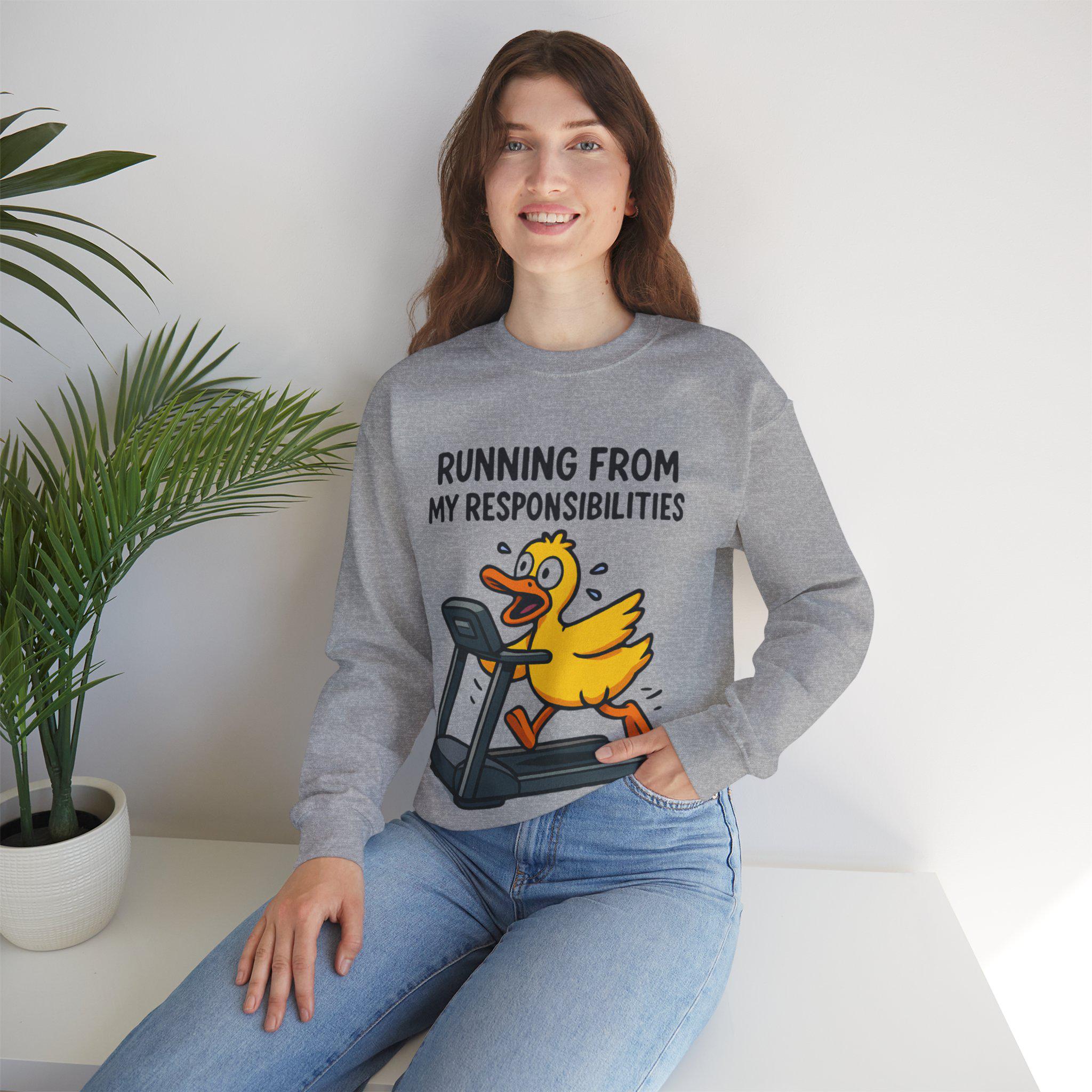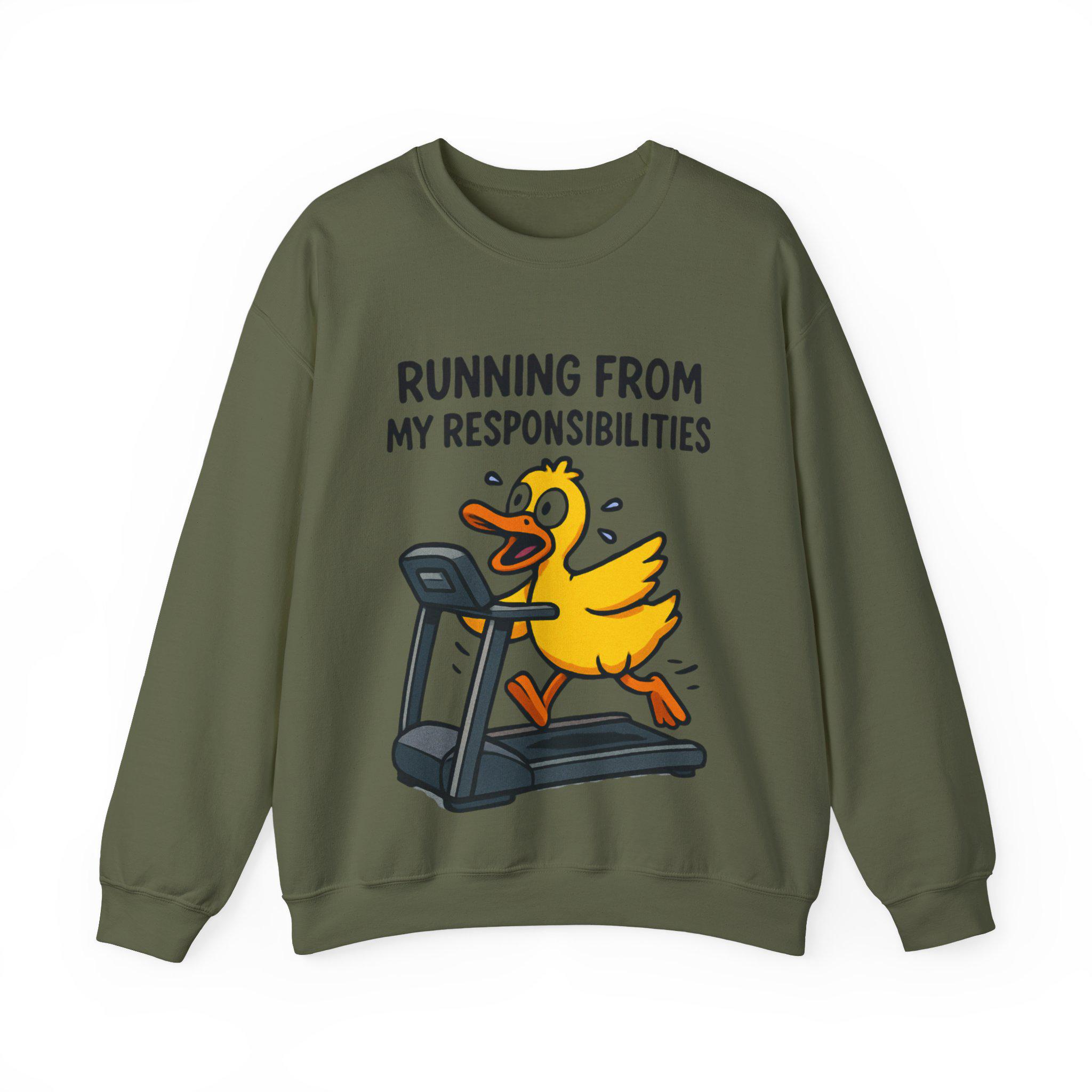 This cozy crewneck brings a wink of humor to quiet mornings and long evenings. Soft, medium-heavy fabric drapes comfortably while the cheerful duck graphic—mid-sprint on a treadmill—lets you laugh at life’s little pressure points. Wear it around the house with leggings, layer it over a tee for errands, or pull it on after a workout to warm down. The relaxed cut and resilient ribbed collar keep the shape wash after wash, and the playful design opens conversations without trying too hard. It’s for the person who balances responsibilities with ridiculousness and wants comfort that matches their sense of humor.