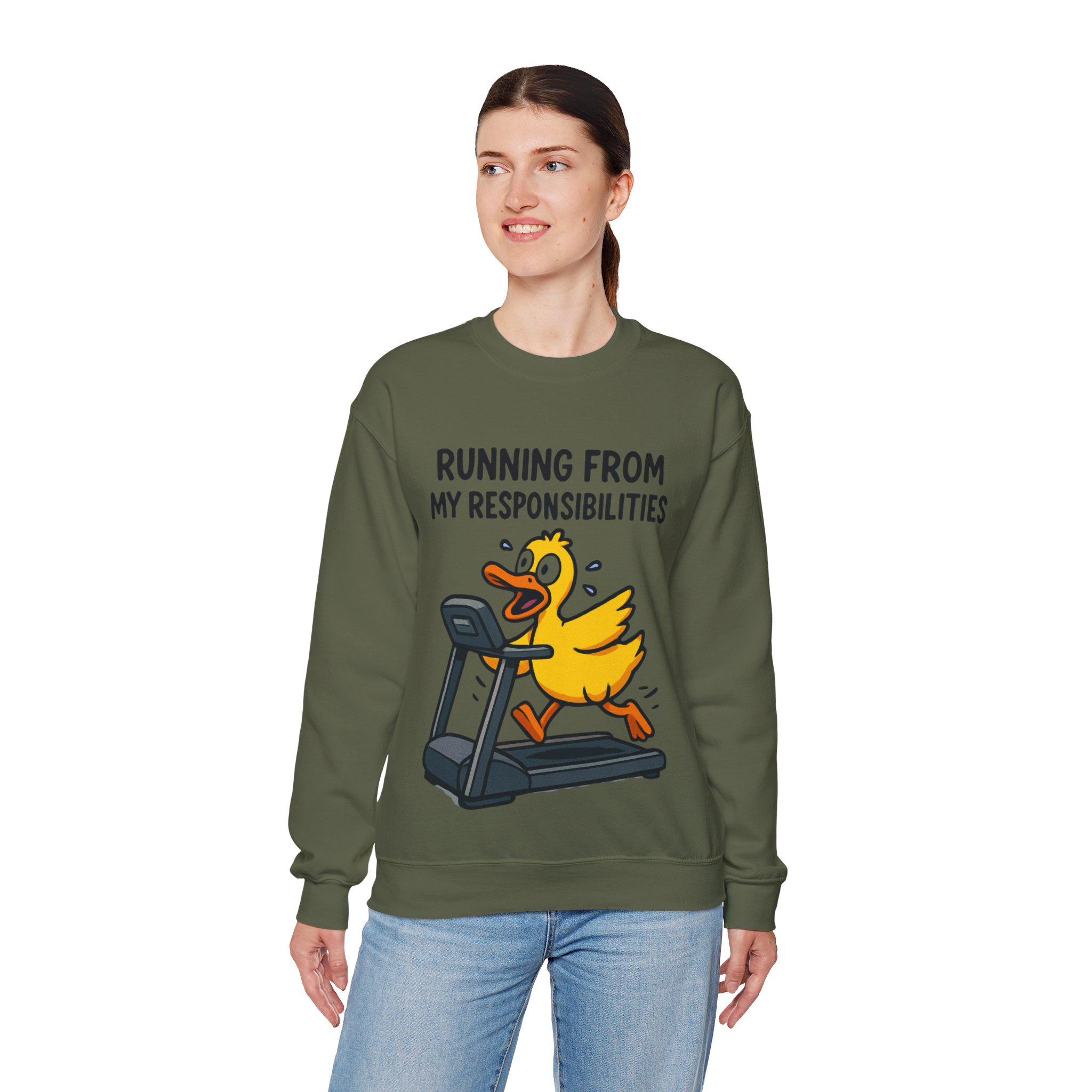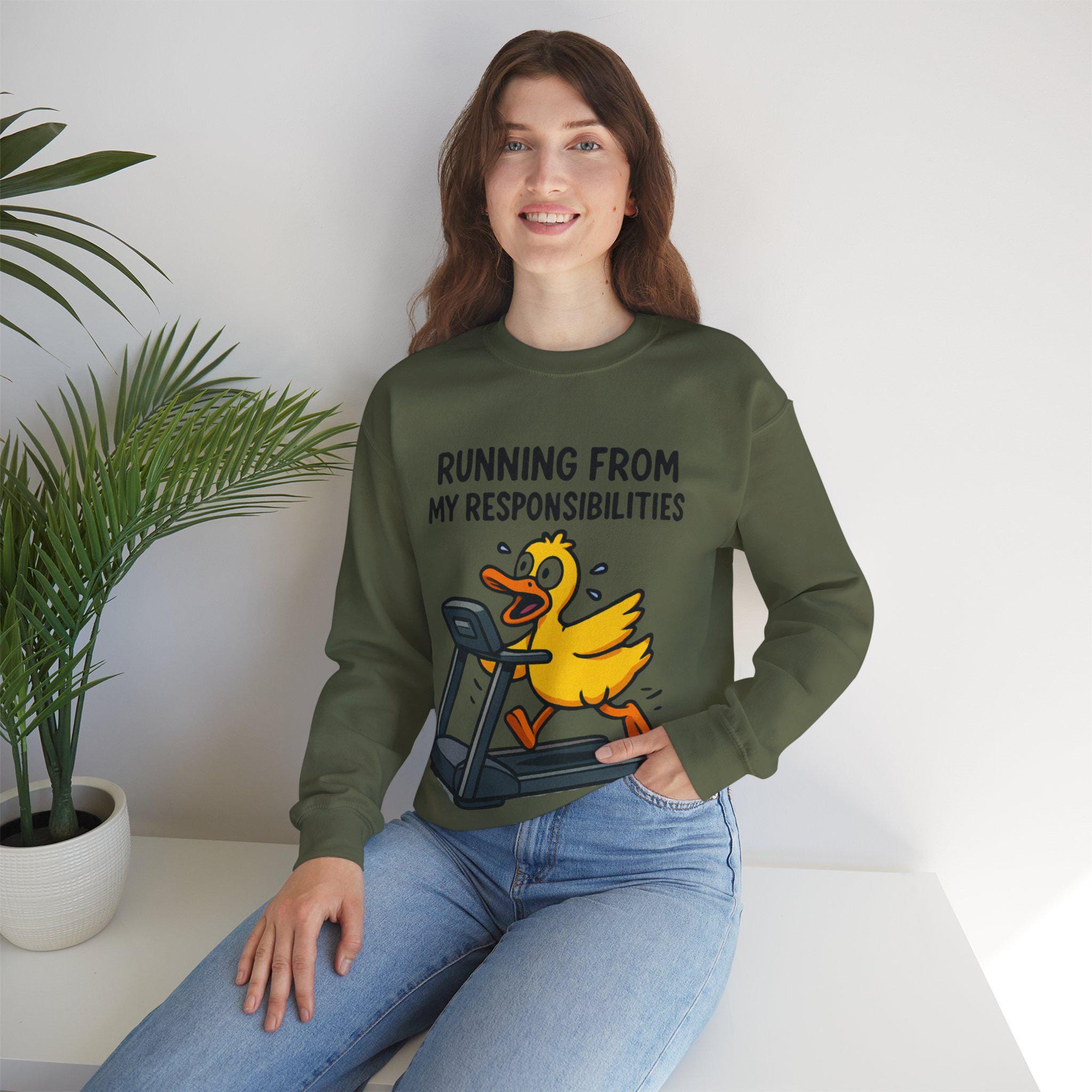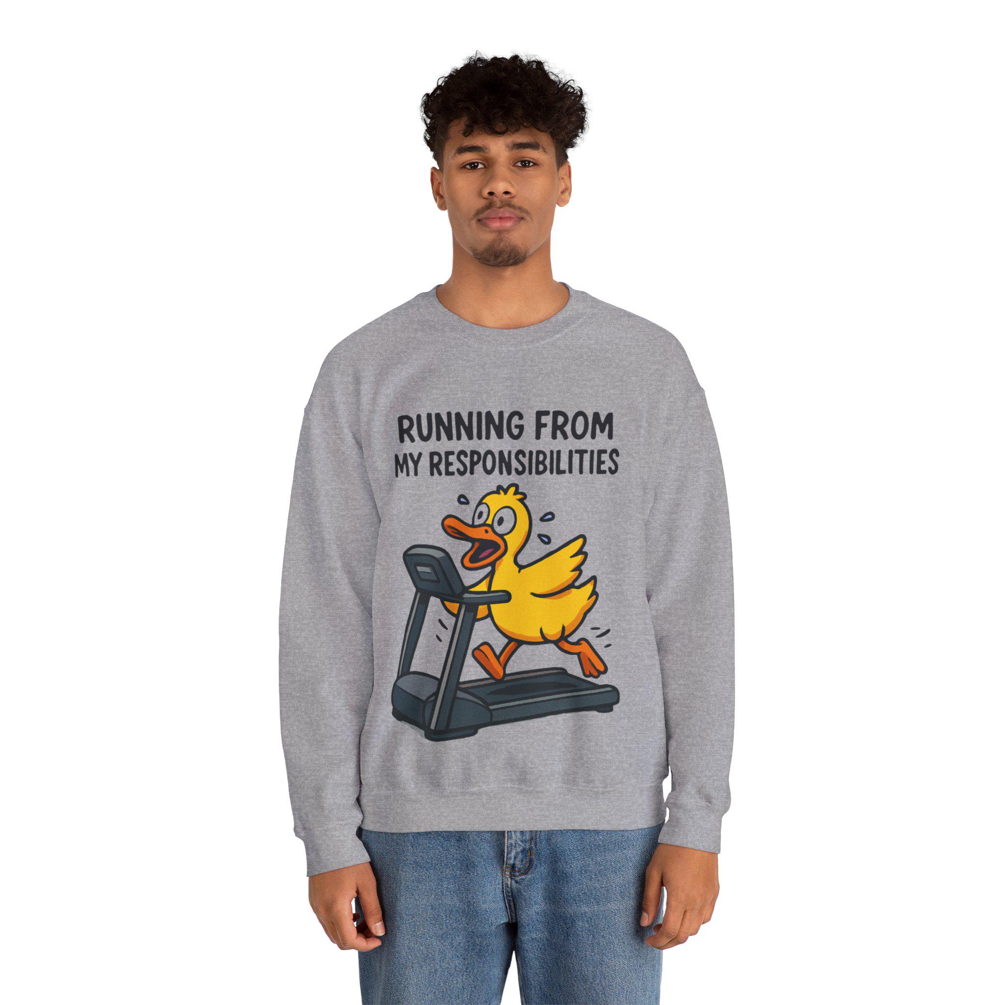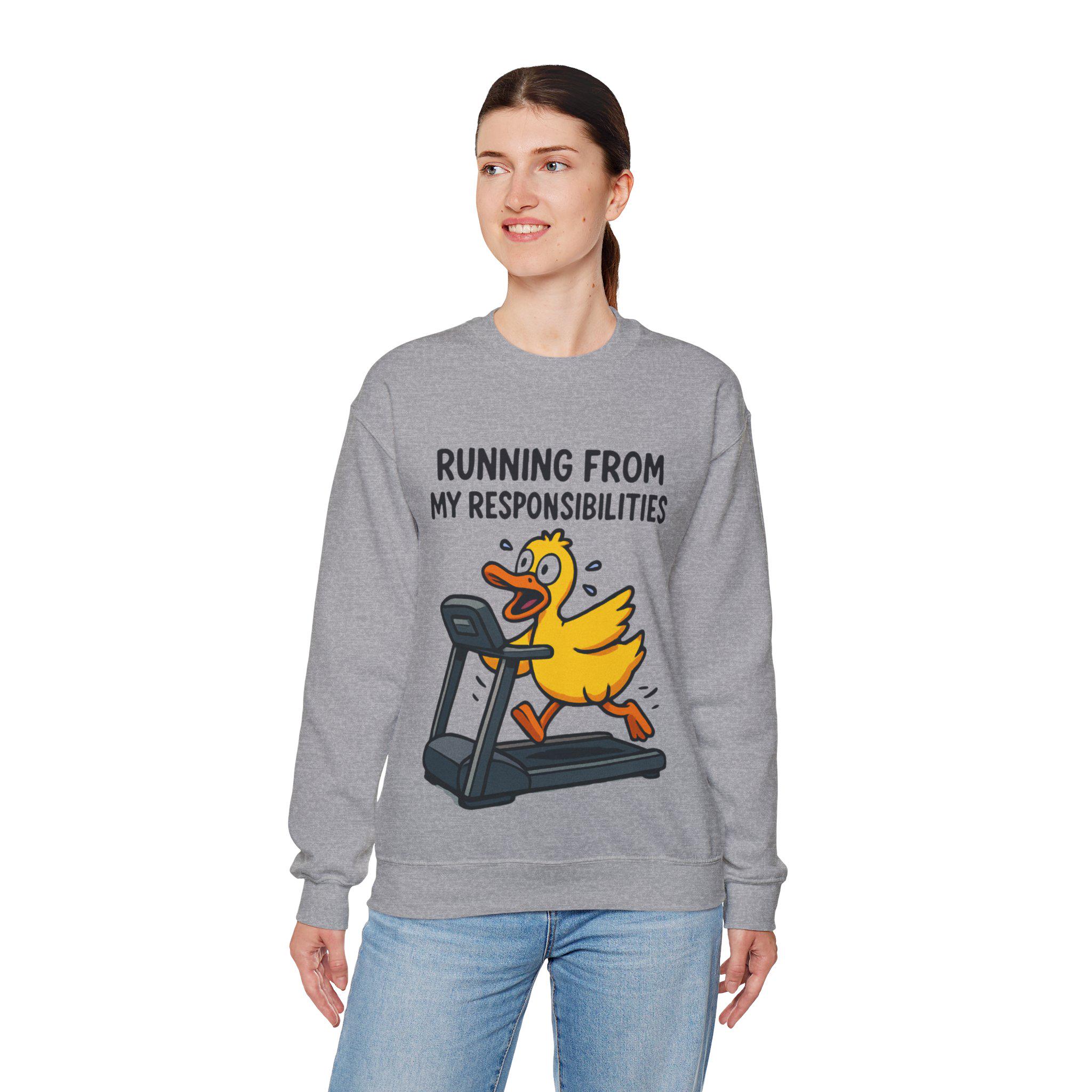 This cozy crewneck brings a wink of humor to quiet mornings and long evenings. Soft, medium-heavy fabric drapes comfortably while the cheerful duck graphic—mid-sprint on a treadmill—lets you laugh at life’s little pressure points. Wear it around the house with leggings, layer it over a tee for errands, or pull it on after a workout to warm down. The relaxed cut and resilient ribbed collar keep the shape wash after wash, and the playful design opens conversations without trying too hard. It’s for the person who balances responsibilities with ridiculousness and wants comfort that matches their sense of humor.