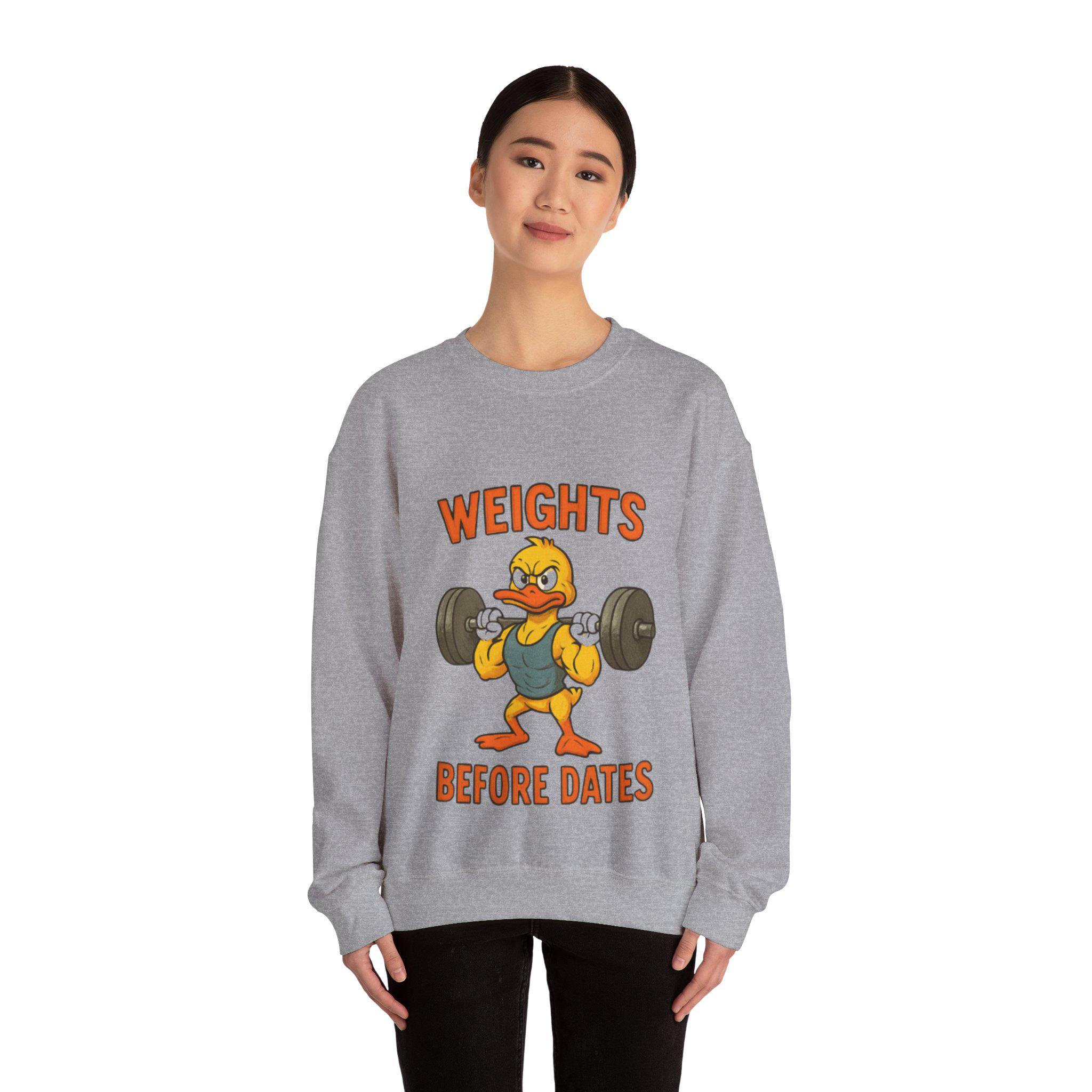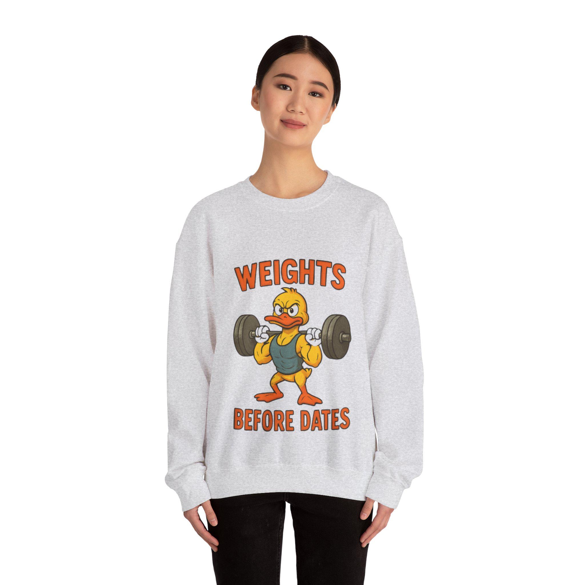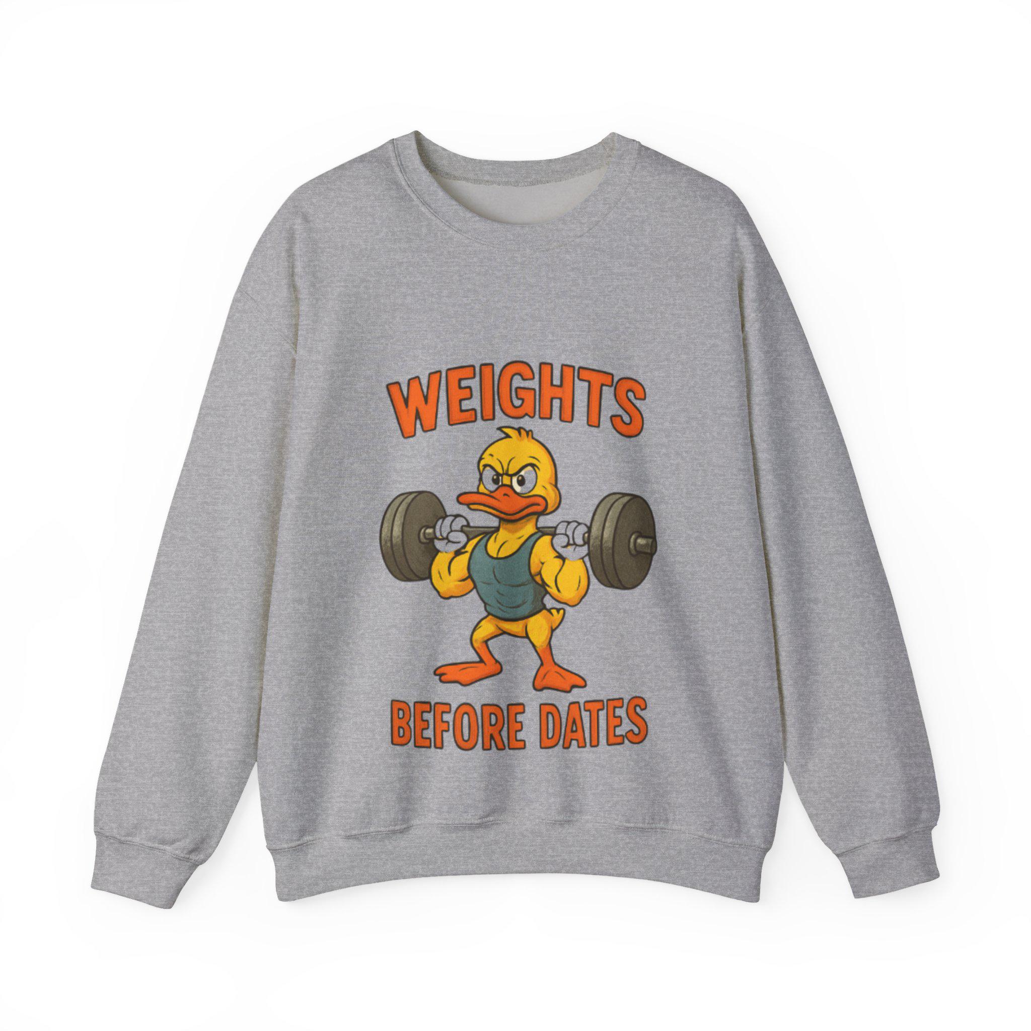 This cozy crewneck brings gym humor into everyday wear. A soft, medium-heavy cotton-poly blend holds a bold, vintage-style illustration: a determined duck hoisting a barbell beneath the cheeky slogan “WEIGHTS BEFORE DATES.” It sits with a relaxed, classic fit and clean crew neckline—an easy layer after a workout, on rest days, or for casual streetwear. Thoughtful construction (double-needle stitching, ribbed collar and cuffs, tubular knit) keeps the shape and feels like it will last through sweat sessions and laundry cycles. The light heathered fabric and crisp printed artwork make the design pop while staying comfortable and approachable. Built with ethically sourced U.S. cotton and OEKO-TEX dyes, this sweatshirt pairs gym confidence with everyday comfort.