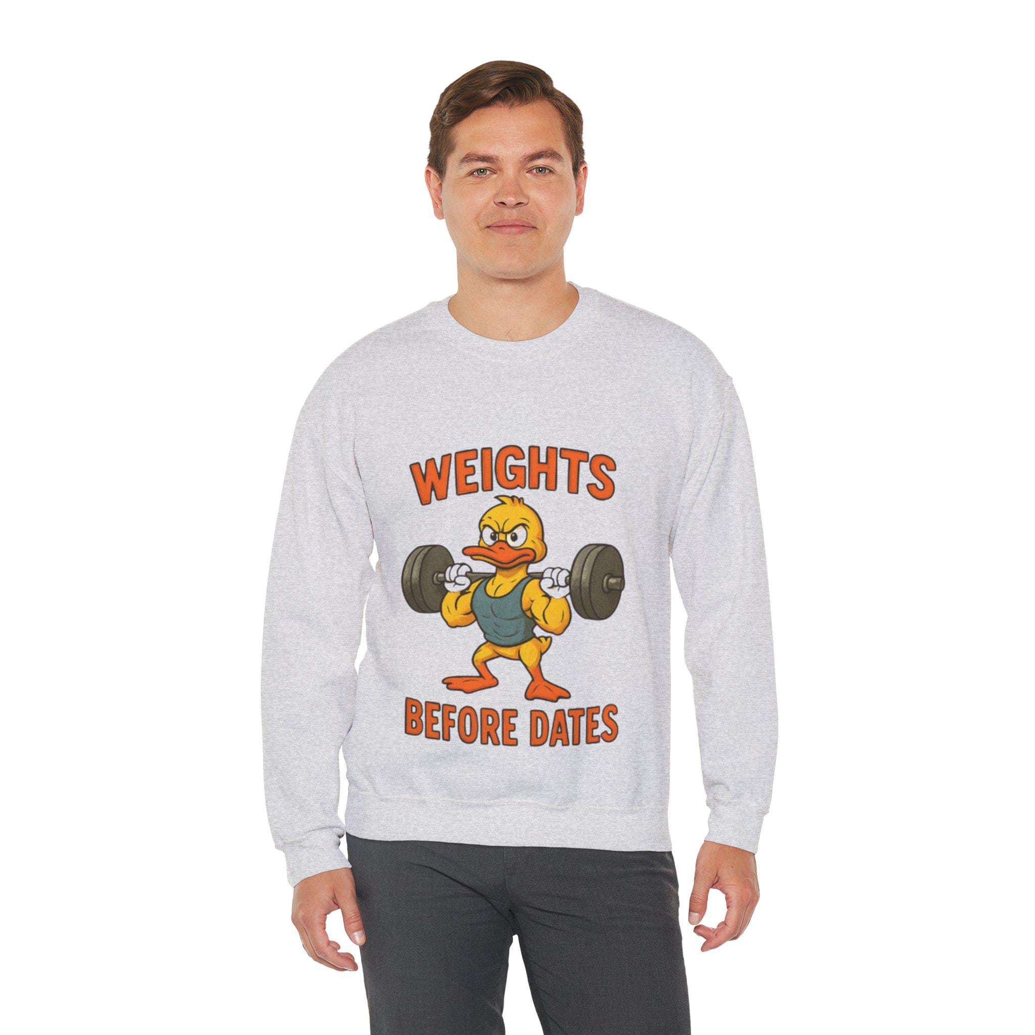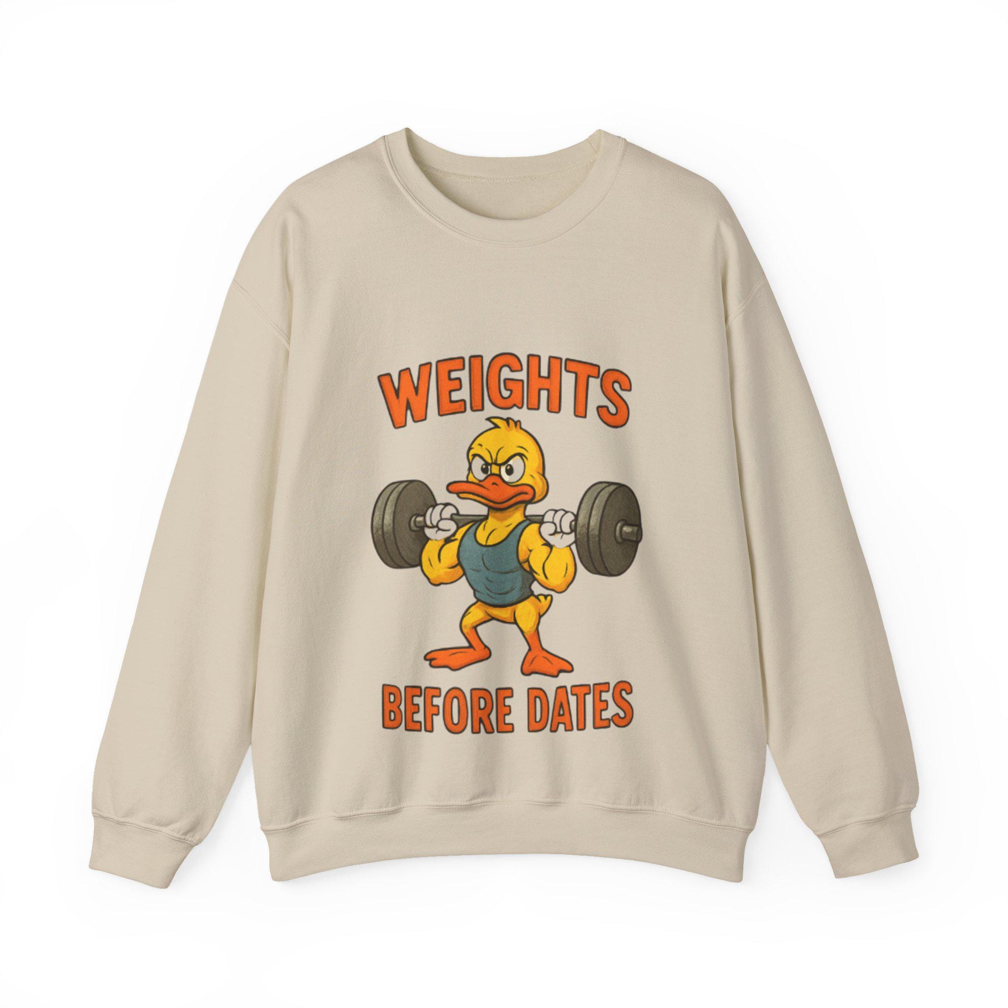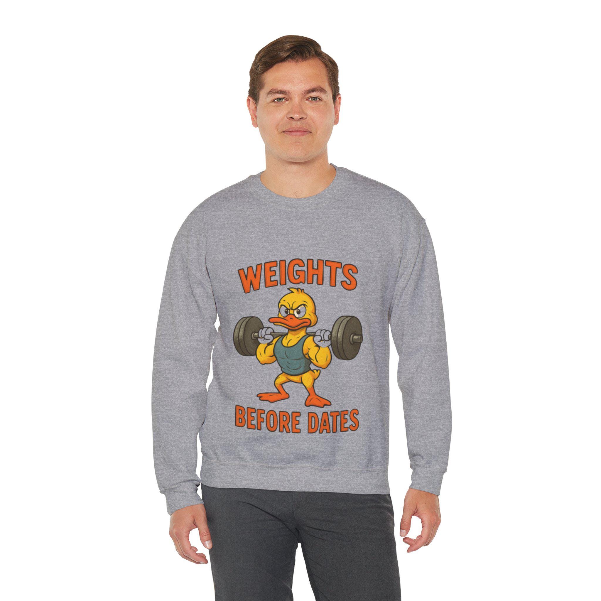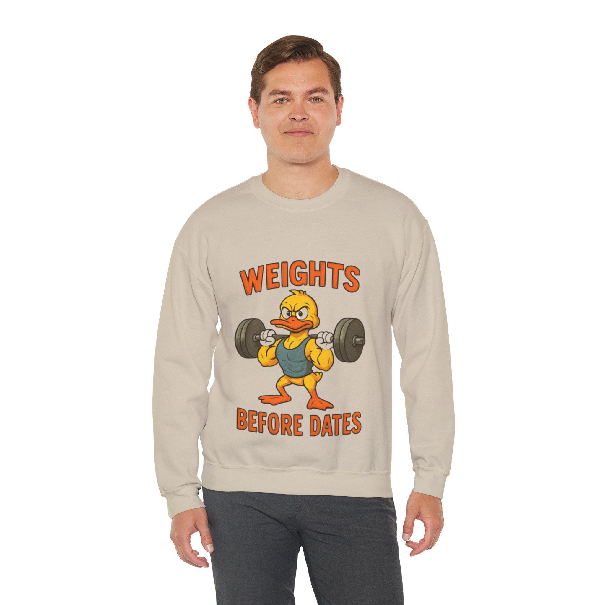 This cozy crewneck brings gym humor into everyday wear. A soft, medium-heavy cotton-poly blend holds a bold, vintage-style illustration: a determined duck hoisting a barbell beneath the cheeky slogan “WEIGHTS BEFORE DATES.” It sits with a relaxed, classic fit and clean crew neckline—an easy layer after a workout, on rest days, or for casual streetwear. Thoughtful construction (double-needle stitching, ribbed collar and cuffs, tubular knit) keeps the shape and feels like it will last through sweat sessions and laundry cycles. The light heathered fabric and crisp printed artwork make the design pop while staying comfortable and approachable. Built with ethically sourced U.S. cotton and OEKO-TEX dyes, this sweatshirt pairs gym confidence with everyday comfort.