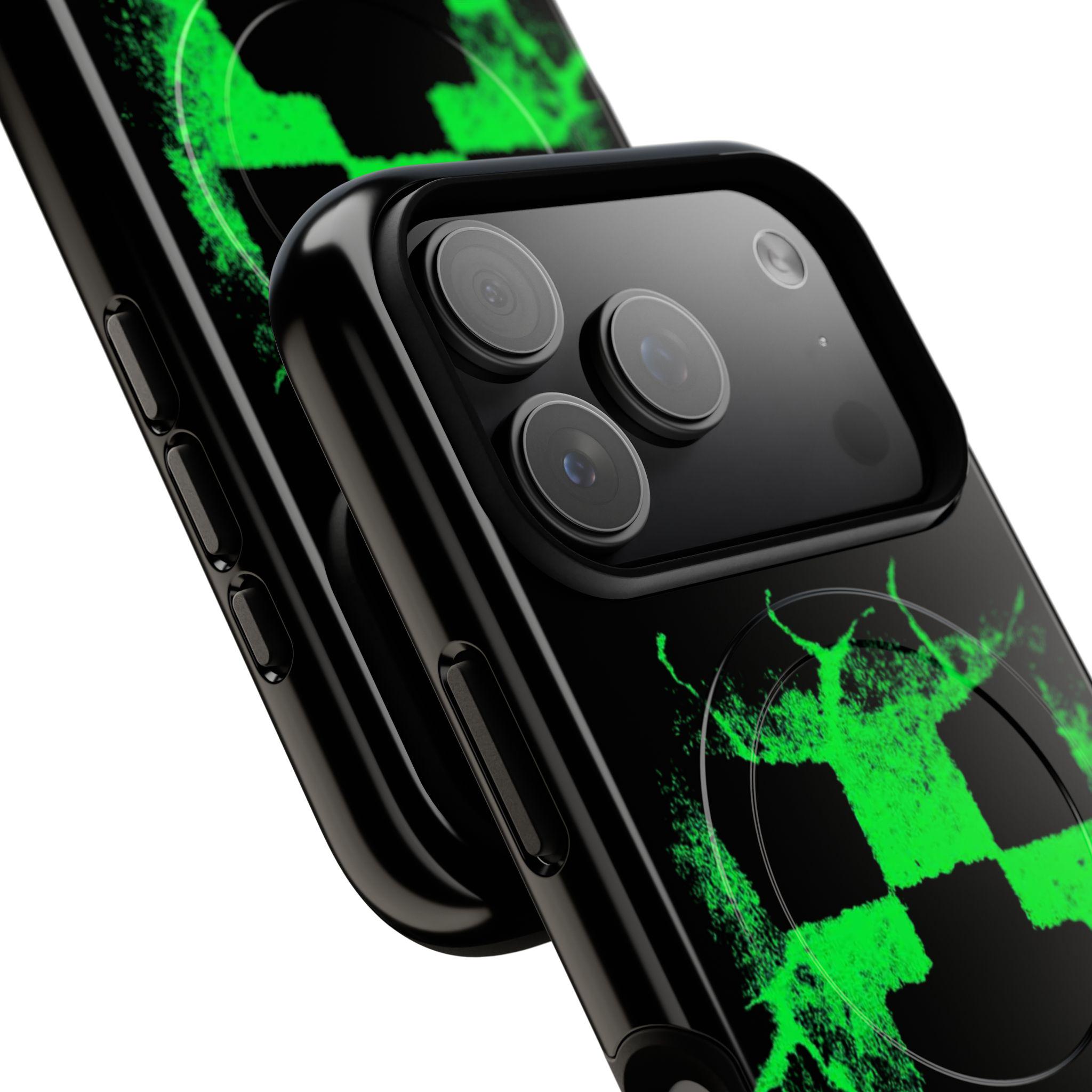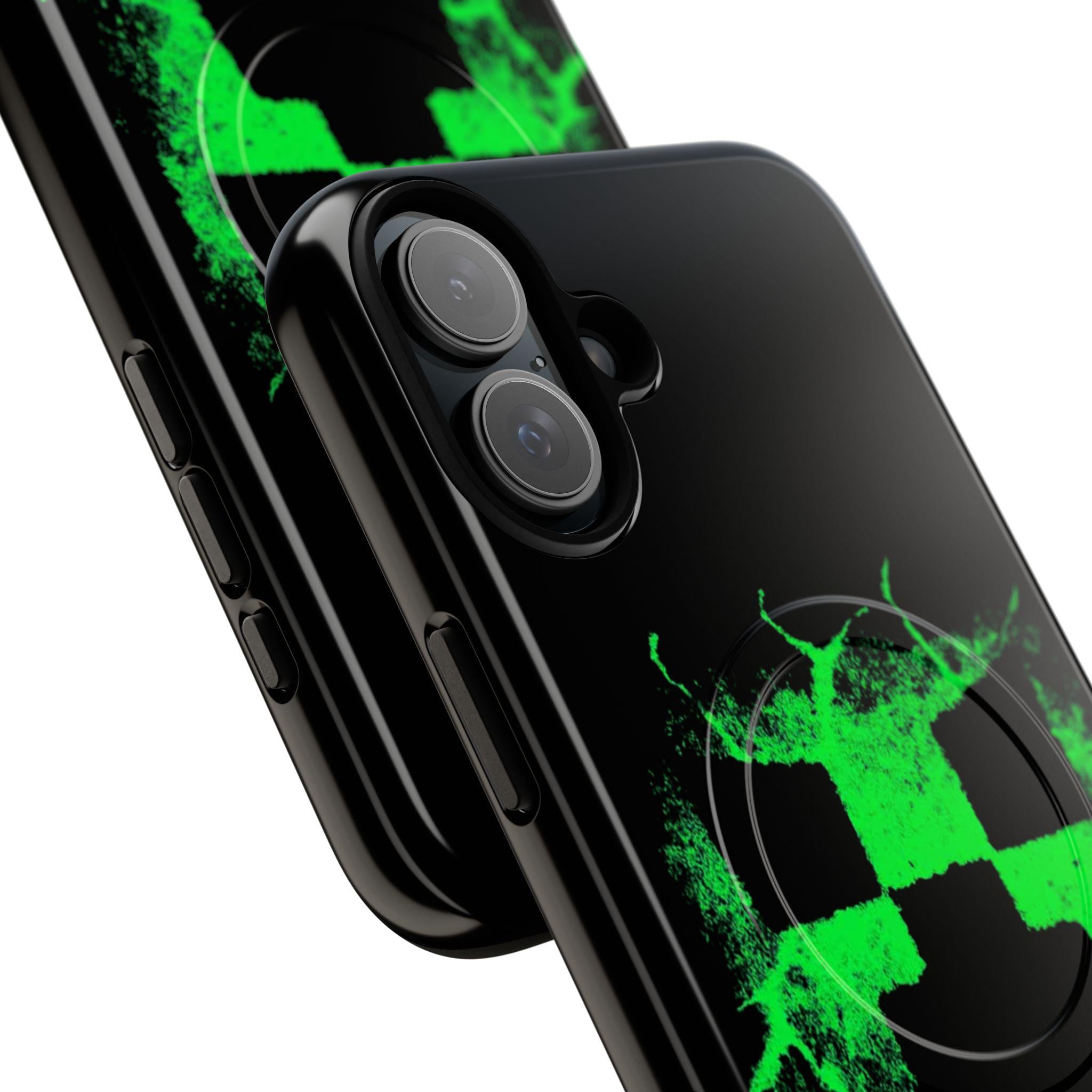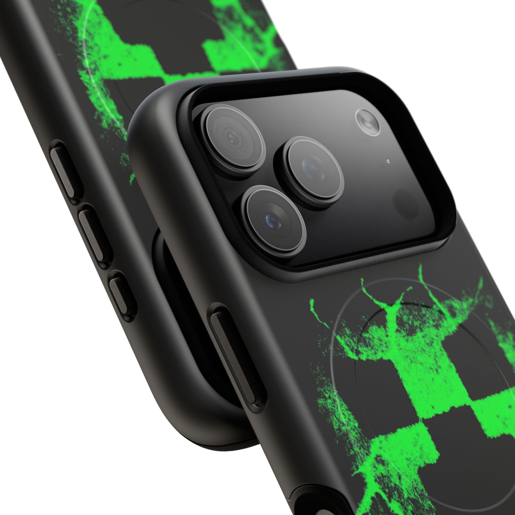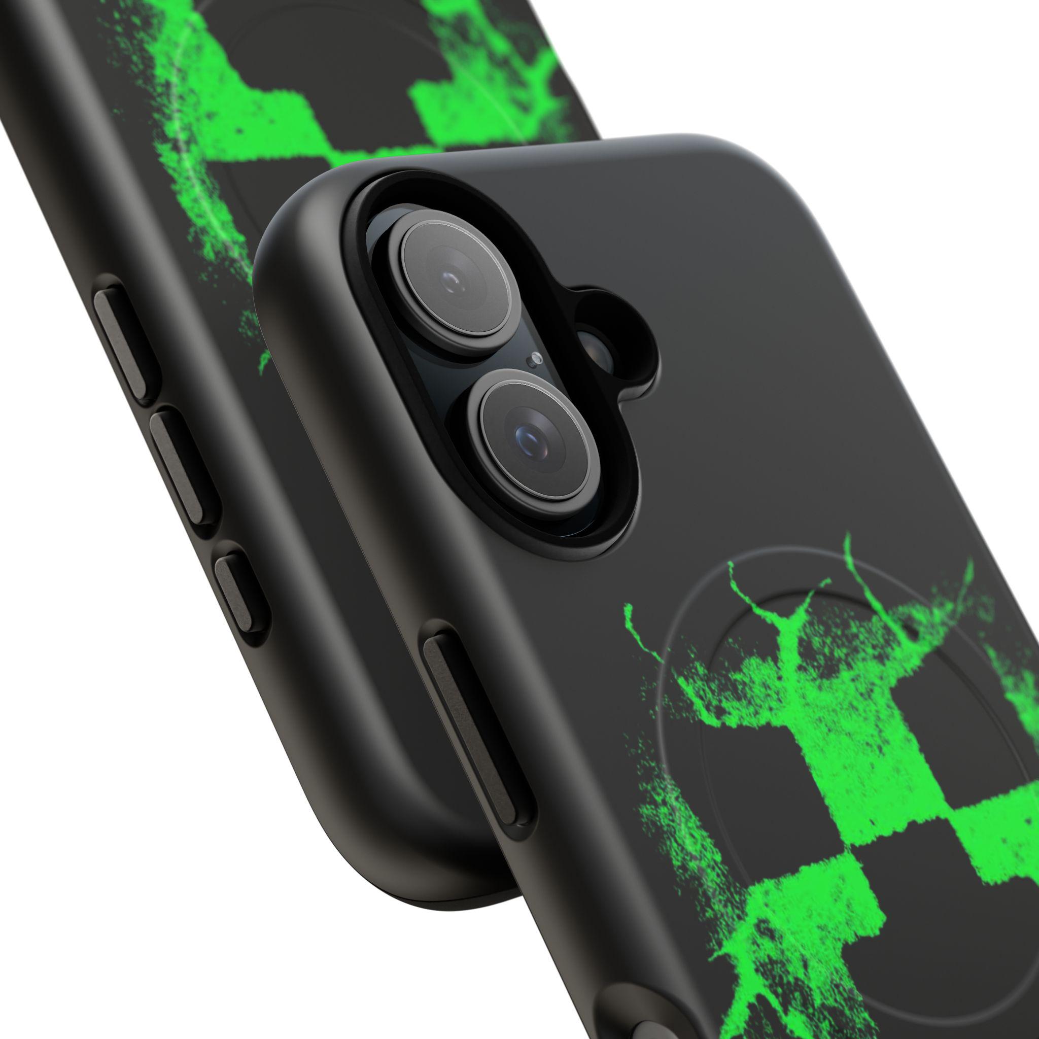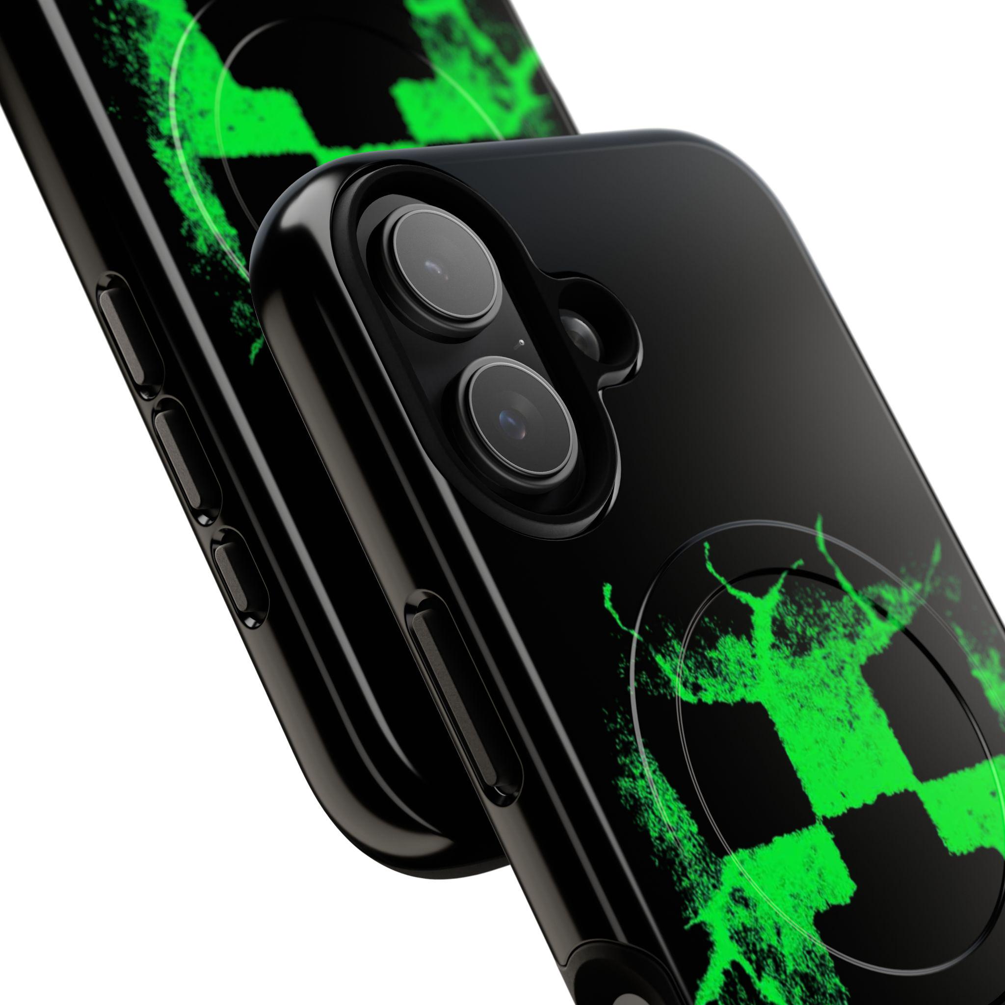 This tough magnetic phone case brings bold, gamer-ready style to everyday protection. The striking neon-green pixelated skull motif bursts across a glossy black shell, giving devices a charged, high-energy look. Dual-layer construction pairs a rigid polycarbonate exterior with a soft TPU silicone liner to absorb shocks and resist impact — keeping corners and camera rings safe without adding bulk. A full-wrap 3D print preserves vivid color and sharp detail, while the MagSafe-compatible magnetic module and precise port cutouts keep your accessories and charging routine seamless. Built for adults who want rugged reliability with a statement-making edge, it fits into hands-on, screen-first lives with confident durability.