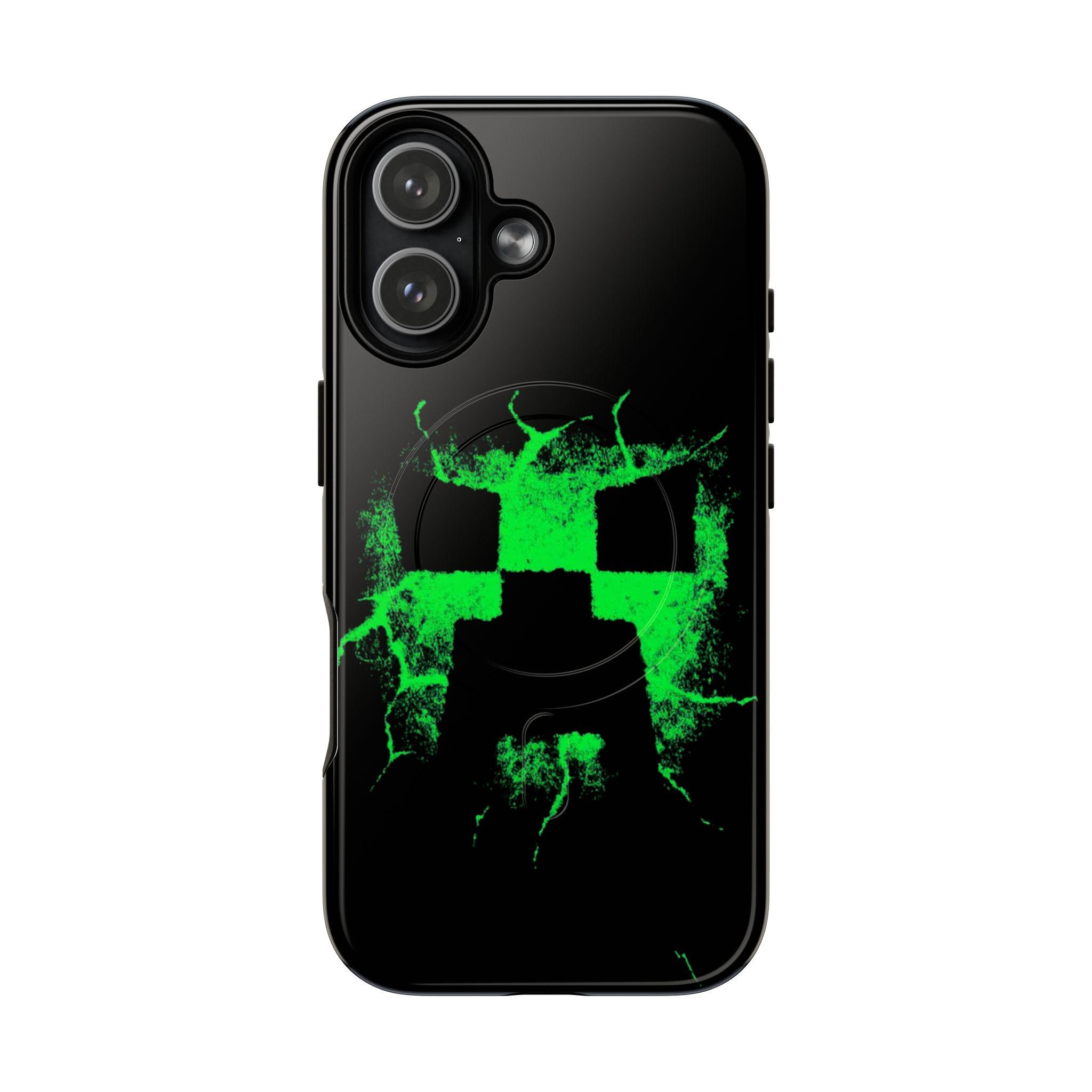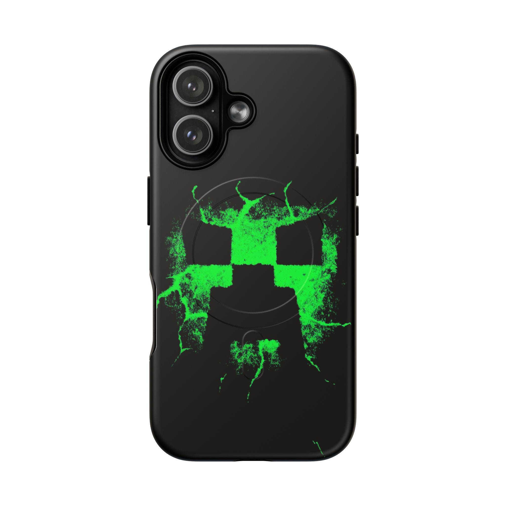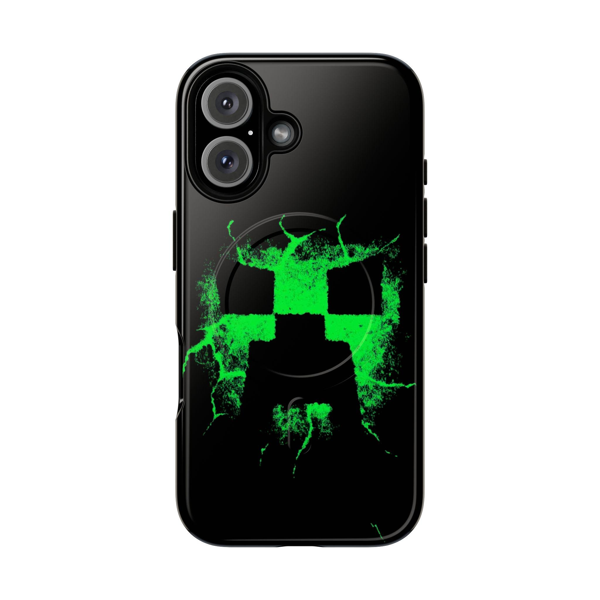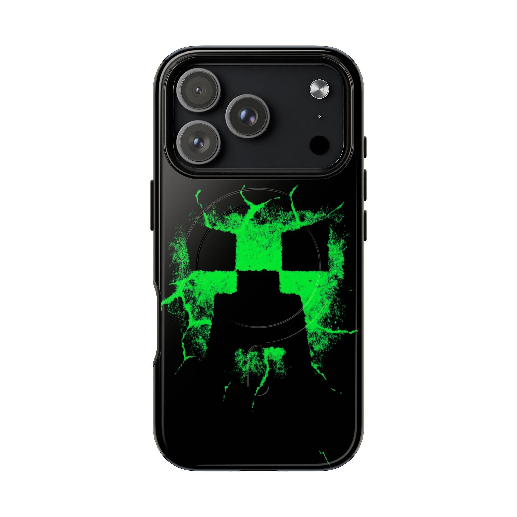 This tough magnetic phone case brings bold, gamer-ready style to everyday protection. The striking neon-green pixelated skull motif bursts across a glossy black shell, giving devices a charged, high-energy look. Dual-layer construction pairs a rigid polycarbonate exterior with a soft TPU silicone liner to absorb shocks and resist impact — keeping corners and camera rings safe without adding bulk. A full-wrap 3D print preserves vivid color and sharp detail, while the MagSafe-compatible magnetic module and precise port cutouts keep your accessories and charging routine seamless. Built for adults who want rugged reliability with a statement-making edge, it fits into hands-on, screen-first lives with confident durability.