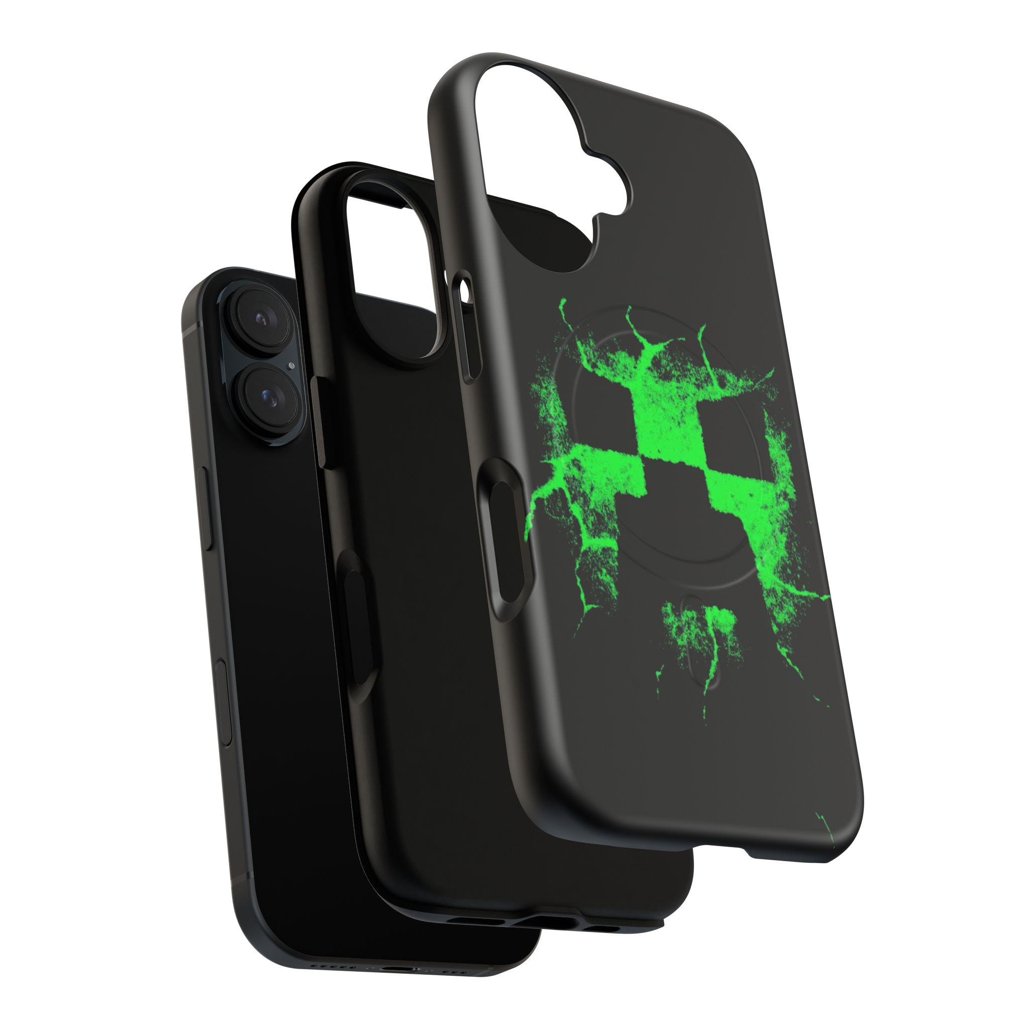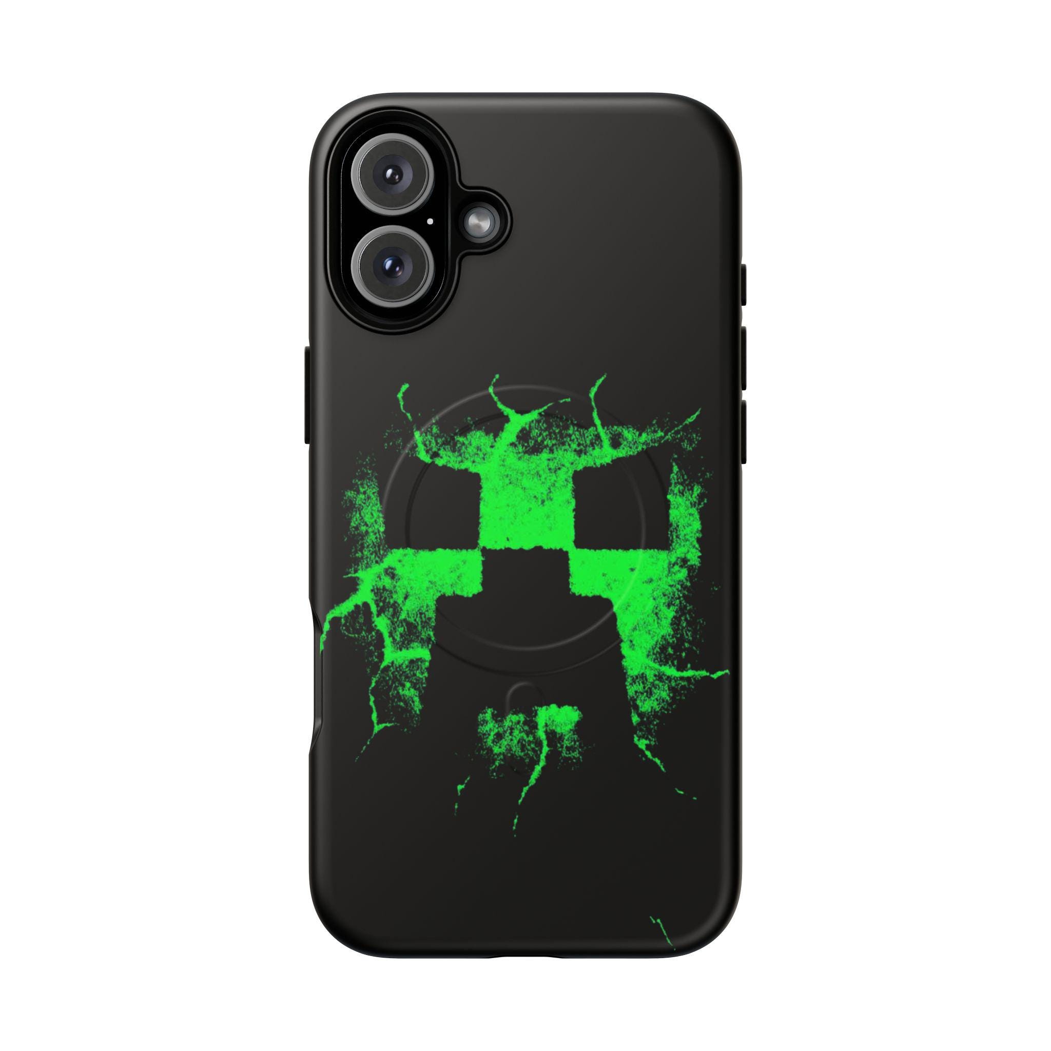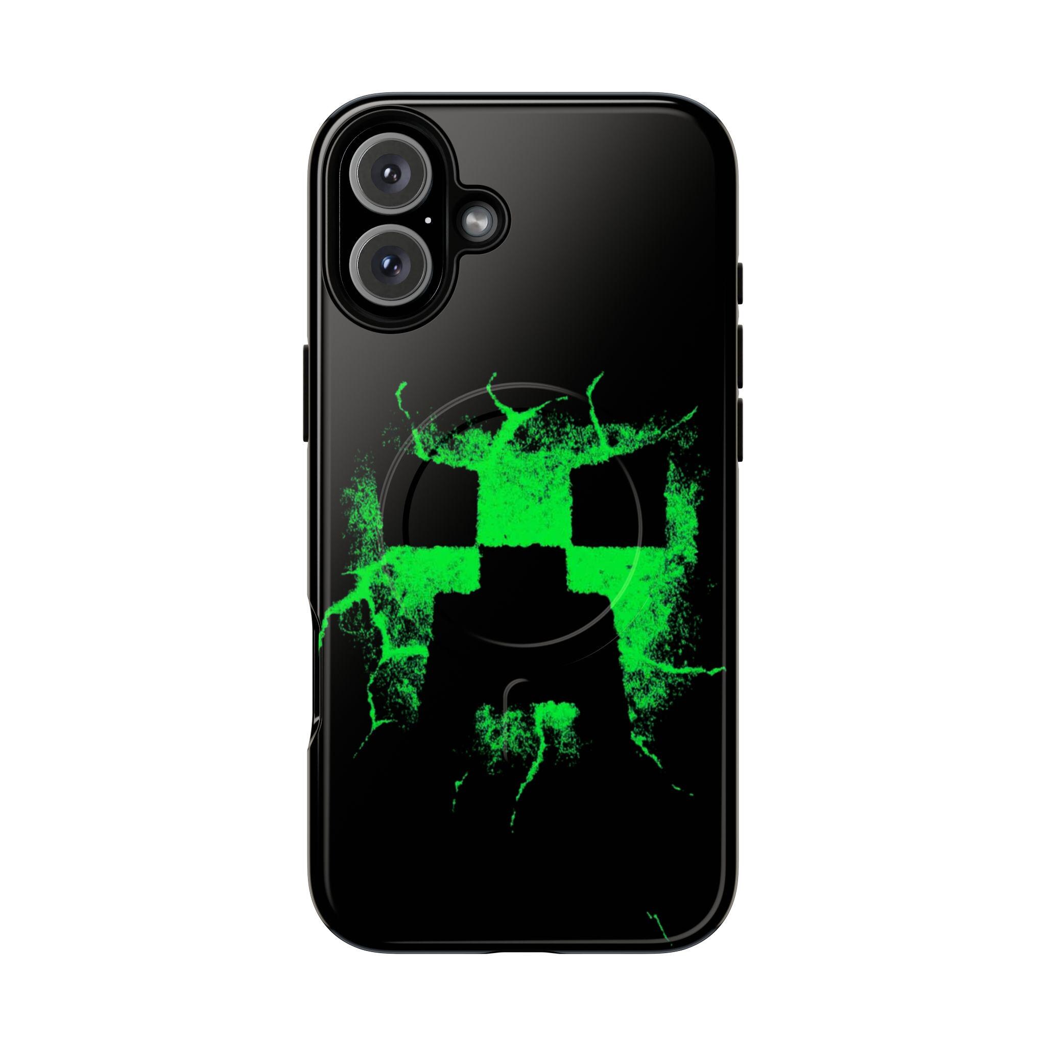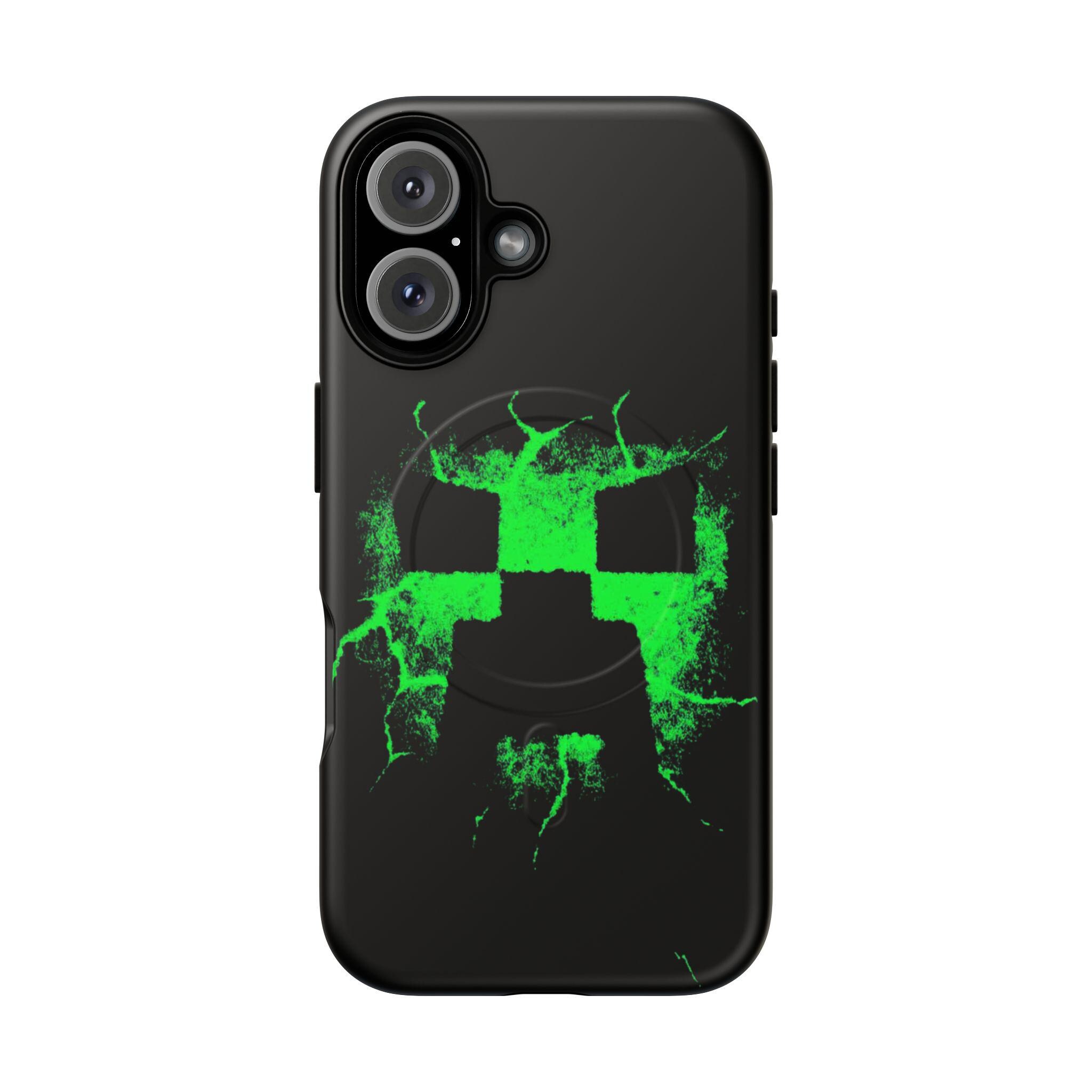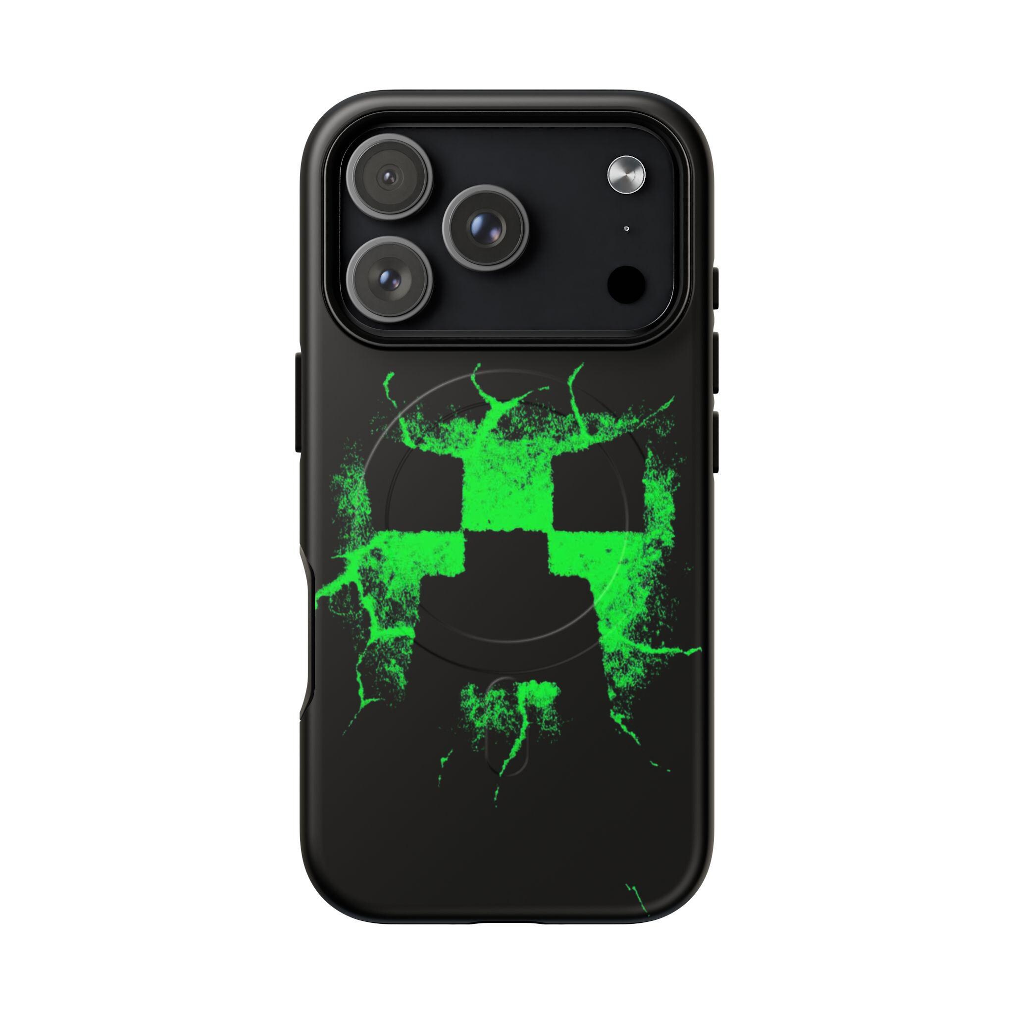 This tough magnetic phone case brings bold, gamer-ready style to everyday protection. The striking neon-green pixelated skull motif bursts across a glossy black shell, giving devices a charged, high-energy look. Dual-layer construction pairs a rigid polycarbonate exterior with a soft TPU silicone liner to absorb shocks and resist impact — keeping corners and camera rings safe without adding bulk. A full-wrap 3D print preserves vivid color and sharp detail, while the MagSafe-compatible magnetic module and precise port cutouts keep your accessories and charging routine seamless. Built for adults who want rugged reliability with a statement-making edge, it fits into hands-on, screen-first lives with confident durability.
