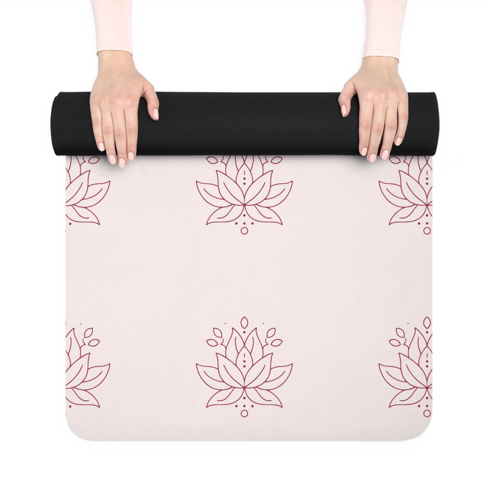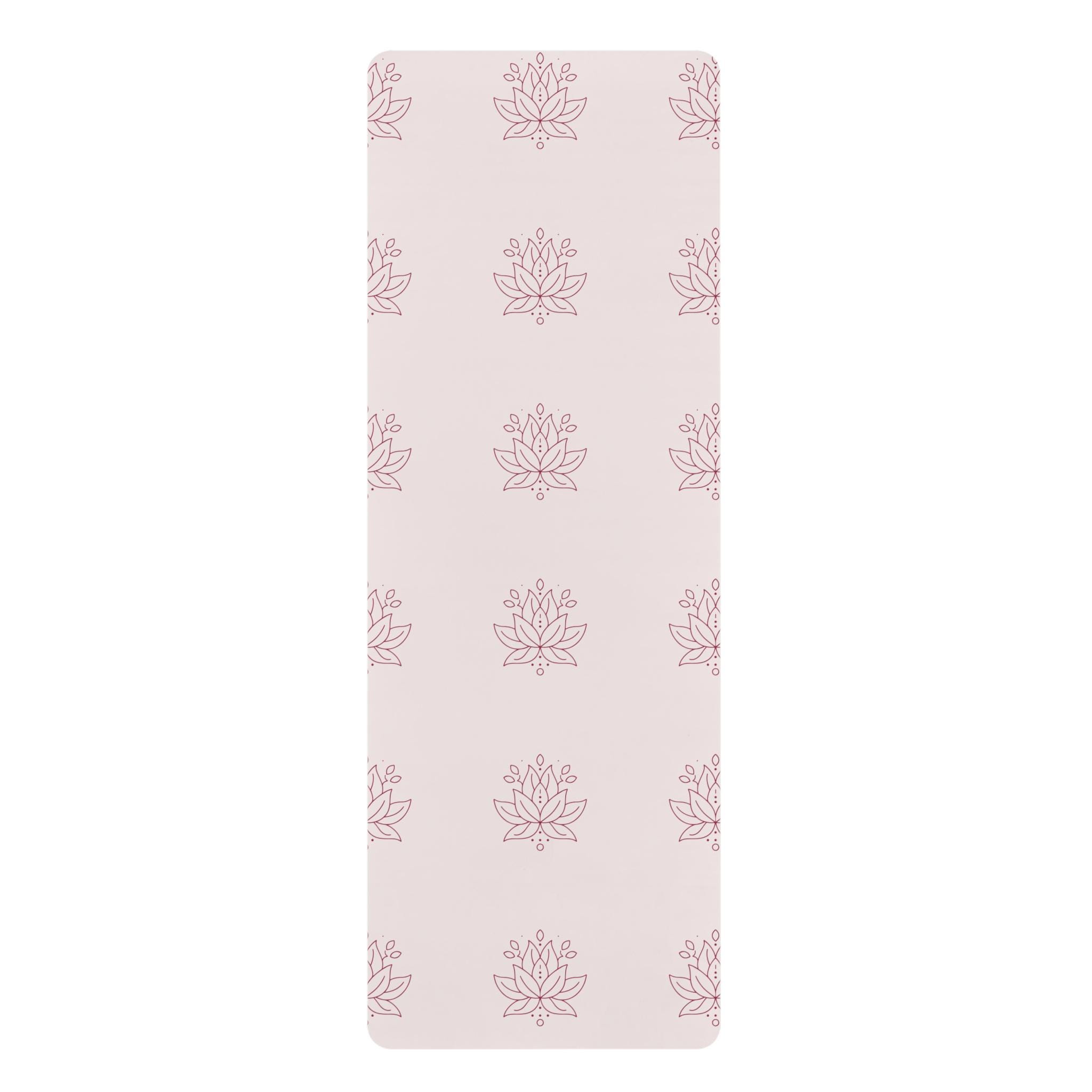 Soft blush and simple lotus linework meet steady grip—this yoga mat brings quiet focus to your practice. The microfiber suede top feels gentle against palms and bare feet while the natural rubber underside keeps the mat anchored through slow holds and flowing vinyasas. At 3mm thickness and a lightweight build, it rolls up easily and slips into the included black polyester strap for trips to class or a morning stretch on the balcony. The subtle edge-to-edge lotus pattern and pale palette create a calm surface that fades into sunlight less quickly when cared for—store away from direct sun to keep colors muted and peaceful.