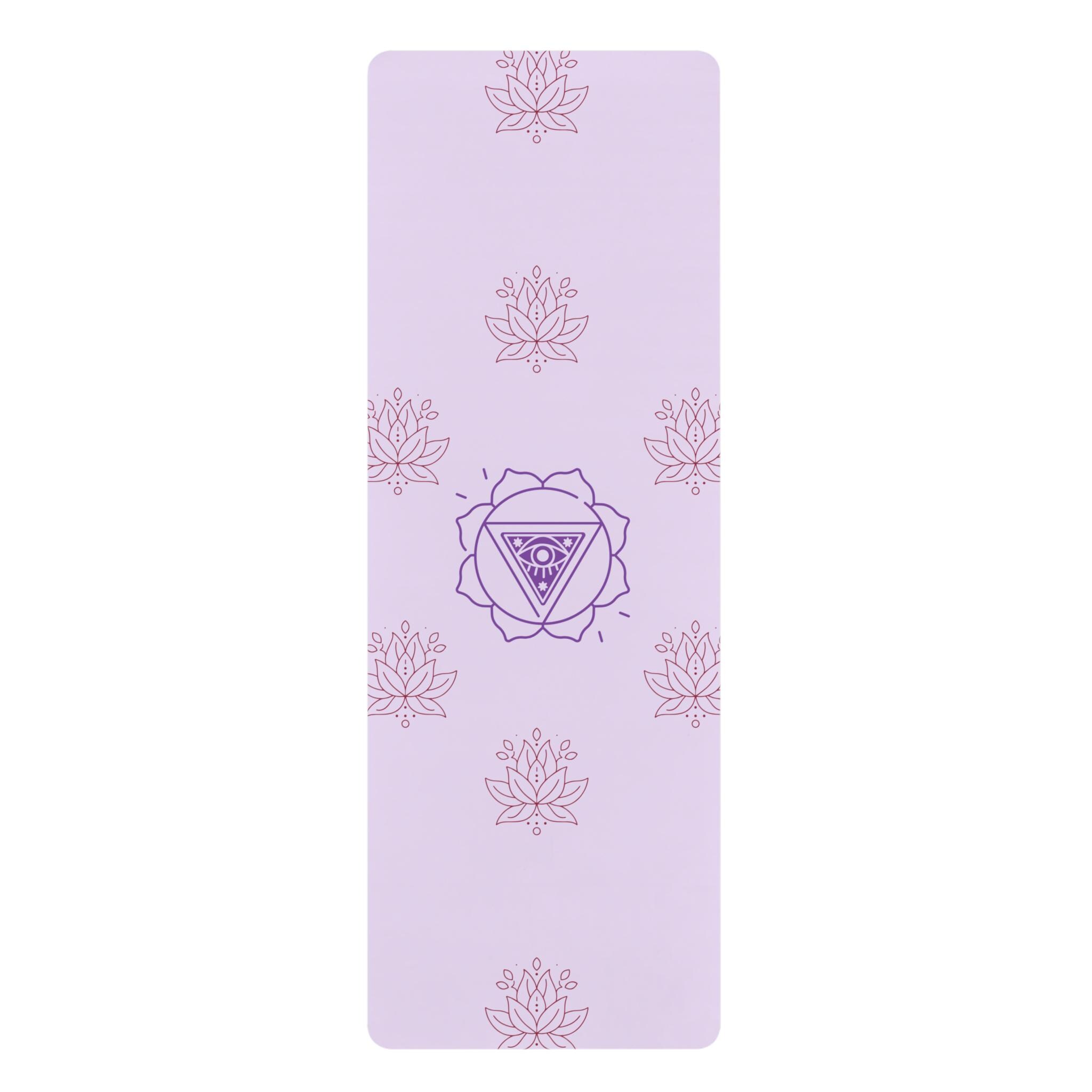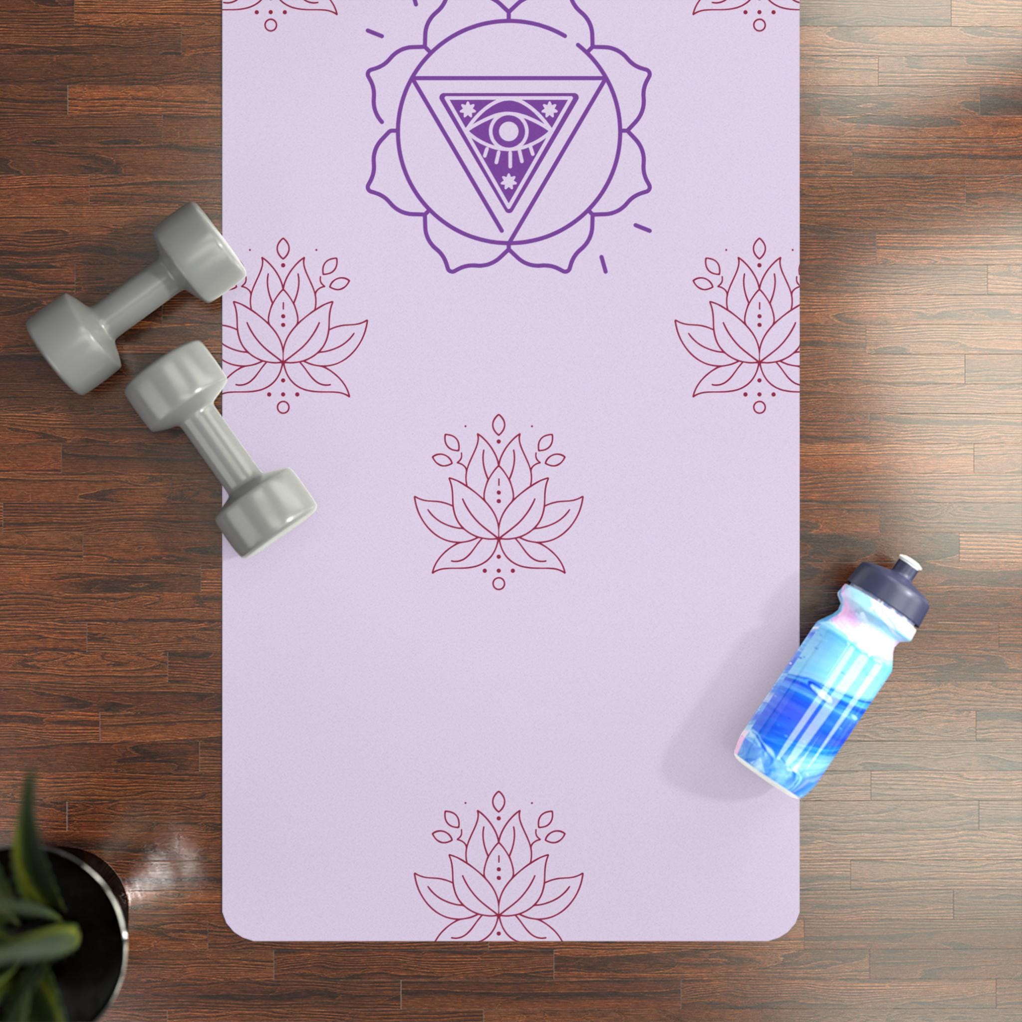 Soft lavender hues and delicate lotus motifs invite a quiet, focused practice. This rubber yoga mat lays down a gentle, suede-like surface under your palms and feet while the natural rubber base grips the floor so your flow stays steady. At 3mm thickness it’s light and travel-friendly but still cushions joints during seated poses. The subtle chakra-inspired emblem at center helps anchor attention during breath work and meditation. Roll it up with the included black carrying strap and take your practice to the studio, a sunlit balcony, or a calm corner at home — just keep it from long exposure to direct sunlight to preserve the print’s vibrancy.