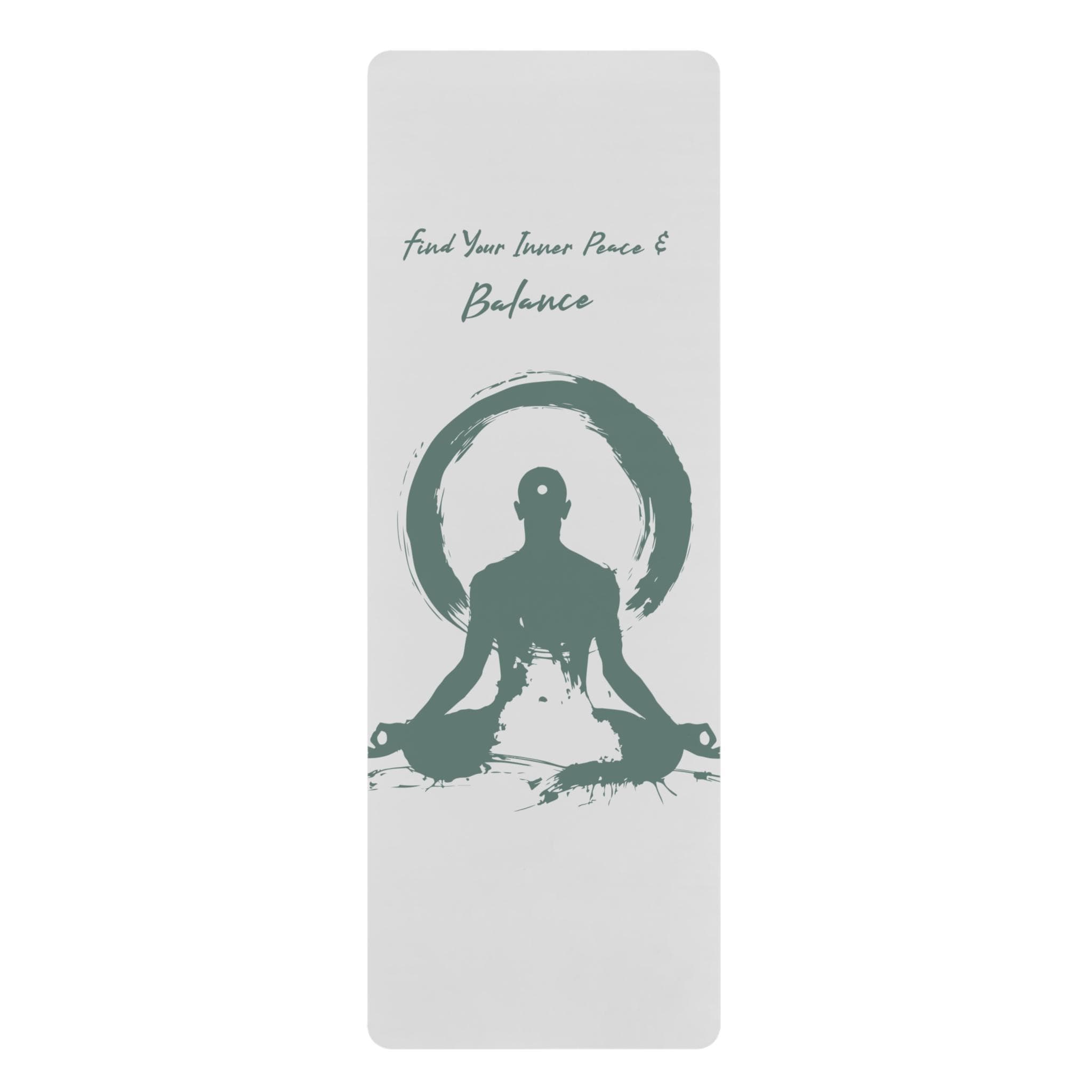 Find calm in every breath. This lightweight rubber yoga mat pairs a soft microfiber suede top with a natural rubber anti-slip base to keep your practice steady, whether in a quiet studio or on a sunlit balcony. The muted sage silhouette of a seated meditator beneath a hand-brushed enso ring and the gentle message “Find Your Inner Peace & Balance” bring a subtle, grounding energy to each pose. At 24" x 70" and 3mm thick, it’s slim enough to carry yet cushioned for seated work, and the included black polyester strap makes transport effortless. Keep it out of direct sunlight to preserve the colors and let the peaceful design settle into your daily ritual.