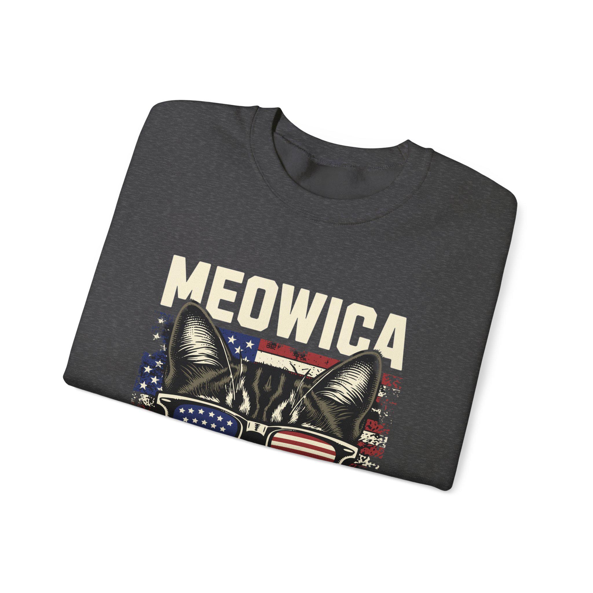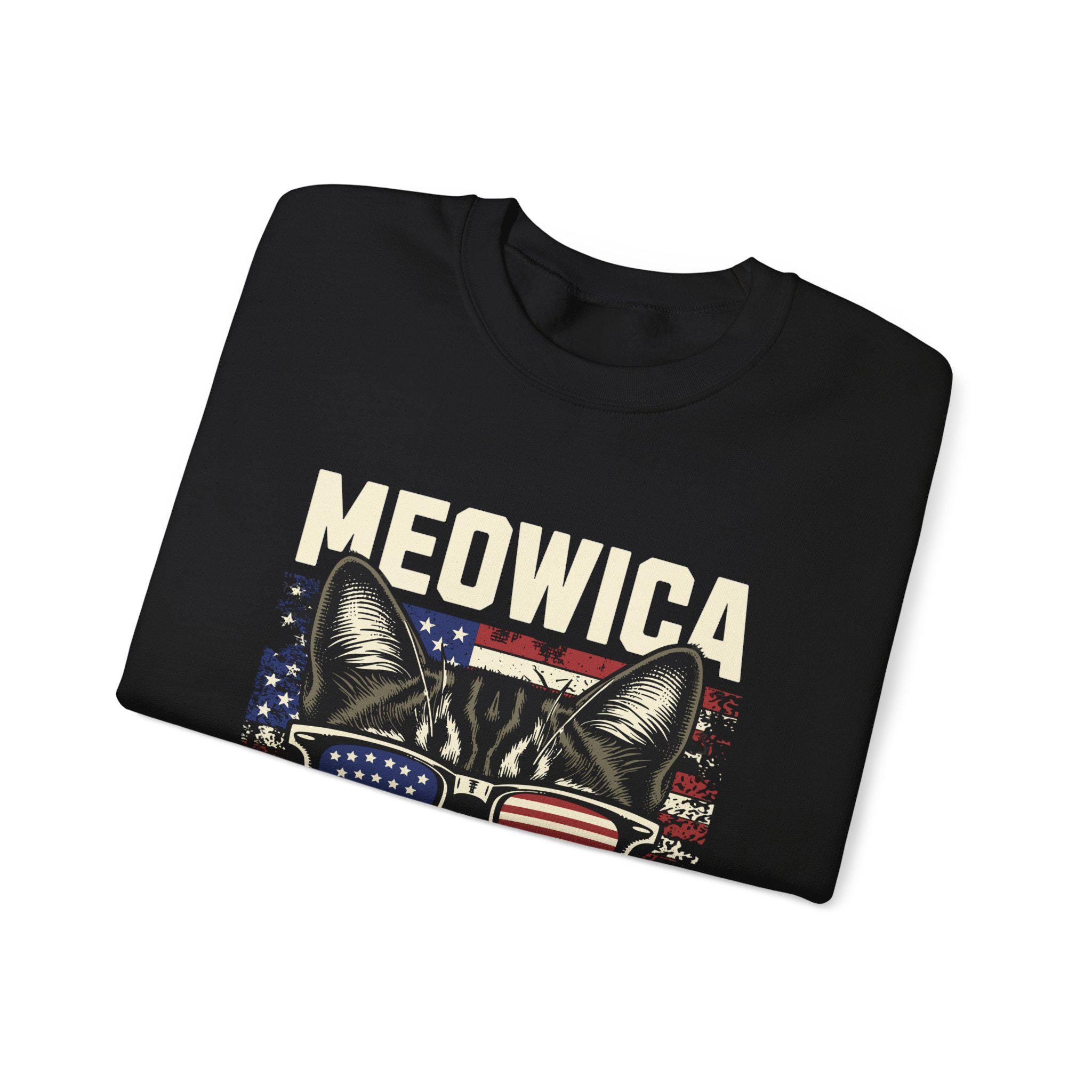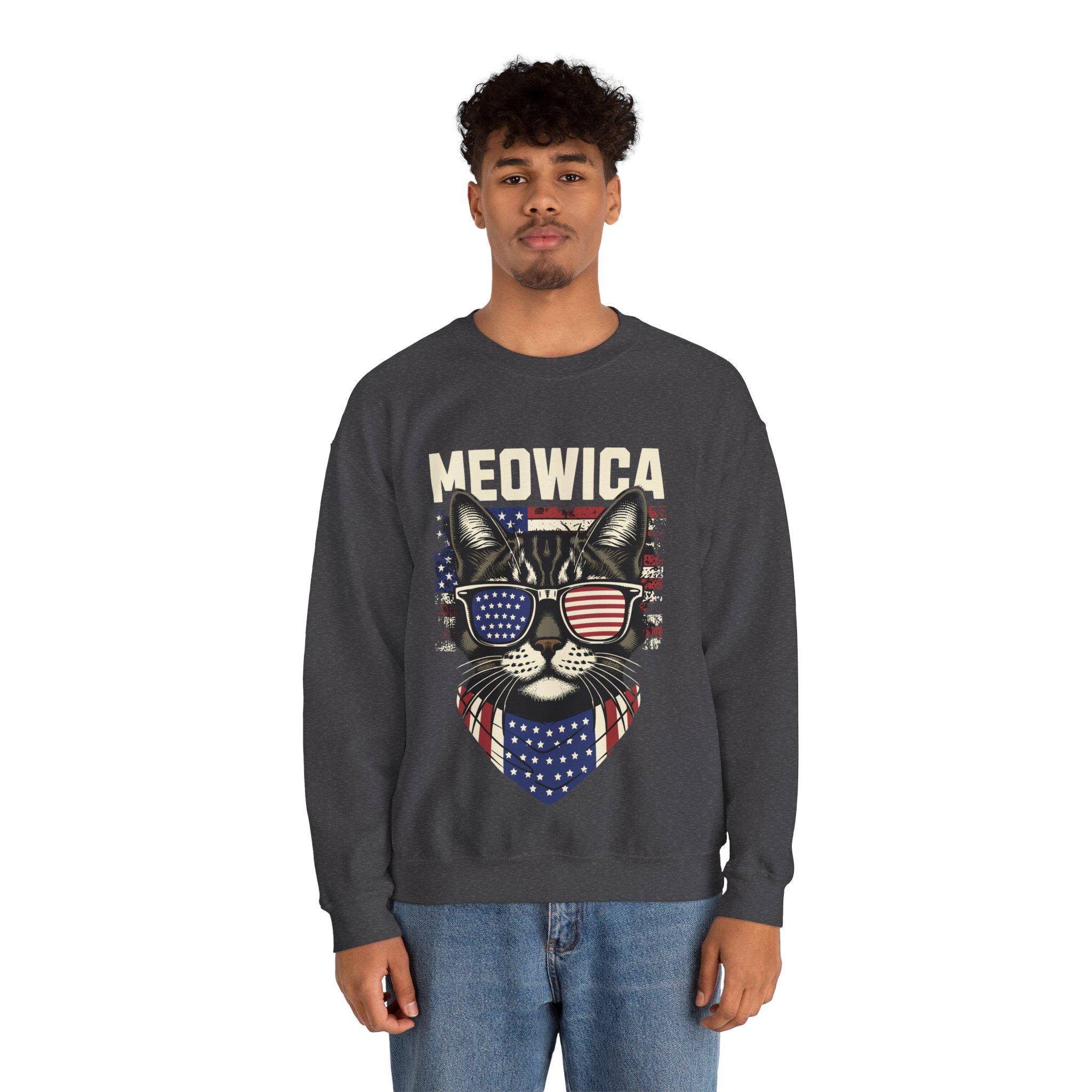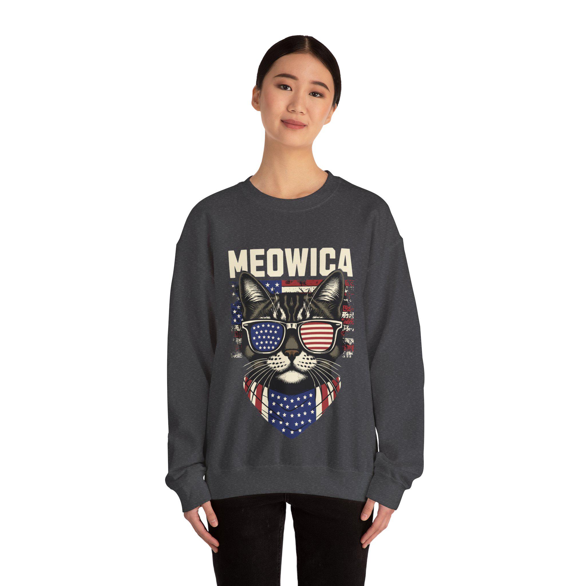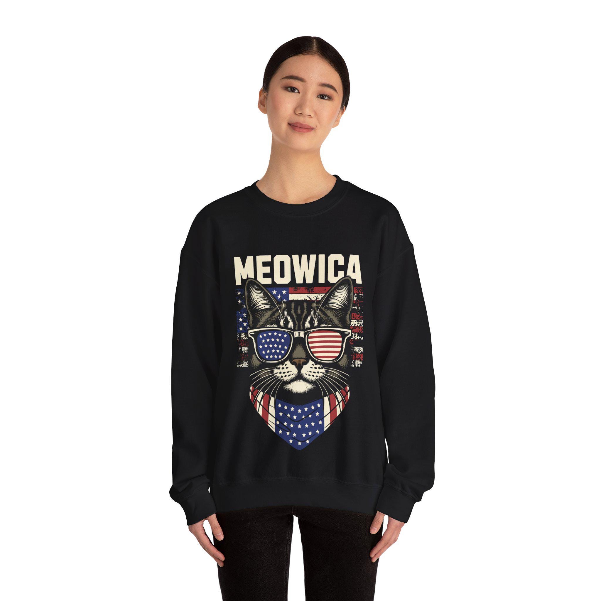 This cozy crewneck brings playful patriotism to everyday wear. A relaxed, classic-fit sweatshirt featuring a bold graphic of a cool cat wearing American flag sunglasses and a stars-and-stripes bandana — vintage tones on a deep black background give it a lived-in, retro vibe. The medium-heavy cotton-poly blend feels substantial and warm without being bulky; thoughtful details like ribbed collar and double-needle stitching keep it looking sharp through repeated wear. Wear it on backyard barbecues, low-key holiday gatherings, or casual city strolls when you want to show a bit of humor and hometown pride.