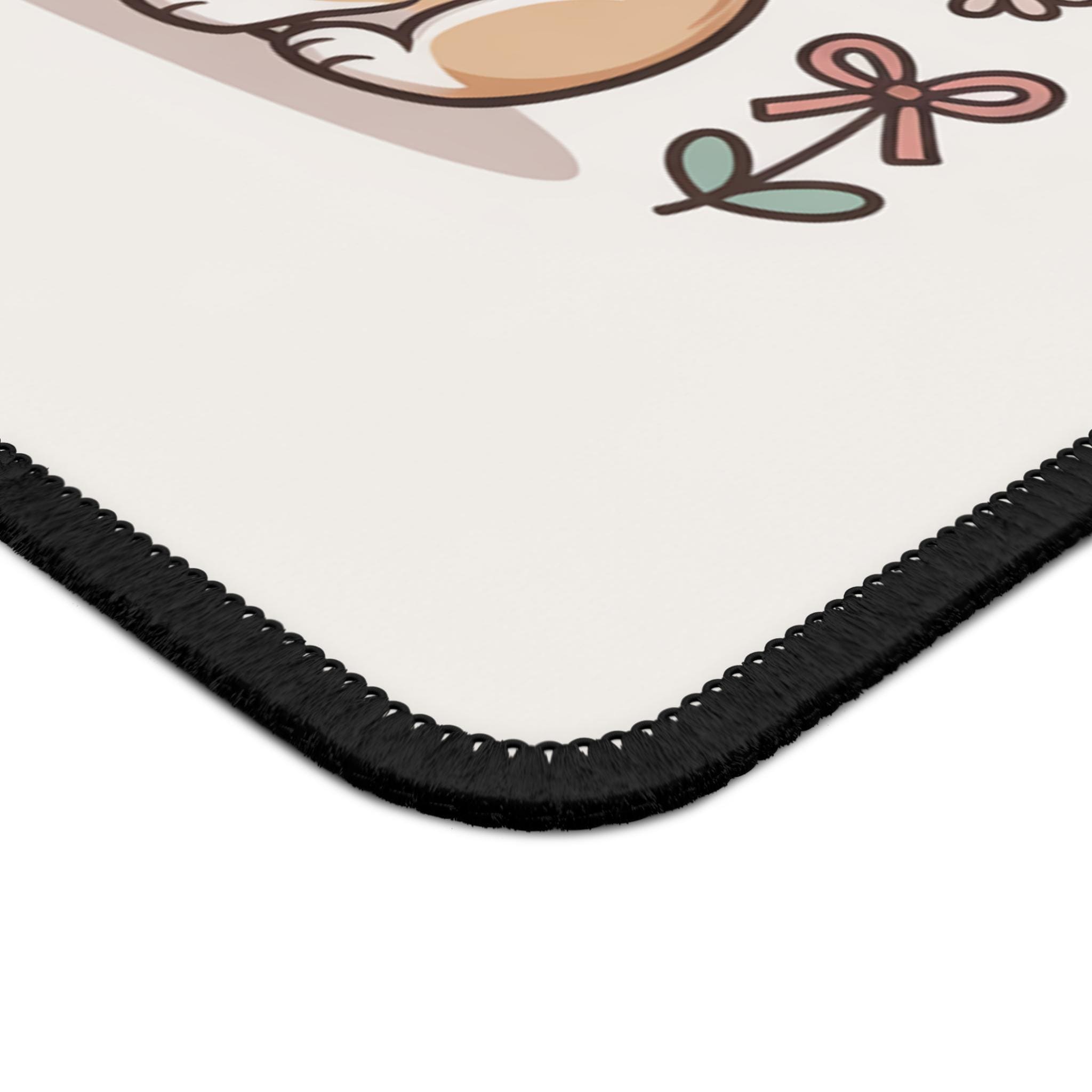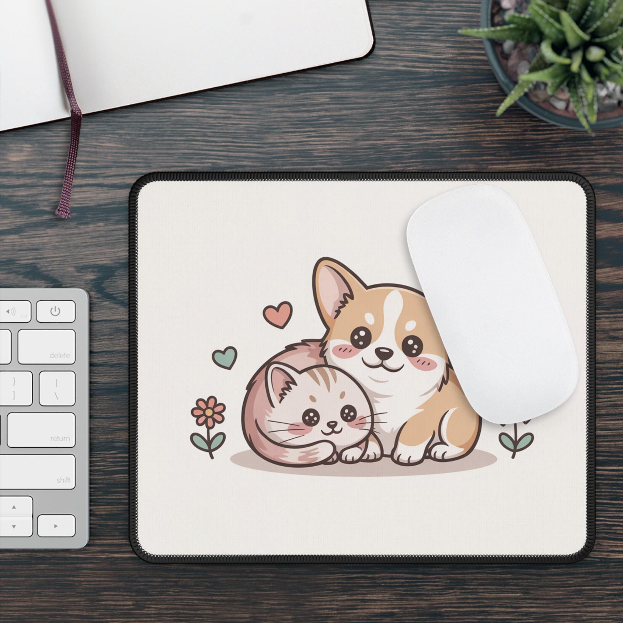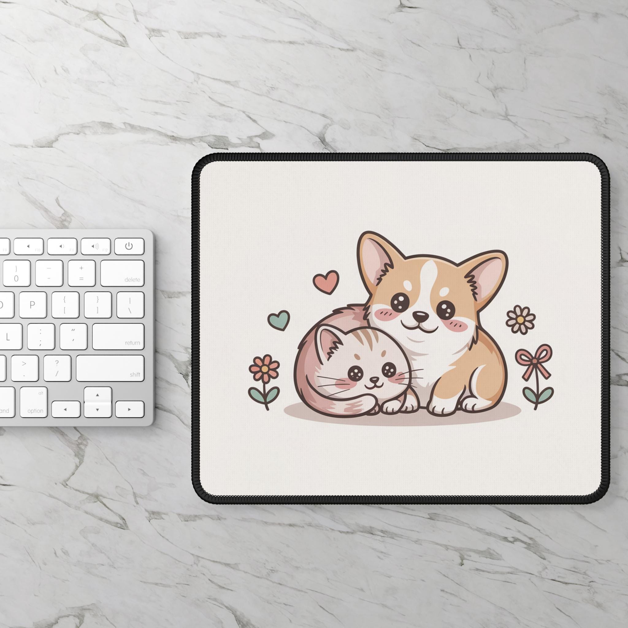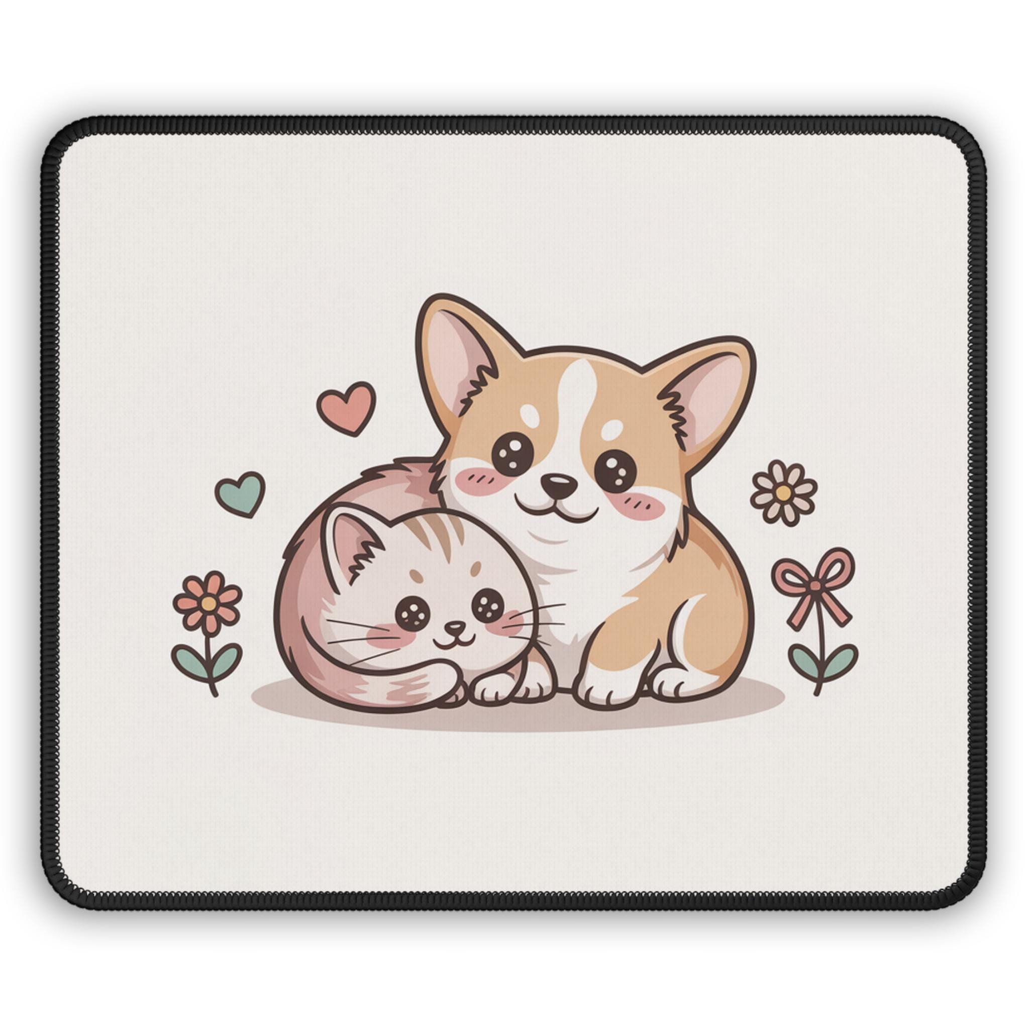 Brighten your desk with a cuddly pair of friends — a cheerful corgi puppy and a curled-up kitten illustrated in soft pastels. The artwork sits on a light background to keep your workspace calm and sweet, while the stitched edges and anti-slip rubber base make this mouse pad both durable and steady during everyday use. Its smooth neoprene surface lets your mouse glide easily, blending function with a touch of gentle charm that makes long work or play sessions feel a little cozier.