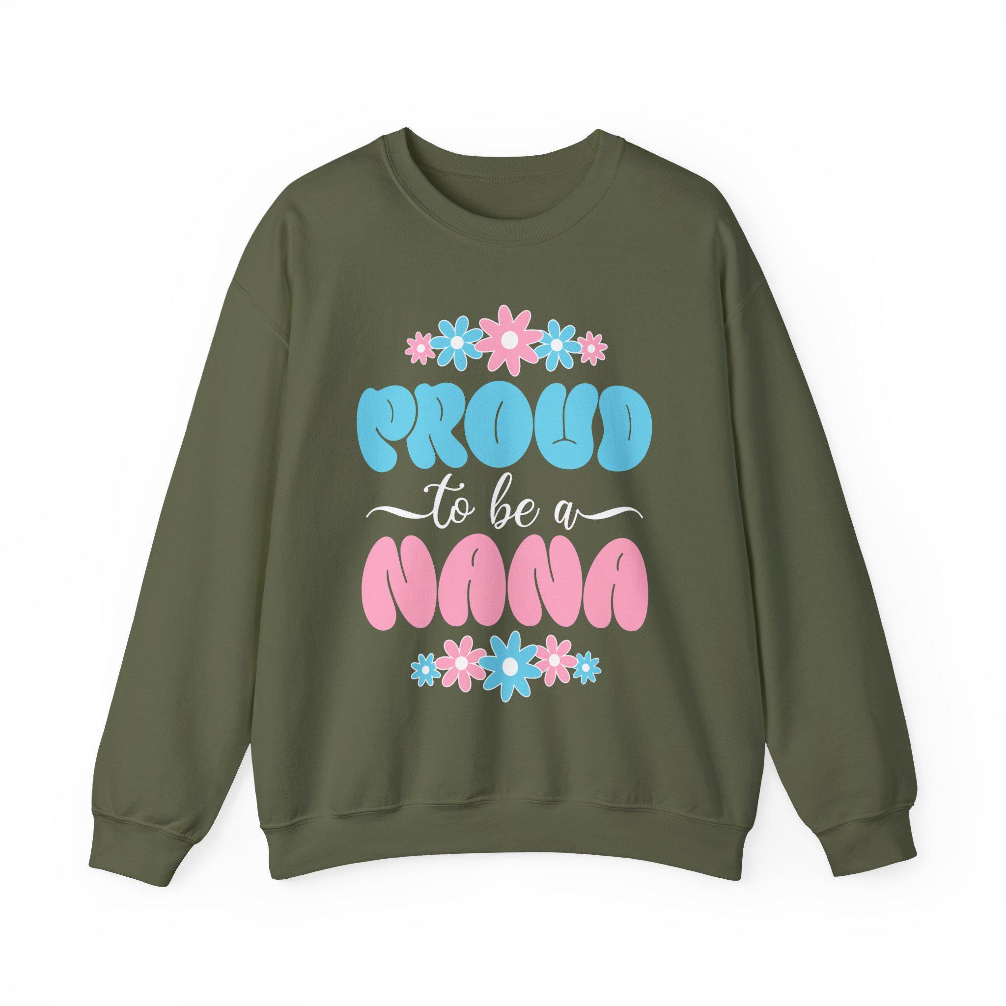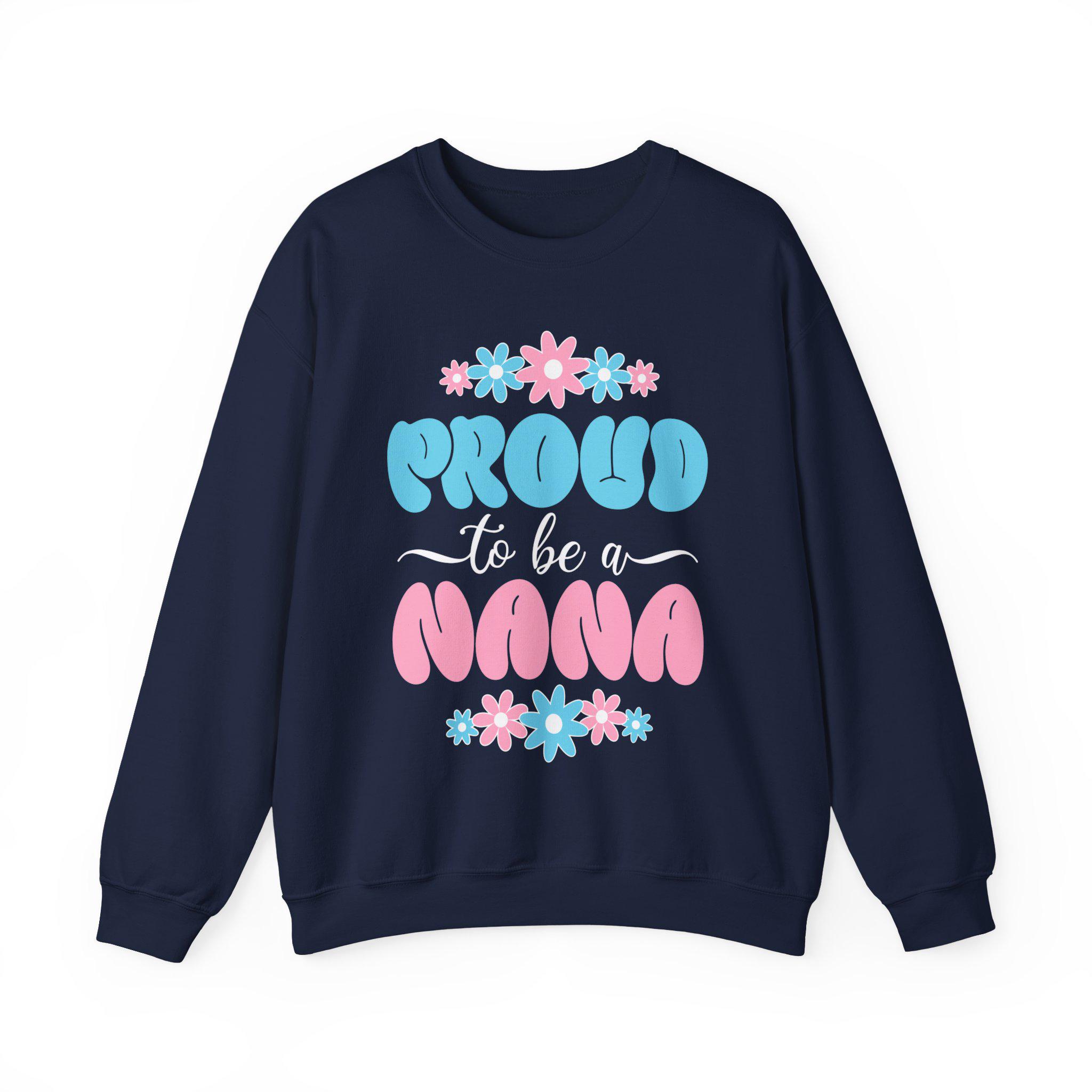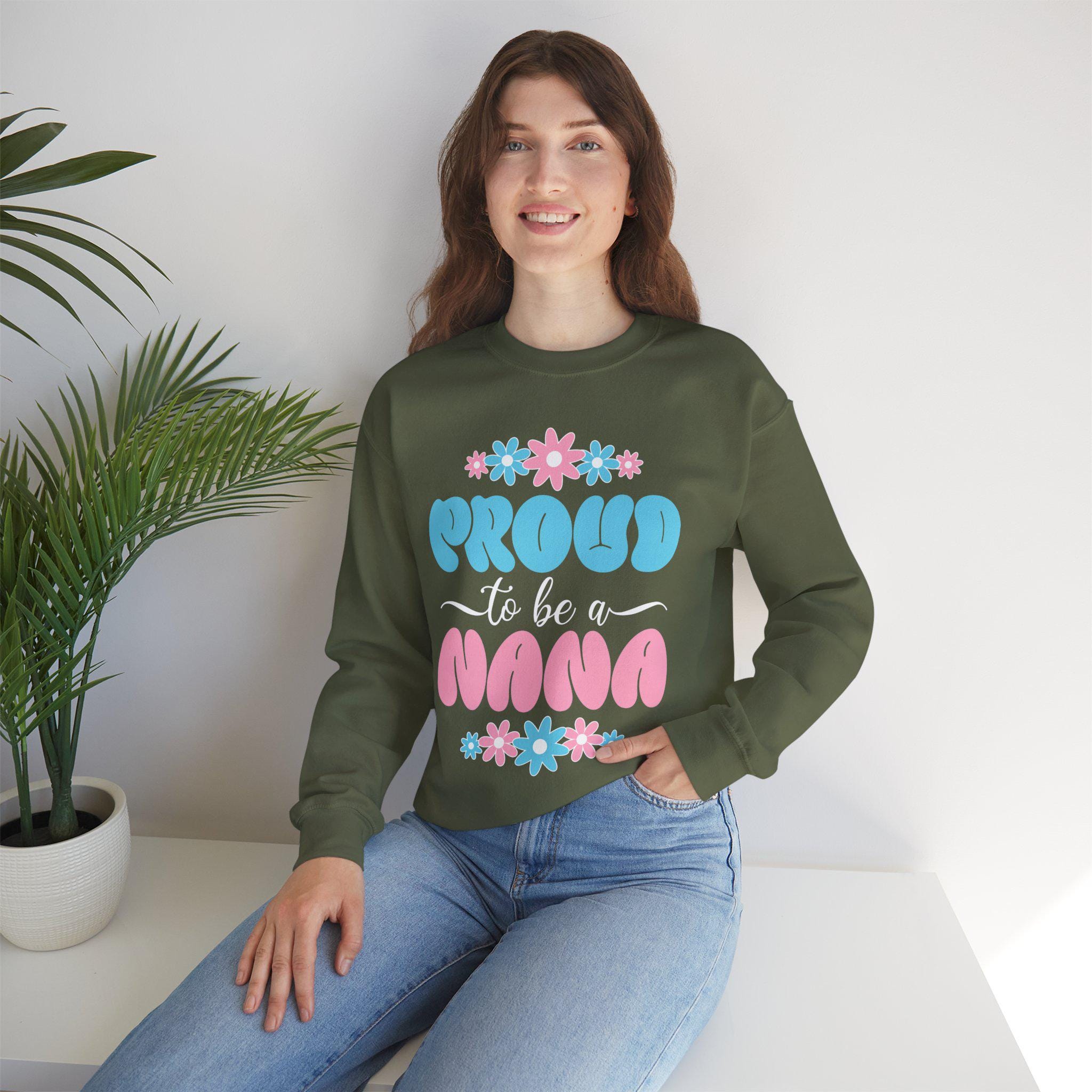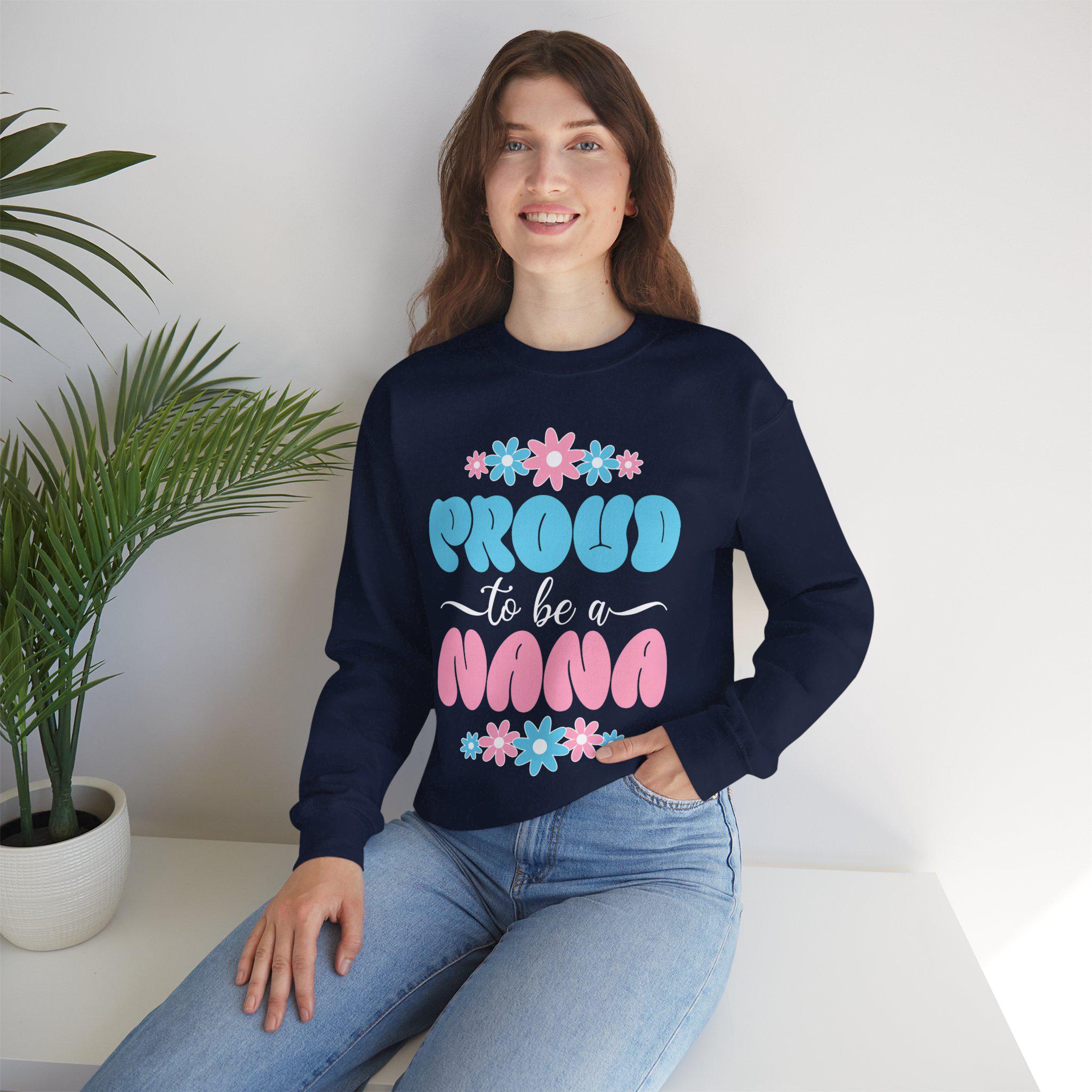 Soft, cozy, and cheerful — this crewneck brings a warm, playful vibe to everyday wear. The bold, bubbly lettering reads “Proud to be a Nana” in pastel pink and blue, framed by simple daisy motifs that feel homespun and lighthearted. Wear it on slow mornings with a mug and slippers, at family gatherings while chasing grandchildren around the yard, or layered over a tee for weekend errands. The relaxed fit and classic crew neckline keep movement easy, while the embroidered/printed details add a personal, crafted touch that feels made-for-memories rather than mass-produced.